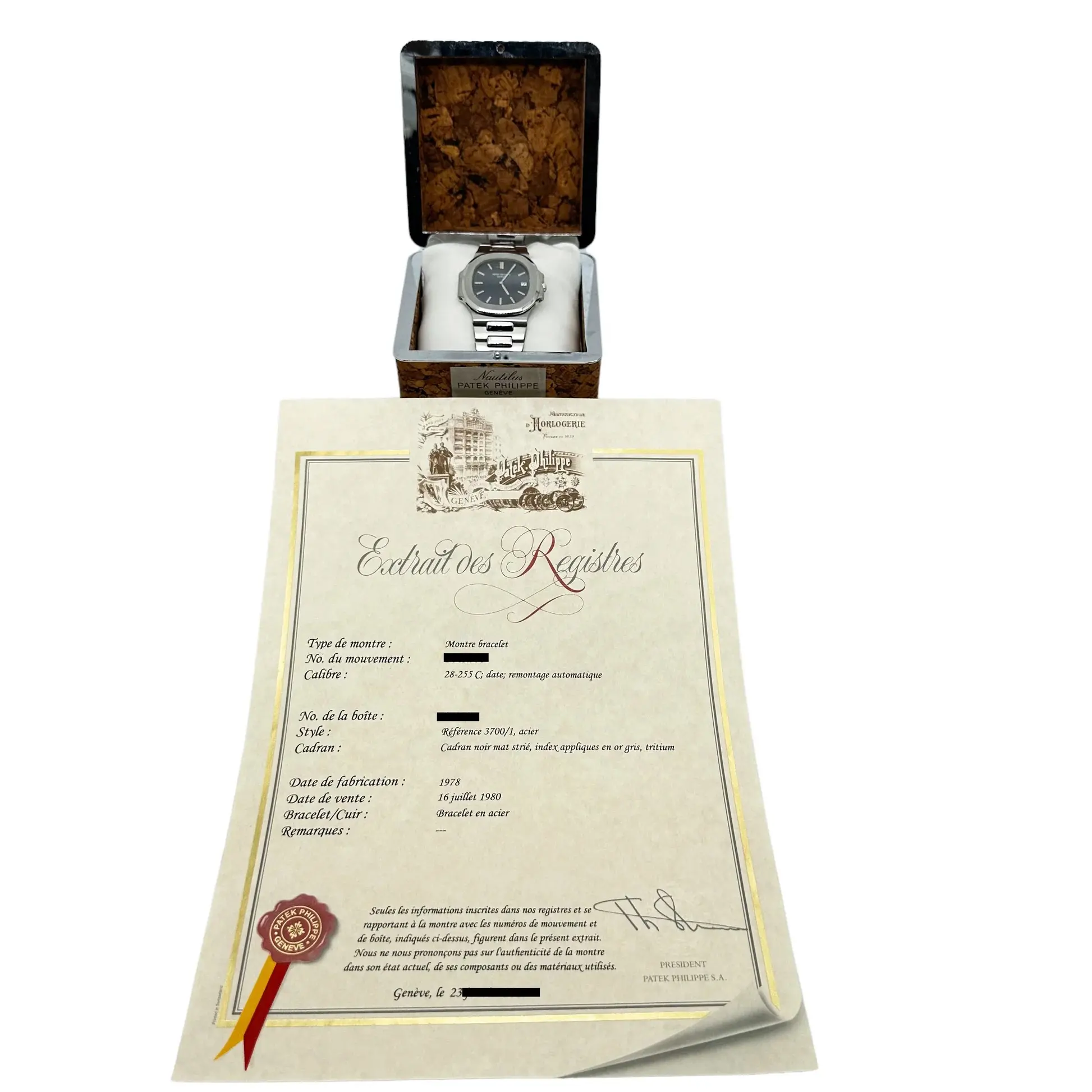 The Patek Philippe 3700/1A was the first Nautilus. It was designed by Gerald Genta and introduced at the Basel fair in 1976. At the time of its introduction, it was one of the most expensive stainless steel watches one could buy. The 3700/1 was available from 1976 to 1982. It was replaced by the 3700/11, which was available from 1982 to 1990. Self-winding movement with date, based on JLC 920 ebauche. A vintage watch is never fully water resistant any longer.