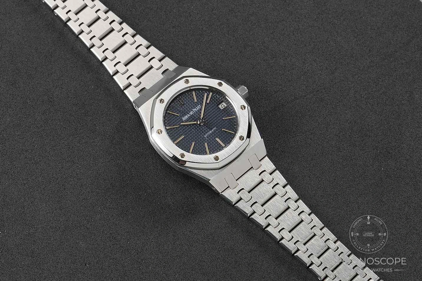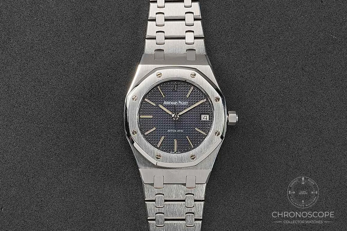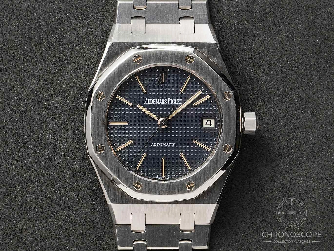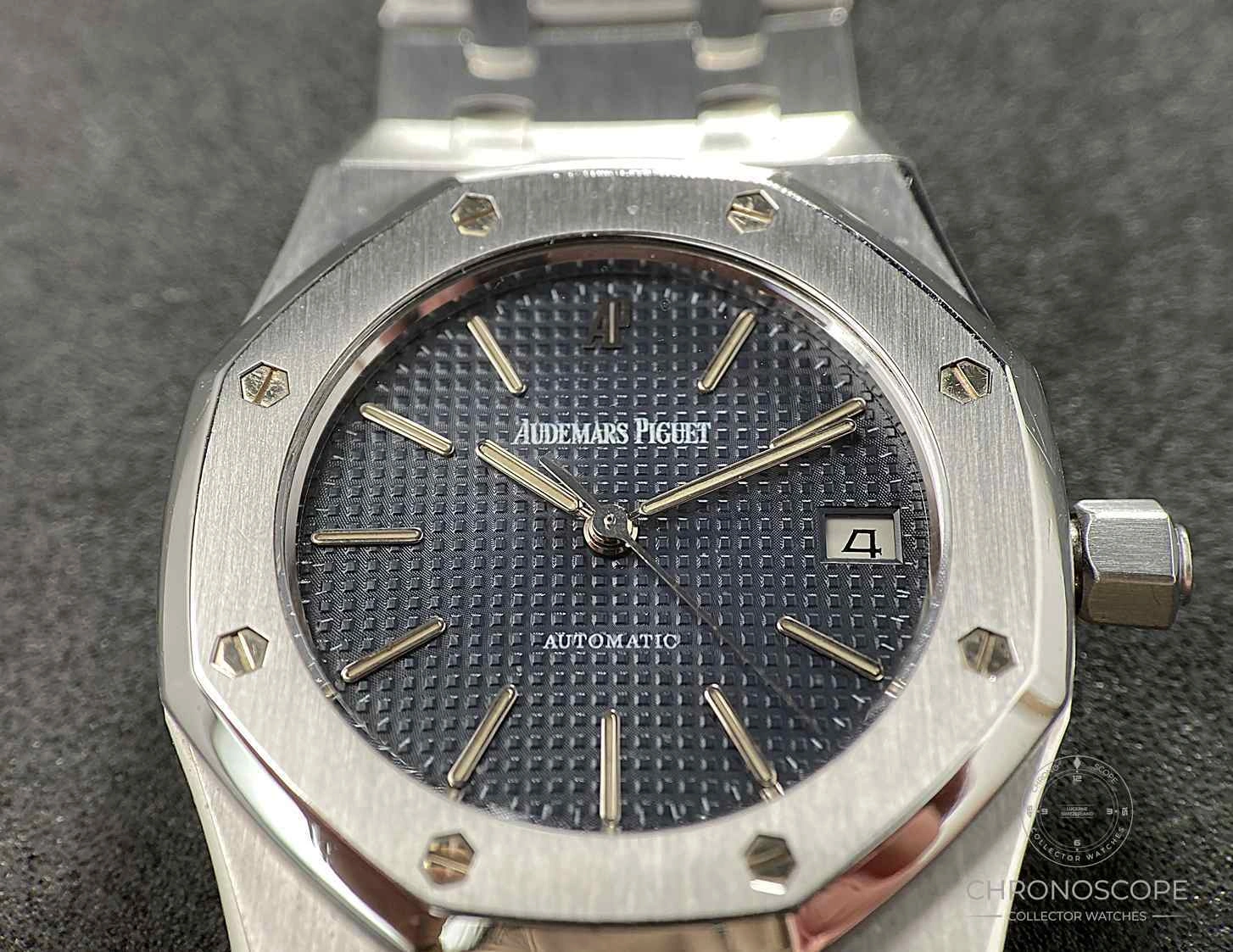 Original presentation box. The case is still razor sharp, and the blue “petite tapisserie” dial is beautifully preserved. Dial, crown, case back, movement, and bracelet signed AP.