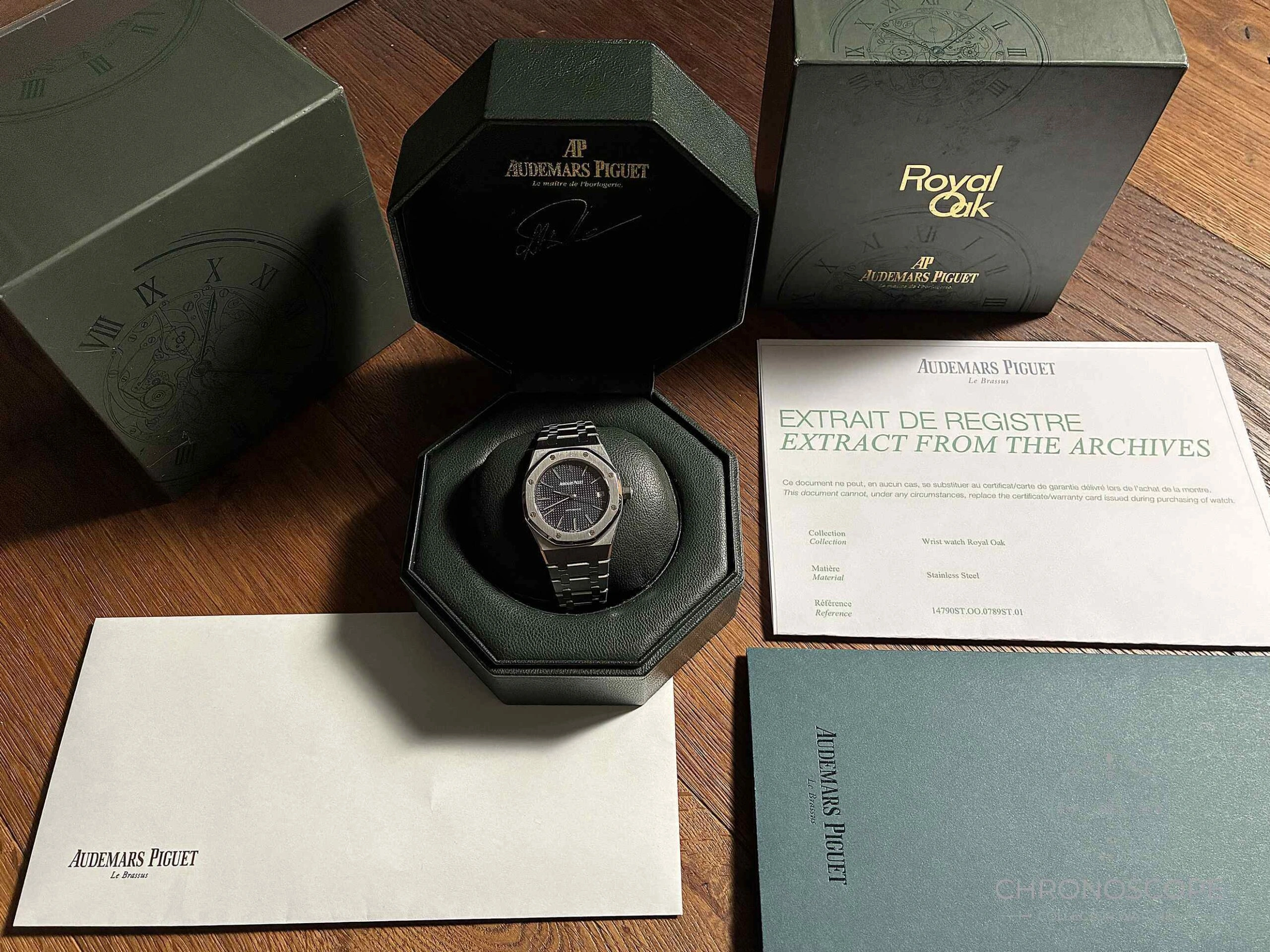 The Royal Oak has been serviced in 2025 and comes with an extract of archives as well as a 12-month warranty.