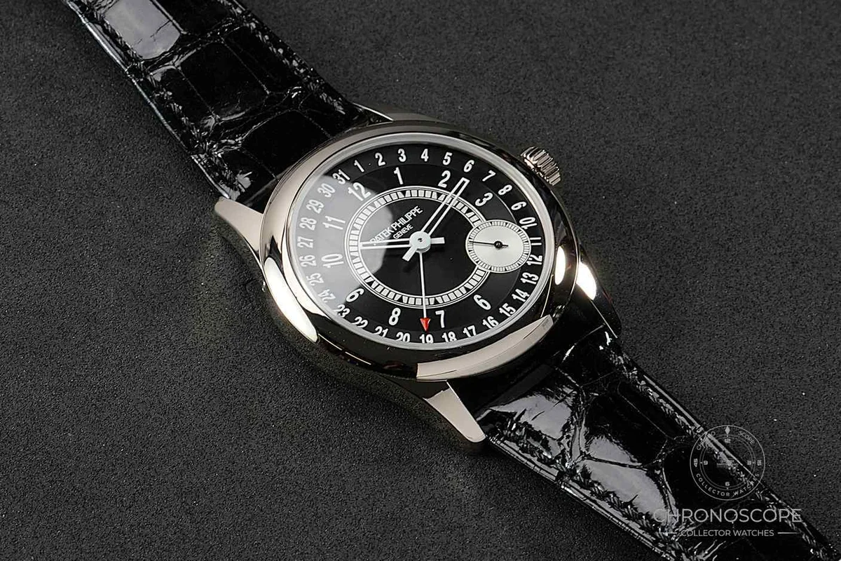 The Patek Calatrava 6000 was introduced in 2008 and sports a dial with a remarkable off center small seconds scale. Although by all means a traditional men's dress watch, it has a very contemporary and sporty feel. The 6006 is its successor, with the case being enlarged from 37 to 39mm. Reference 6006G-001 has a white gold case and an ebony black dial.