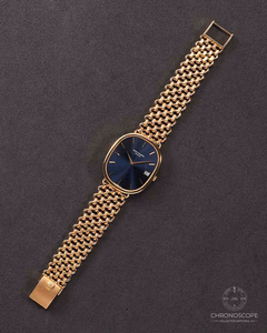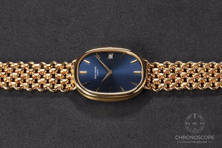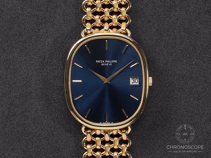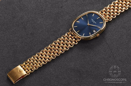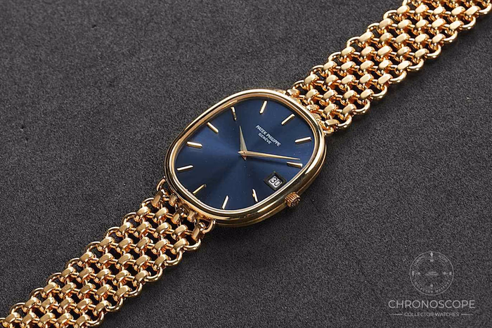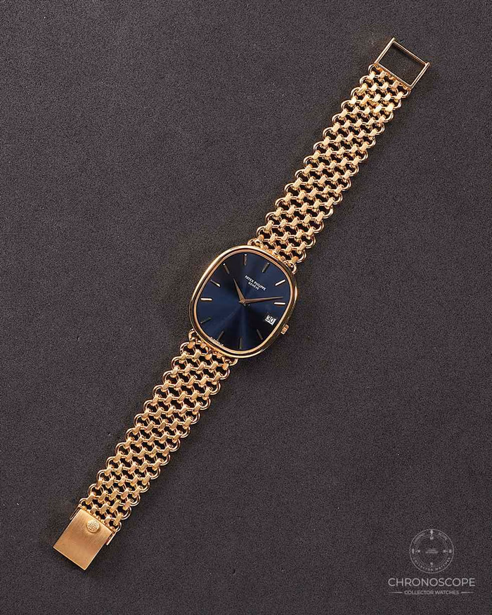 Patek Philippe Jumbo Ellipse ref. 3605/1. Crafted in 18k yellow gold, the distinctive elliptical case boasts a modern proportion, measuring 32x38mm.