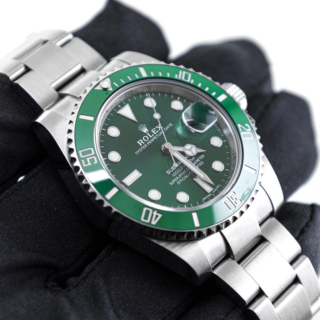 Introduced at BaselWorld 2010, the Rolex Submariner Date 116610lv-0002 extends the green theme of the 2003 16610LV to the dial, earning this watch the nickname 'Hulk'. The stainless steel case of 40mm is fitted with a ceramic bezel inlay.
