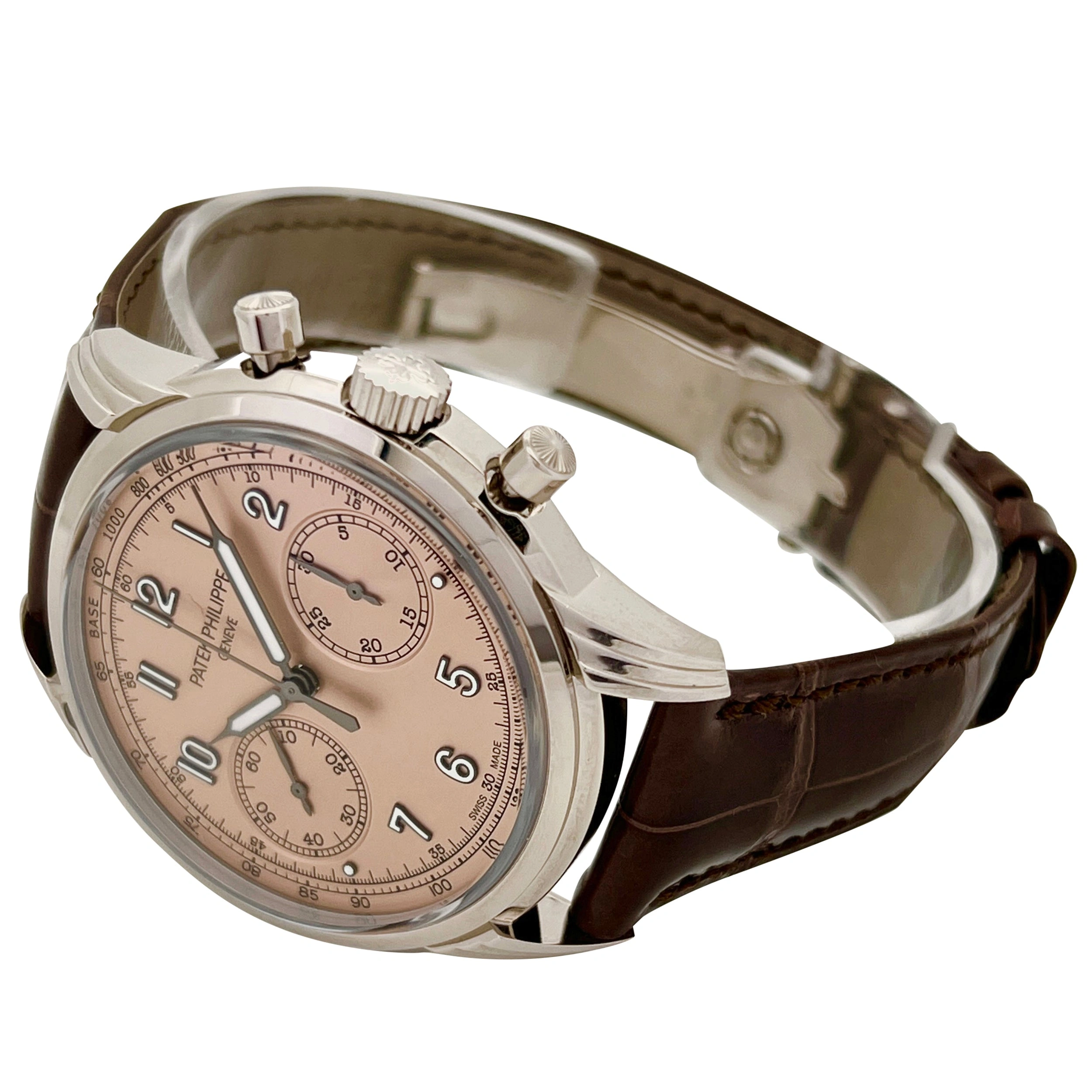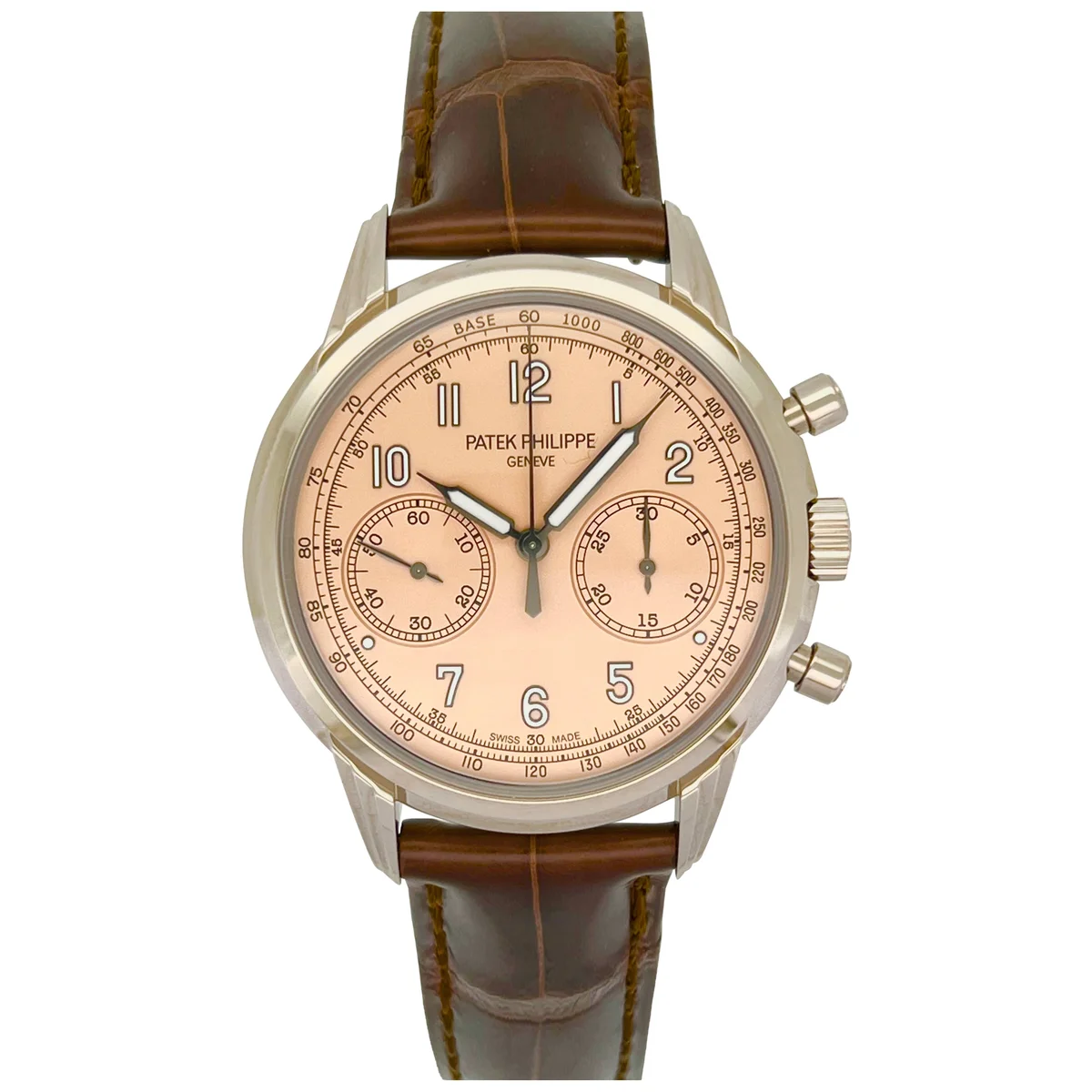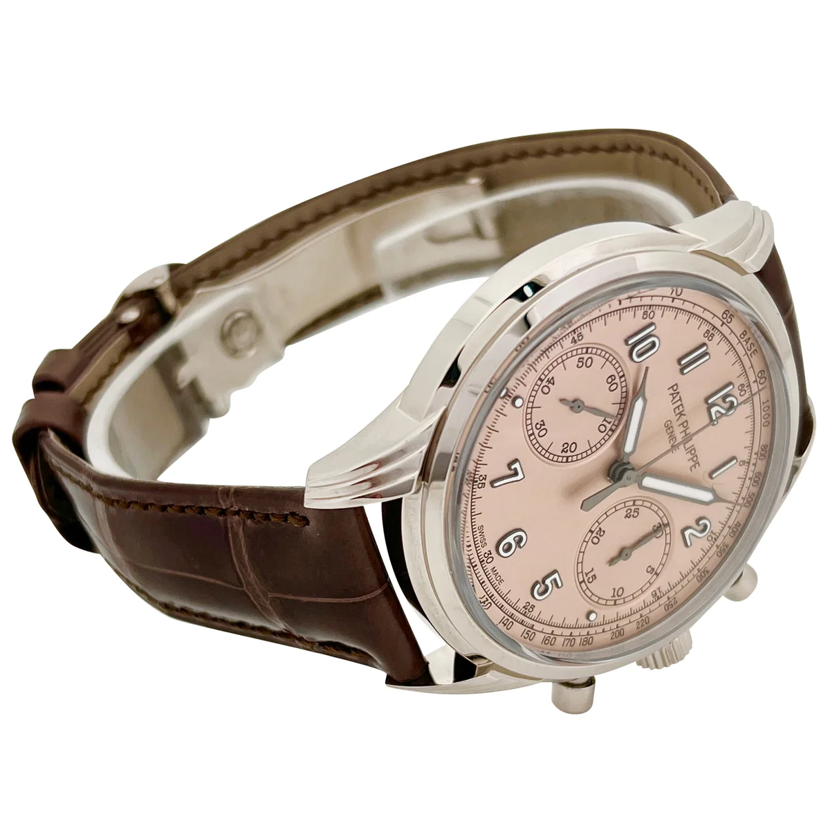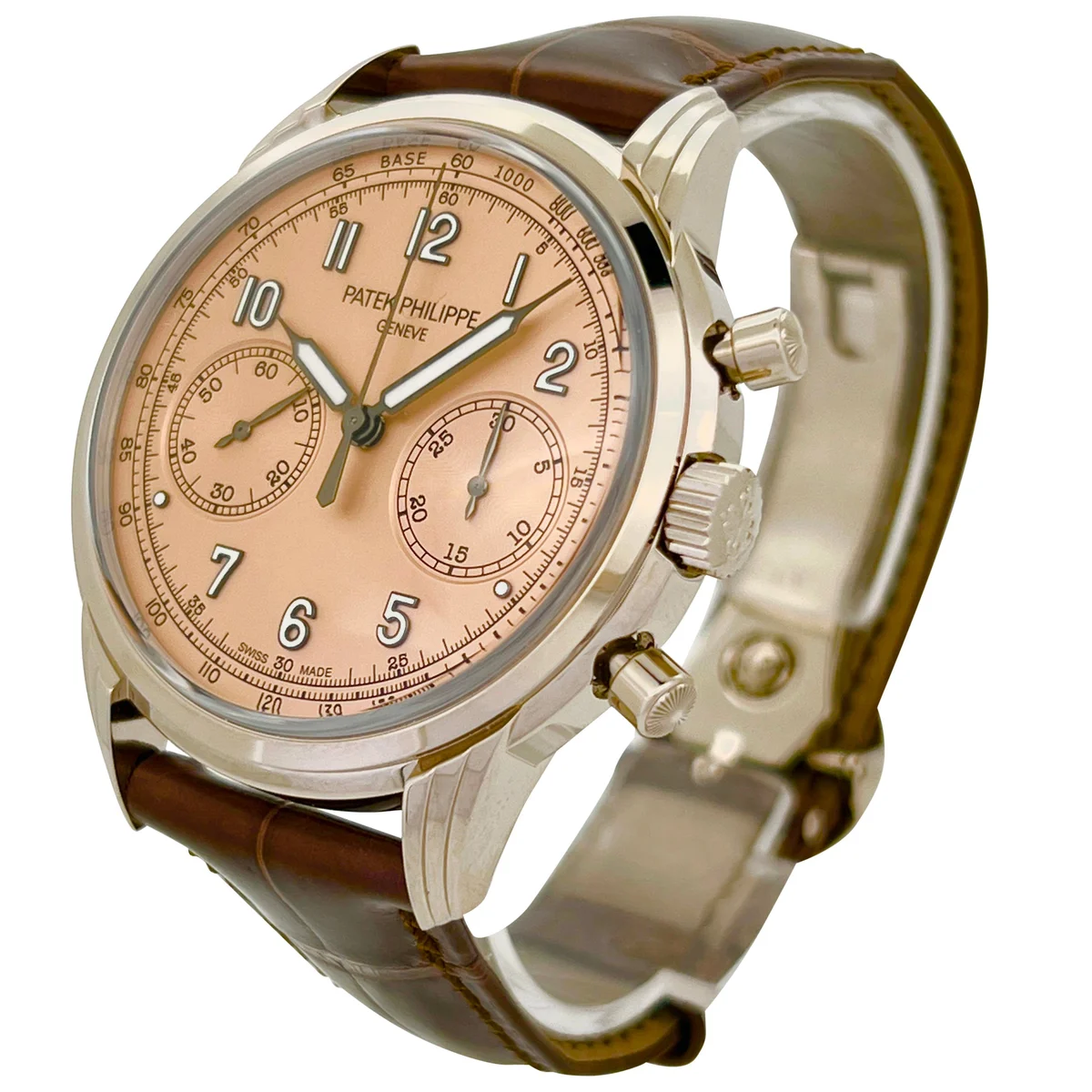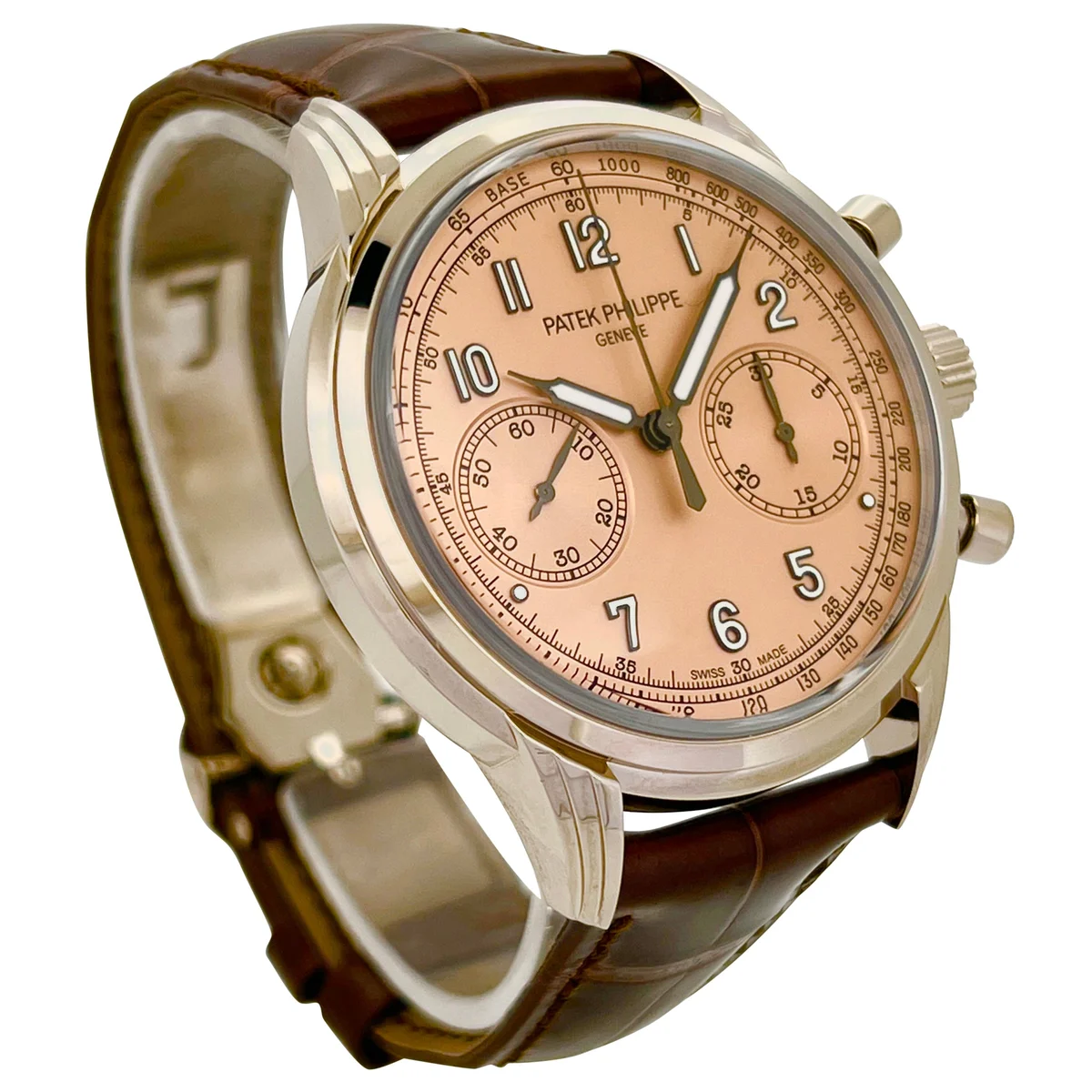 The Patek Philippe Chronograph 5172G-010 was launched in 2022. It sports a new white gold case with round guilloched pushers and three-tier lugs. Its subtle vintage allure is underscored by a sapphire-crystal “box” glass. The dial is Rose. Patek Philippe has reinforced the vintage spirit of its classic men's chronograph, a favorite among devotees of fine mechanical watchmaking, with an opaline rose-gilt dial. The manually wound chronograph movement features traditional construction (column wheel, horizontal clutch) combined with six patented innovations.