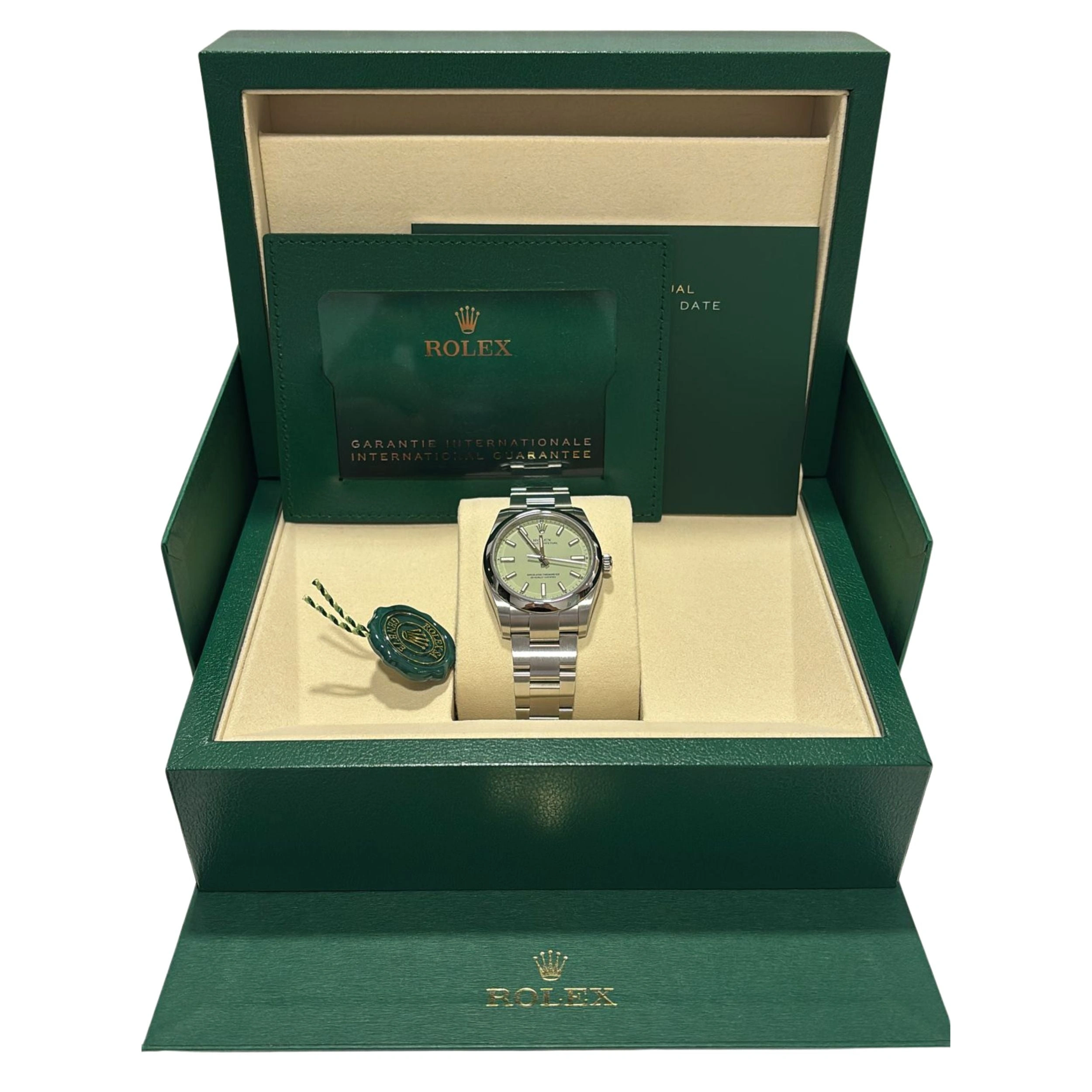 The Rolex Oyster Perpetual 34 reference 124200-0006 was introduced in 2025. This watch has a Stainless Steel case of 34.00mm, which holds the self-winding caliber 2232. The dial is Green.
