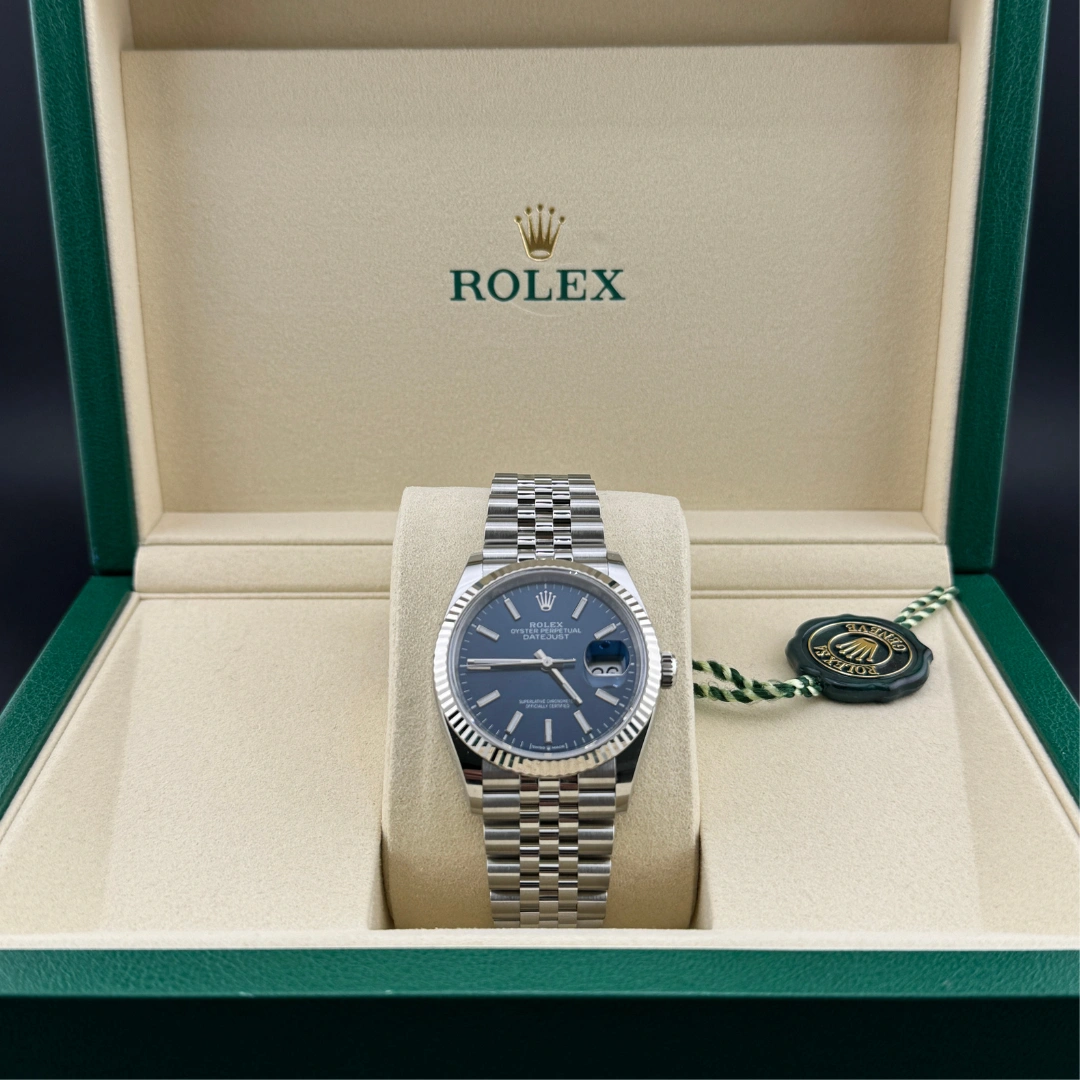 Rolex introduced a new generation of the Datejust 36 at BaselWorld 2018. It features a subtly resigned case paired with a new movement - caliber 3235. Per Rolex tradition, it was first offered in either steel & yellow gold or steel & 'Everose' rose gold, with the stainless steel variations such as the present watch following in 2019. Reference 126234-0017, powered by caliber 3235, has a stainless steel case of 36.00mm. It is crowned by a white gold, fluted bezel. This particular version has a Blue dial, although many different options exist.