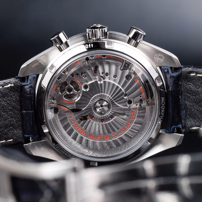 Introduced in anticipation of BaselWorld 2016, the Speedmaster Moonphase Chronograph Master Chronometer is a new model in the Speedmaster family, fitted with a new, in-house, METAS-certified chronograph movement with moonphase complication and date based on caliber 9300. The Speedmaster Moonphase Chronograph Master Chronometer has a stainless steel case of 44.25mm, with a ceramic tachymeter ring and 'box' shaped sapphire crystal. The moonphase disc is done in metalized mineral crystal, allowing Omega to print it with great detail - the moon is said to even show an astronaut's footprint.