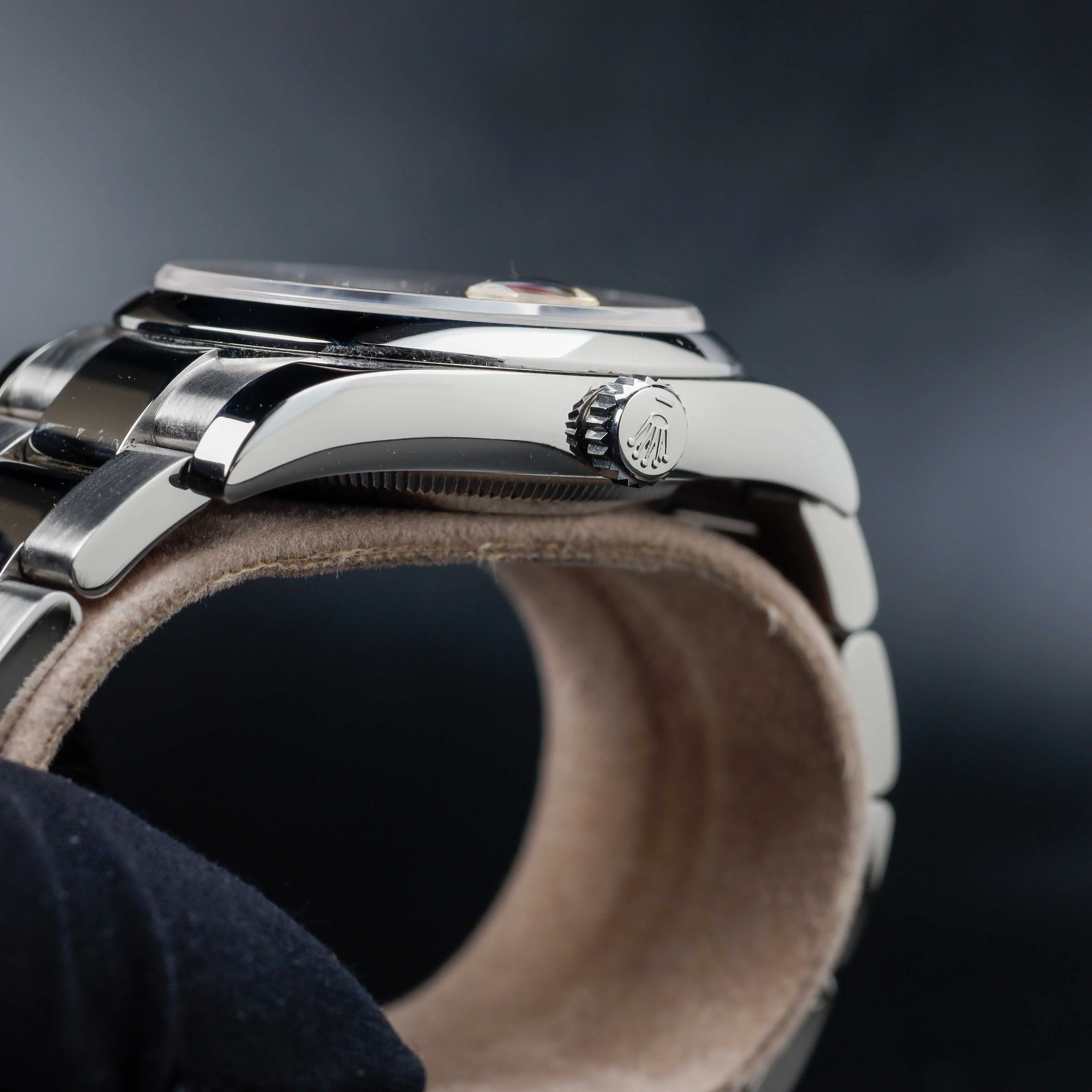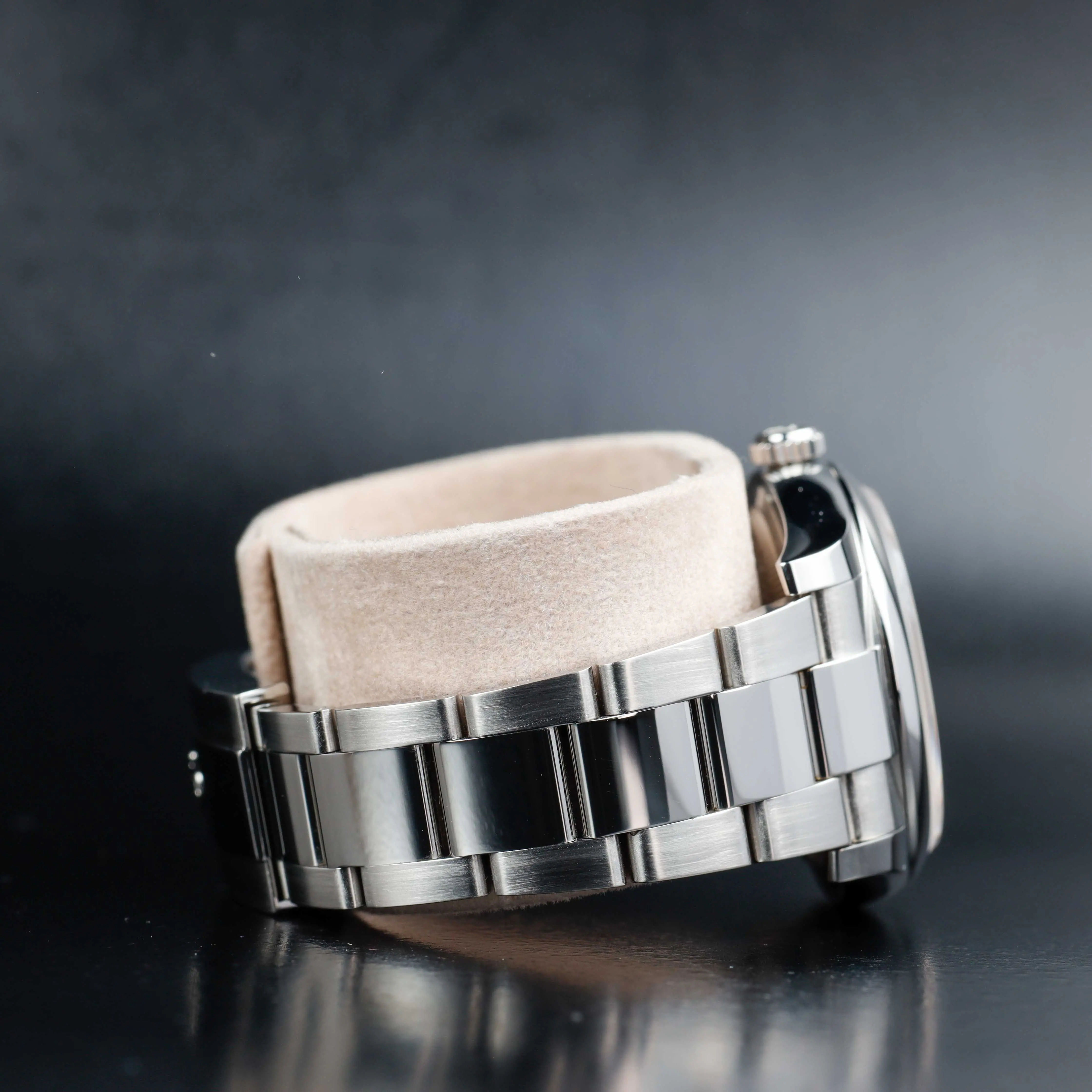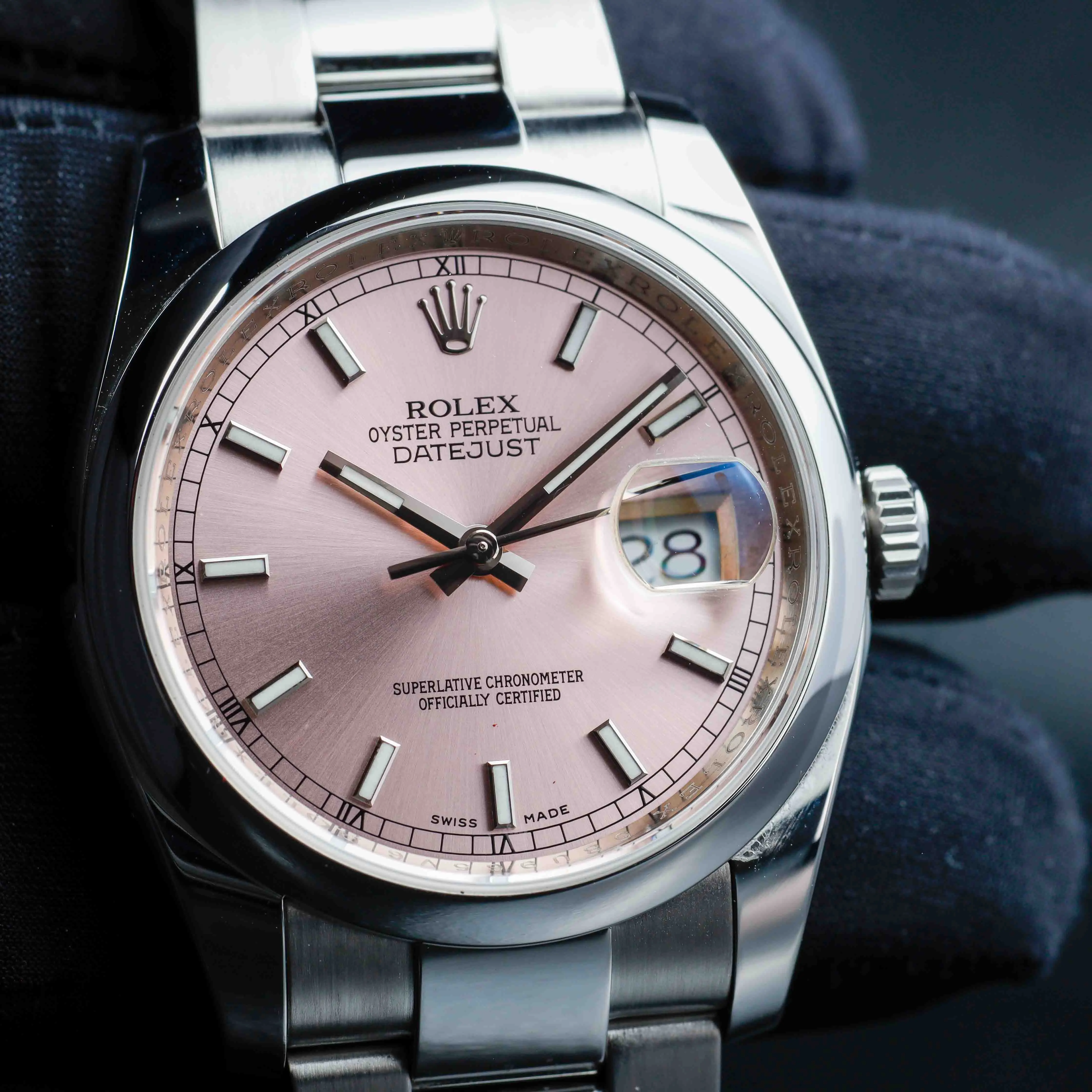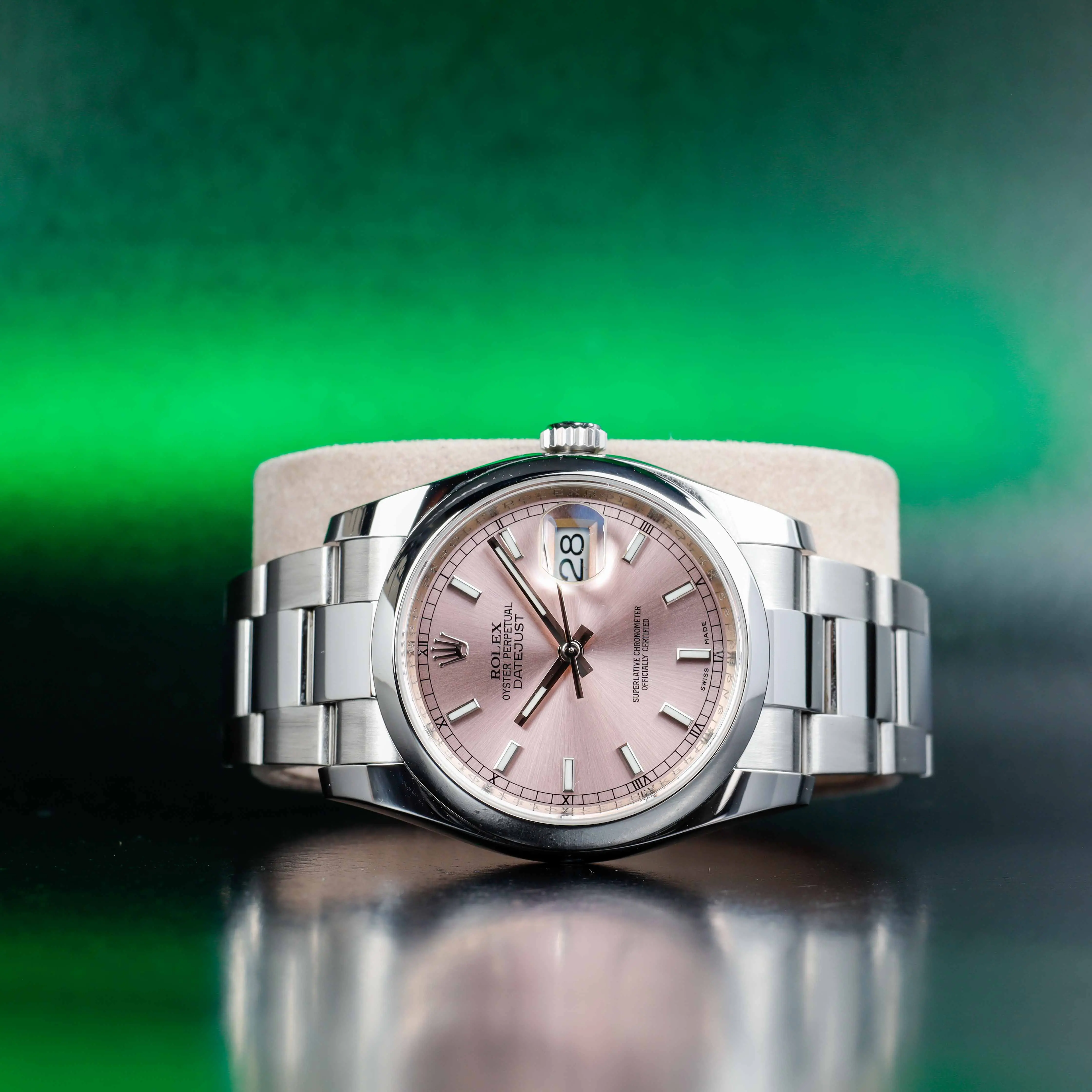 The Rolex Datejust is one of Rolex' undisputed icons. In its current version, its case measures a traditional 36mm. It is available in a great number of configurations, ranging from low-key all-stainless steel versions to full gold and diamond-set models. Reference 116200-0079 has a Stainless Steel with a domed Stainless Steel bezel and a Pink dial.