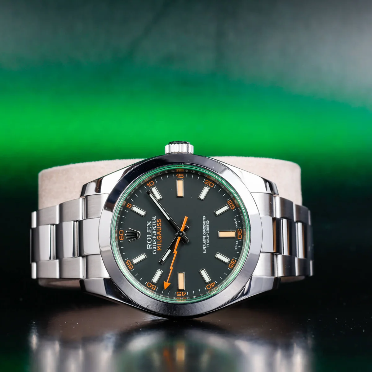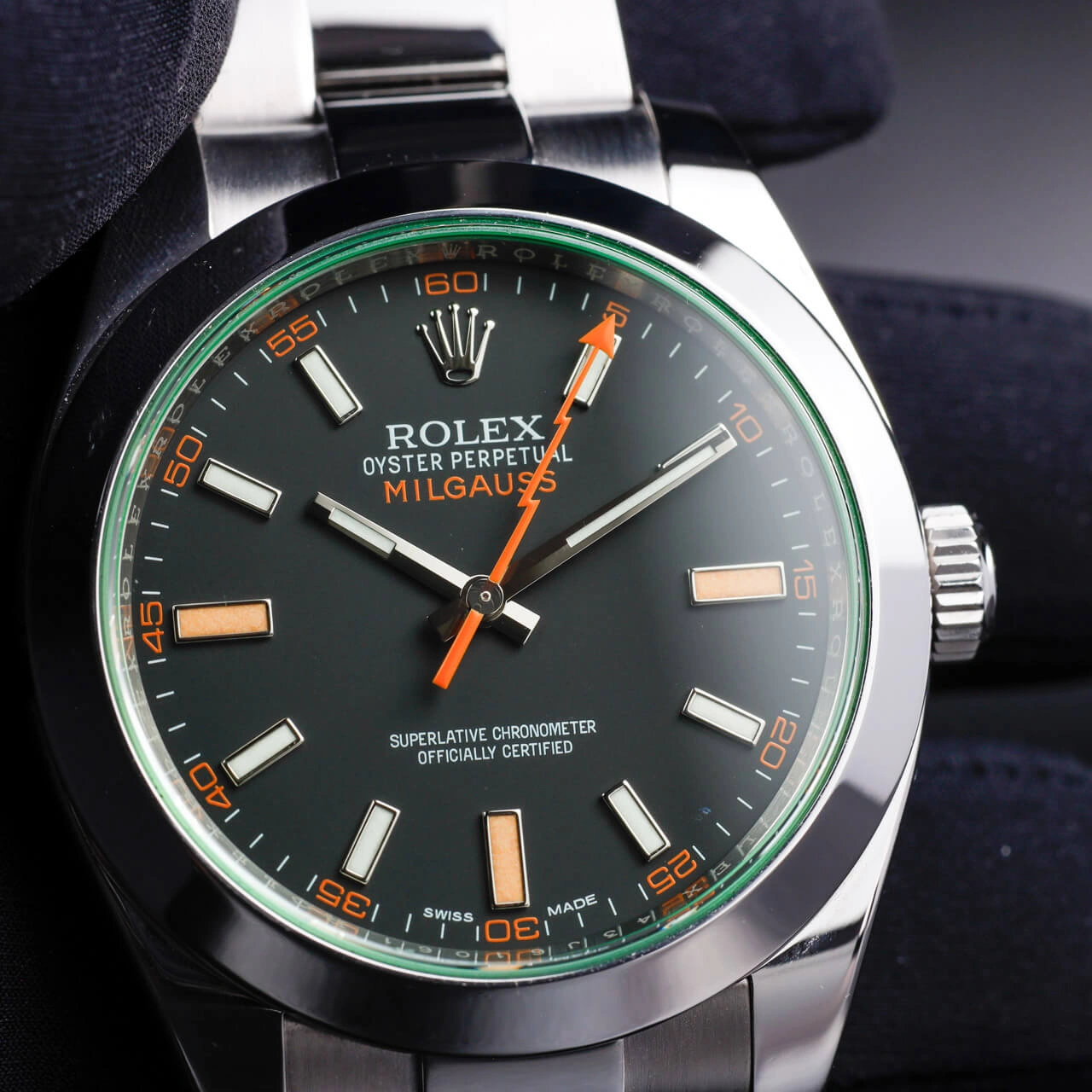 The reliability and precision of an ordinary mechanical watch can be affected by a magnetic field of 50 to 100 gauss. But many scientists are exposed to much higher magnetic fields during the course of their work. Rolex’s solution was the Milgauss, created in 1956, the first watch of its kind. Hence the name of the watch, mille being French for thousand. The reference 116400 was introduced in 2007. The black dial model (non-GV) was discontinued in 2013. The Z-Blue version was added in 2014.
