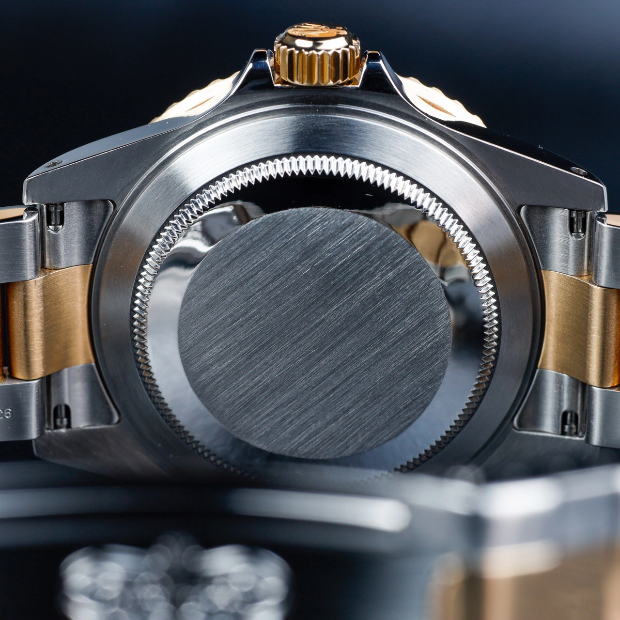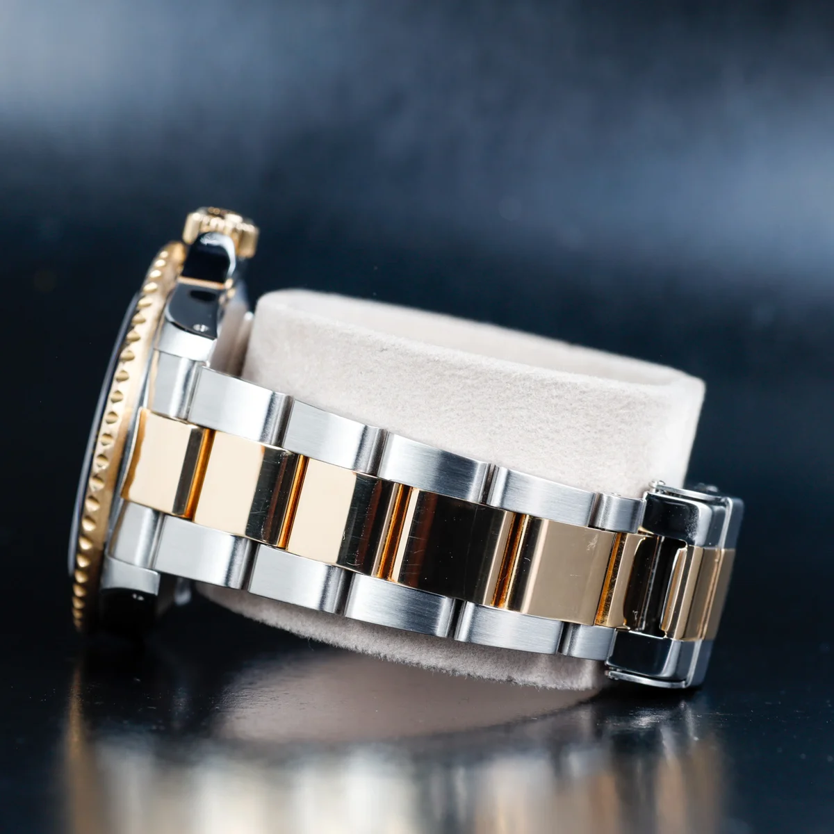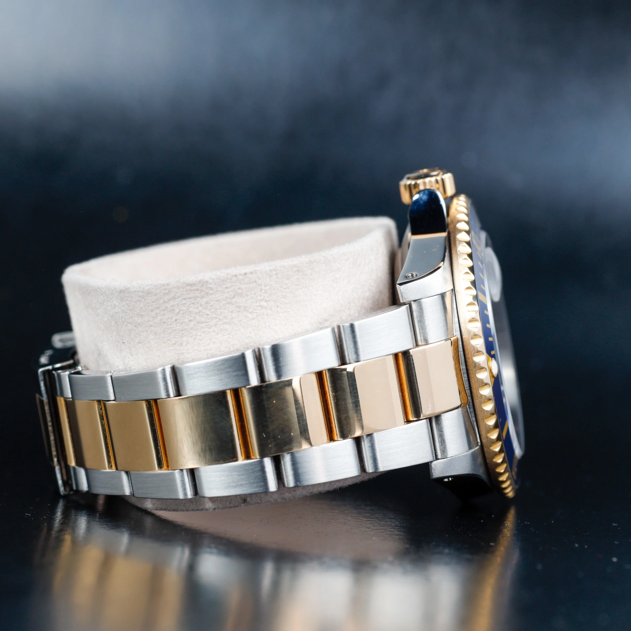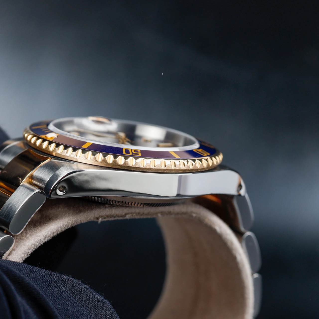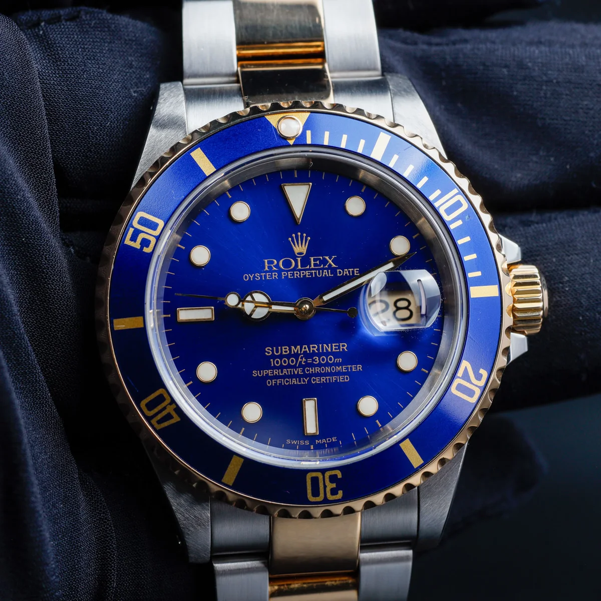 The 16613 is a two-tone version of the famous Submariner. It was available with both blue dial and bezel and a black dial and bezel. Up to approx. '98 tritium was used on the dials ('Swiss-T<25'), after which Luminova ('Swiss') and Superluminova ('Swiss Made') were used to light up the hands and indexes. The version pictured has a blue SuperLuminova dial and matching bezel.