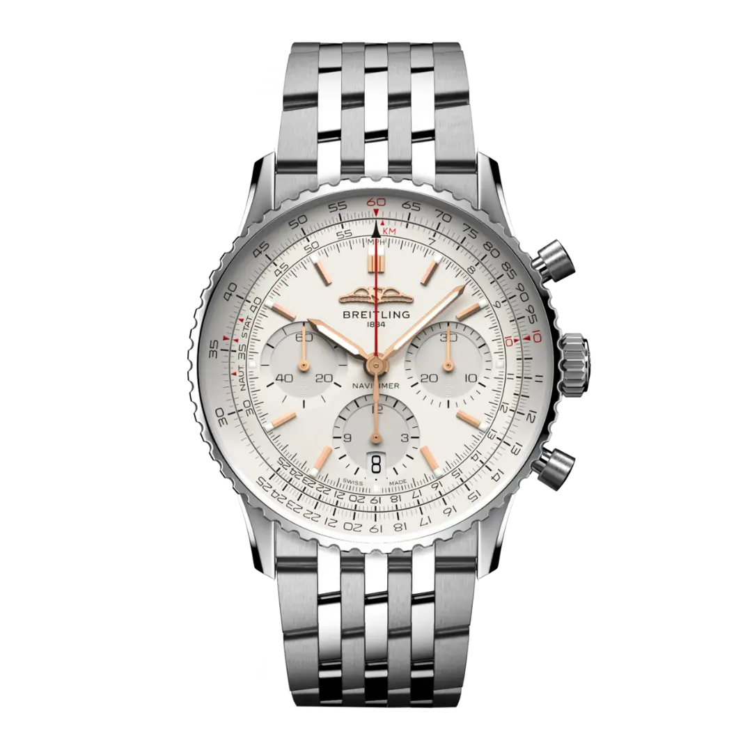 The Breitling Navitimer reference AB0139211G1A1 is part of Breitling's 2022 refresh of the iconic slide rule chronograph. This version has a Stainless Steel case of 41.00mm, which houses the brand's in-house caliber Caliber B01. The dial, with AOPA-inspired wing logo, is mint Silver.