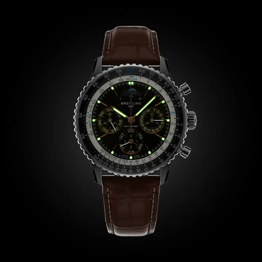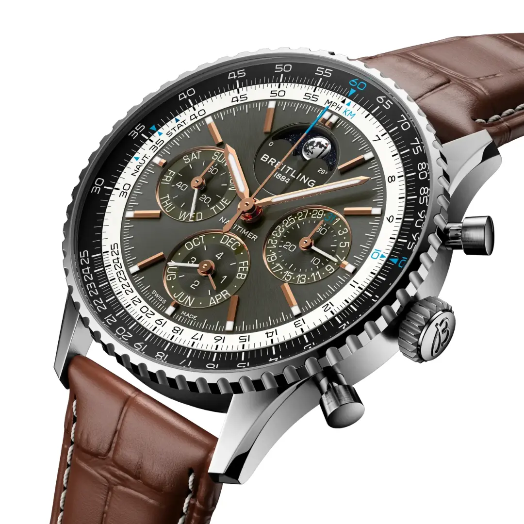 Breitling Navitimer B19 Chronograph 43 Perpetual Calendar Ref. PB1921251B1P1 . The highest expression of a Navitimer. A perpetual calendar caliber is a mechanical movement that knows how many days each month has, even on leap years. Knowing that February has 29 days on a leap year may just be one single day, but the mechanical complexity behind it is hard to overstate. The perpetual calendar Caliber B19 incorporates an additional set of components programmed to know exactly when that extra day happens within the four-year cycle. To make things more complicated the five calendar indications: day, date, month, moonphase, and leap year, all advance instantaneously from December 31 to January 1.
