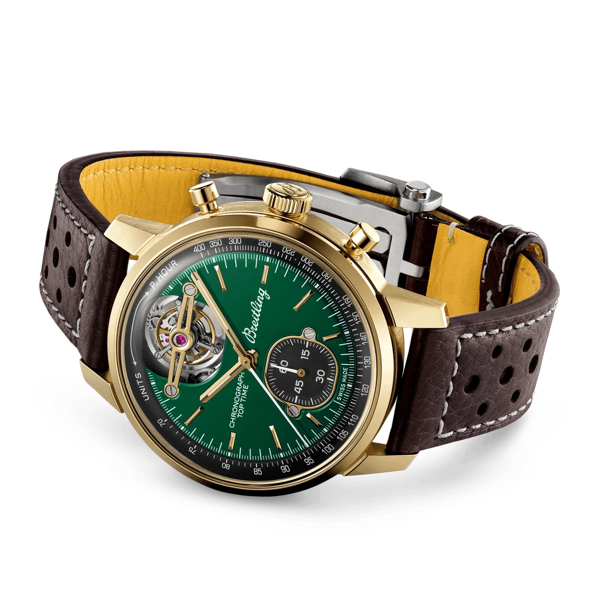 Introduced in 2023, the Breitling Premier Top Time reference NB21251A1L1X1 is part of a 'Capsule' collection of watches paying homage to the world of classic cars. This watch has a bronze & titanium case and a green dial; inside ticks the Caliber B21, a self-winding movement with tourbillon and chronograph.