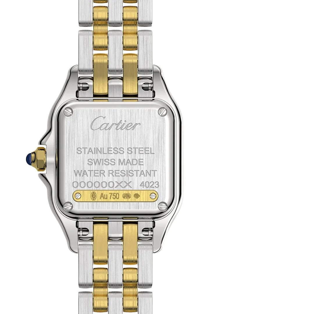 Panthère de Cartier watch, small model, quartz movement. Case in yellow gold 750/1000 and steel, dimensions: 23 mm x 30 mm, thickness: 6 mm, crown set with a synthetic blue spinel, silvered dial, blued-steel sword-shaped hands, bracelet in yellow gold 750/1000 and steel, water-resistant to 3 bar (around 30 meter).