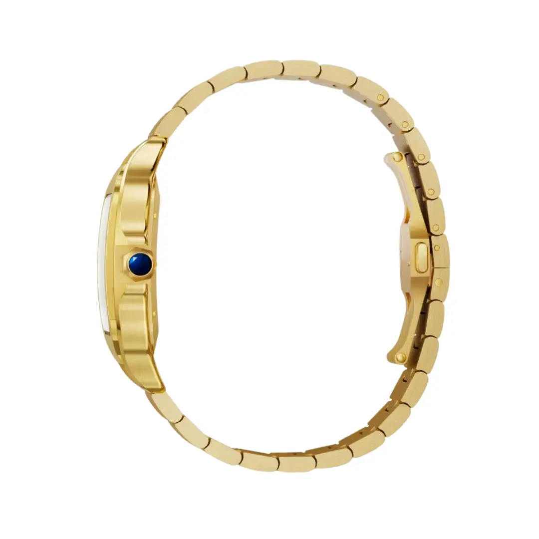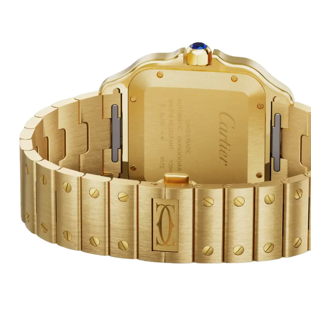 Cartier Santos de Cartier WGSA0095 watch, large model, mechanical movement with automatic winding 1847 MC. 18K yellow gold (750/1000) case, satin-finish gradated gold sunray-brushed dial, gold-plated polished steel sword-shaped hands, sapphire crystal. Yellow gold bracelet with SmartLink adjustment system. Second strap in brown alligator leather, with interchangeable folding gold buckle. Case width: 39.8 mm, thickness: 9.38 mm. Water-resistant to 10 bar (approx. 100 meters)