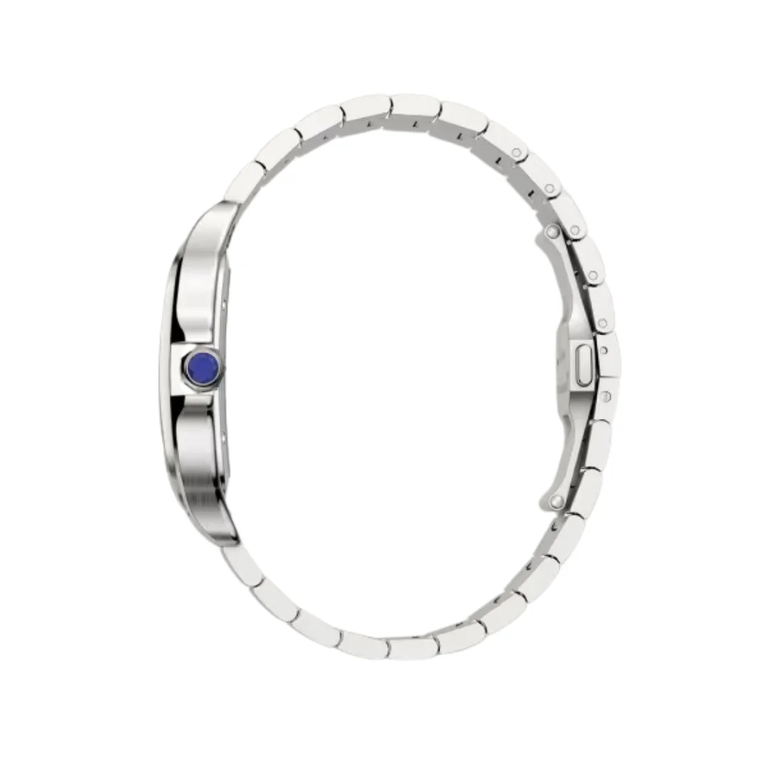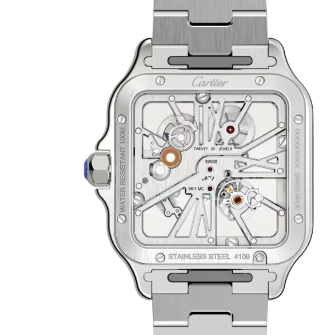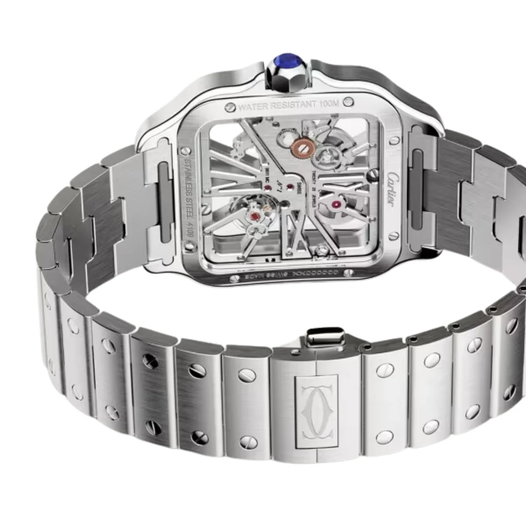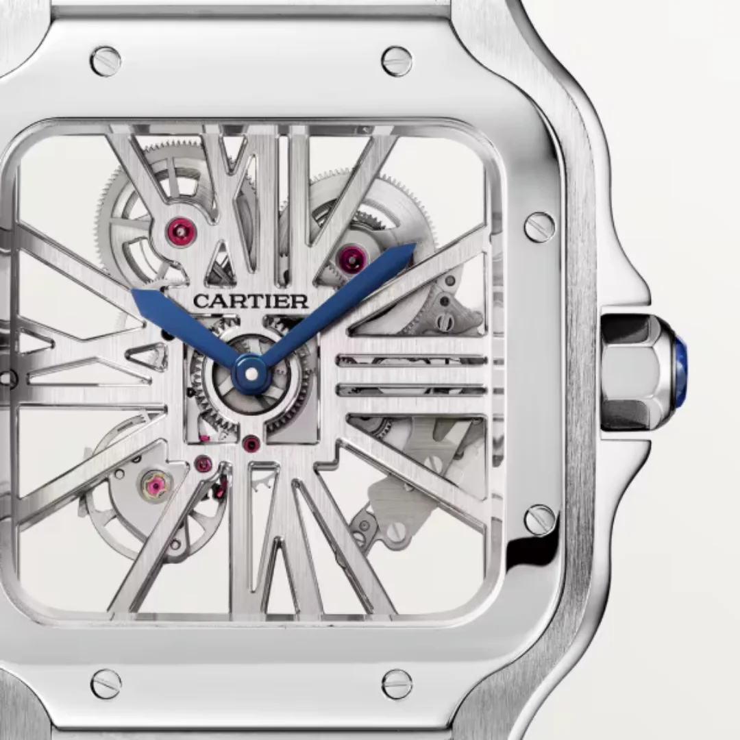 Cartier Santos Skeleton WHSA0015 watch, large model, Manufacture mechanical movement with manual winding, caliber 9611 MC. Steel case, seven-sided crown set with a faceted sapphire, blued-steel sword-shaped hands, sapphire crystal and case back. Hours and minutes with skeletonized bridges forming Roman numerals. Power reserve approx. 72 hours. Case width: 39.8 mm, thickness: 9.08 mm. Water-resistant up to 10 bar (approx. 100 meters/330 feet).