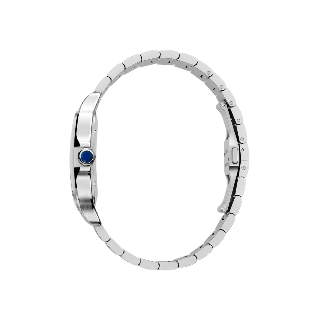 Santos watch, large model, mechanical movement with automatic winding, calibre 1847 MC. Steel case, 7-sided crown set with a faceted synthetic spinel, silvered opaline dial, steel sword-shaped hands, sapphire crystal. Steel bracelet with “SmartLink” adjustment system. Second bracelet in calfskin, with interchangeable steel folding buckle. Both bracelets are fitted with the “QuickSwitch” interchangeability system. Case width: 39.8 mm, thickness: 9.38 mm. Water-resistant to 10 bar (approx. 100 meter).