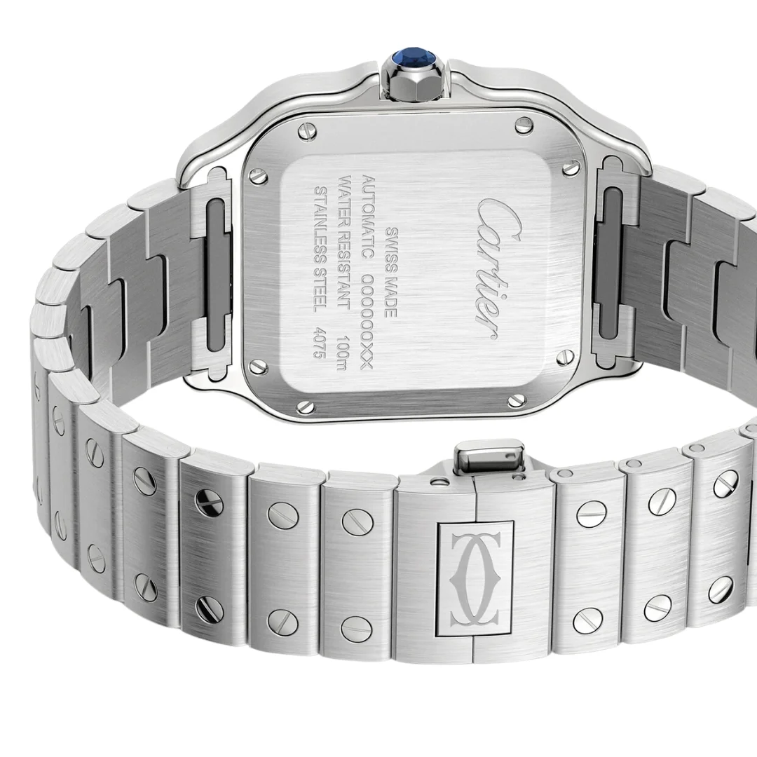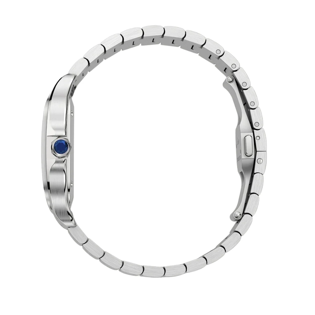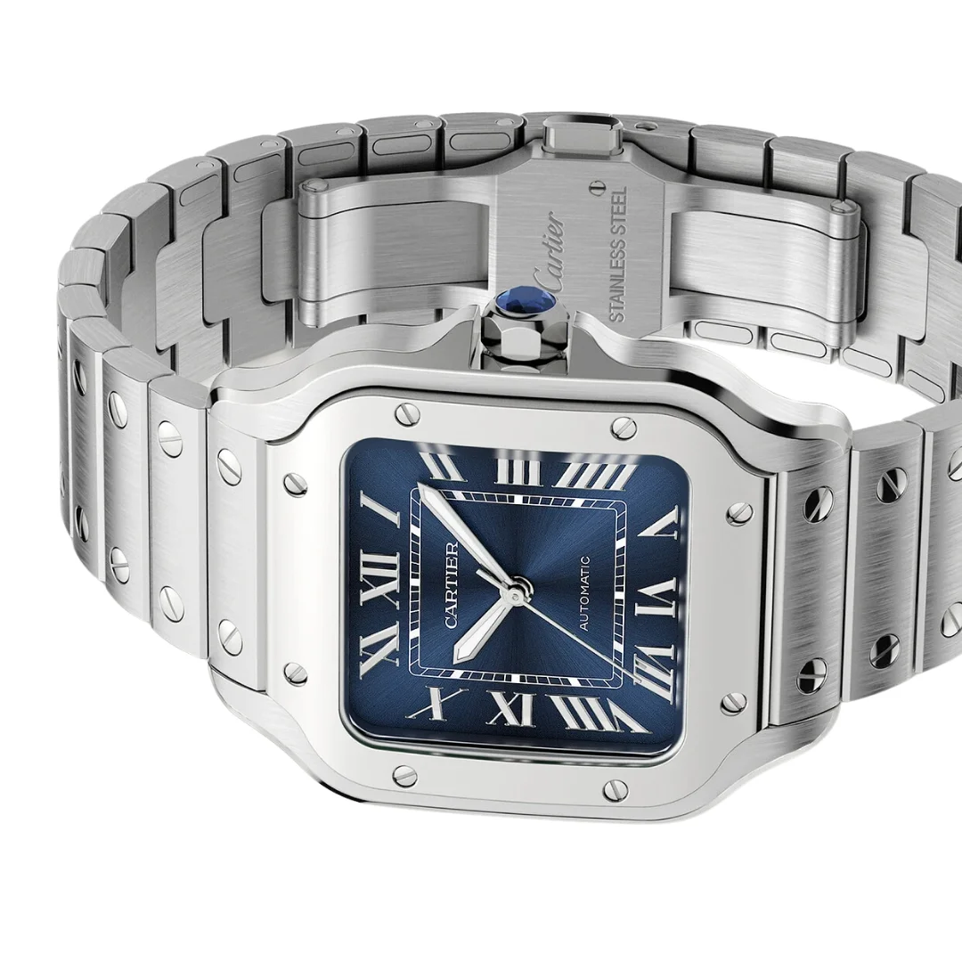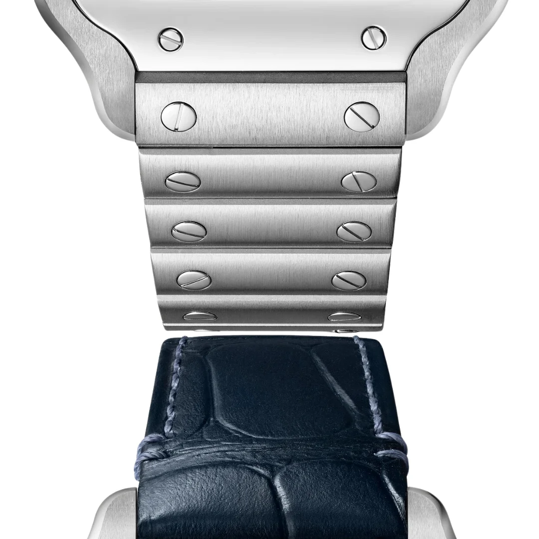 Santos de Cartier Ref. WSSA0063, medium model, mechanical movement with automatic winding 1847 MC. Steel case, 7-sided crown with synthetic faceted blue spinel, graduated blue dial, polished steel sword-shaped hands with luminescent material, sapphire crystal. Steel bracelet with SmartLink adjustment system. Second strap in blue alligator skin, with interchangeable folding steel buckle. Both are fitted with the QuickSwitch interchangeable system. Case width: 35.1 mm, thickness: 8.83 mm. Water-resistant up to 10 bar (approx. 100 metres).