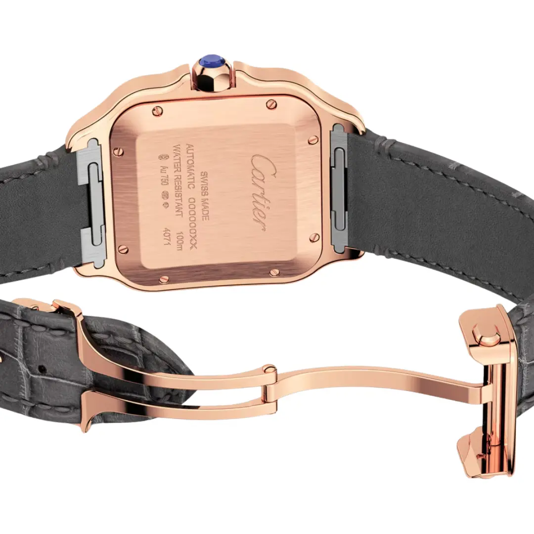 Cartier Santos WGSA0019 watch, large model, mechanical movement with automatic winding caliber 1847 MC. Rose gold 750/1000 case, 7-sided crown in rose gold 750/1000 set with a faceted sapphire. Opaline silver dial, blued-steel sword-shaped hands, sapphire crystal. One alligator-skin and one calfskin strap with the “QuickSwitch” interchangeability system, interchangeable folding buckle in rose gold 750/1000. Case width: 39.8 mm, thickness: 9.38 mm. Water-resistant to 10 bar (approx. 100 meters).