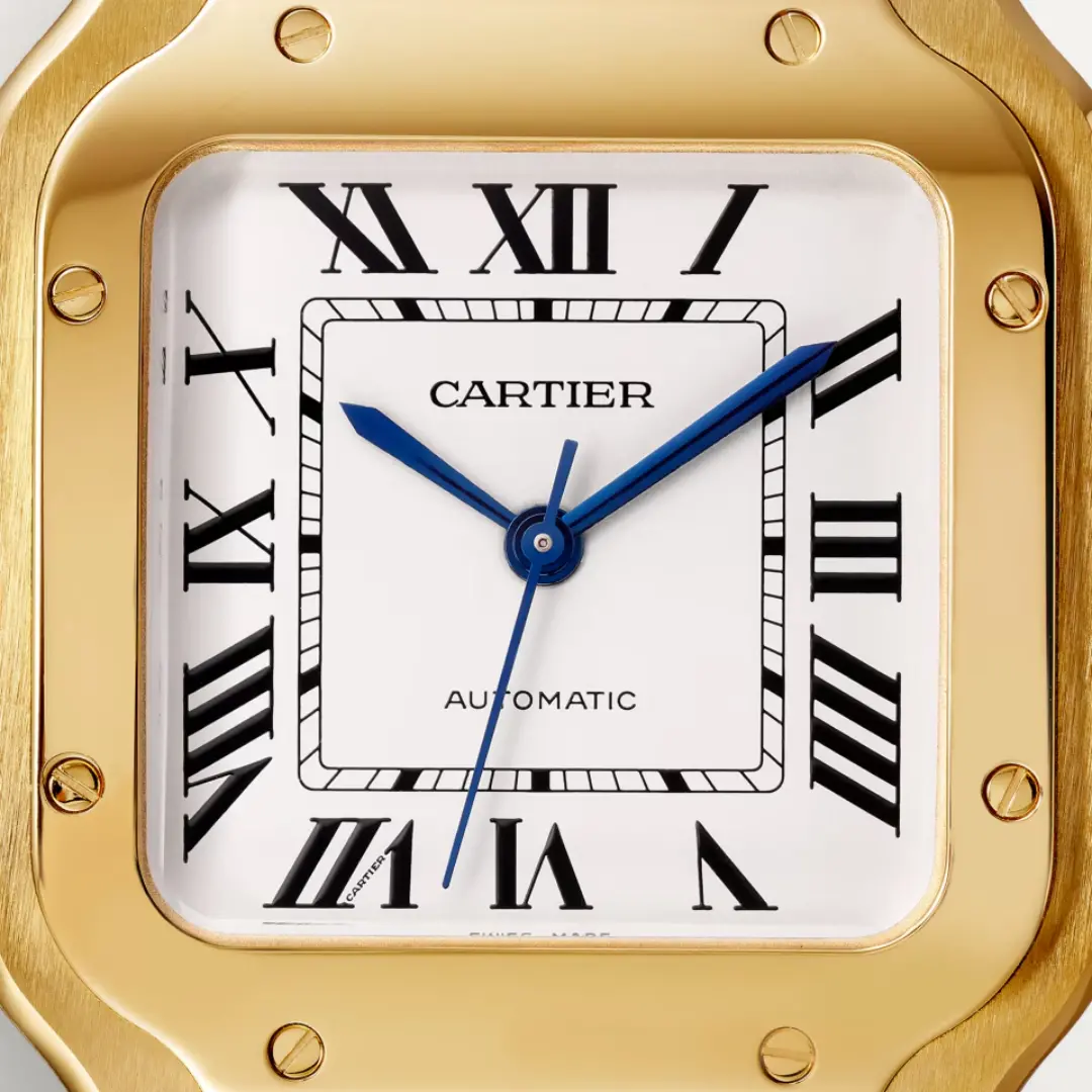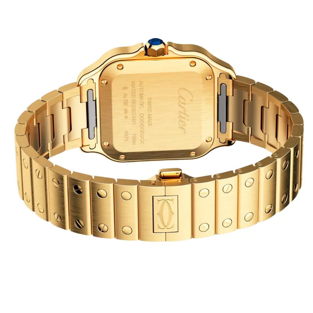 Cartier Santos WGSA0030 watch, medium model, Manufacture mechanical movement with automatic winding, caliber 1847 MC. 18K yellow gold (750/1000) case, 18K yellow gold (750/1000) 7-sided crown set with a faceted sapphire, silvered opaline dial, blued-steel sword-shaped hands, sapphire crystal. Bracelet in 18K yellow gold (750/1000). Second bracelet in alligator skin, with interchangeable 18K yellow gold (750/1000) folding buckle. Case width: 35.1 mm, thickness: 8.83 mm. Water-resistant up to 10 bar (approx. 100 meters/100 feet).