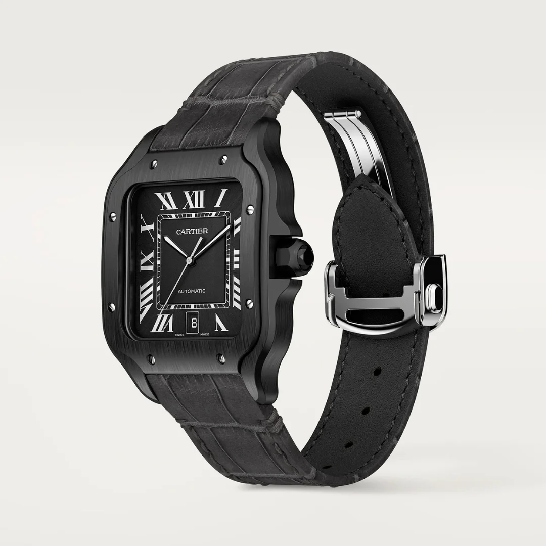 Santos de Cartier watch, large model, Manufacture mechanical movement with automatic winding, calibre 1847 MC. Bezel and case in steel and ADLC, steel crown set with a faceted black synthetic spinel, black dial, black steel sword-shaped hands with luminescent material, sapphire crystal. First strap in rubber, second strap in black alligator skin, interchangeable steel folding buckle. Both bracelets are fitted with the QuickSwitch interchangeable system. Case width: 39.8 mm, thickness: 9.38 mm. Water-resistant to 10 bar (approx. 100 meter).