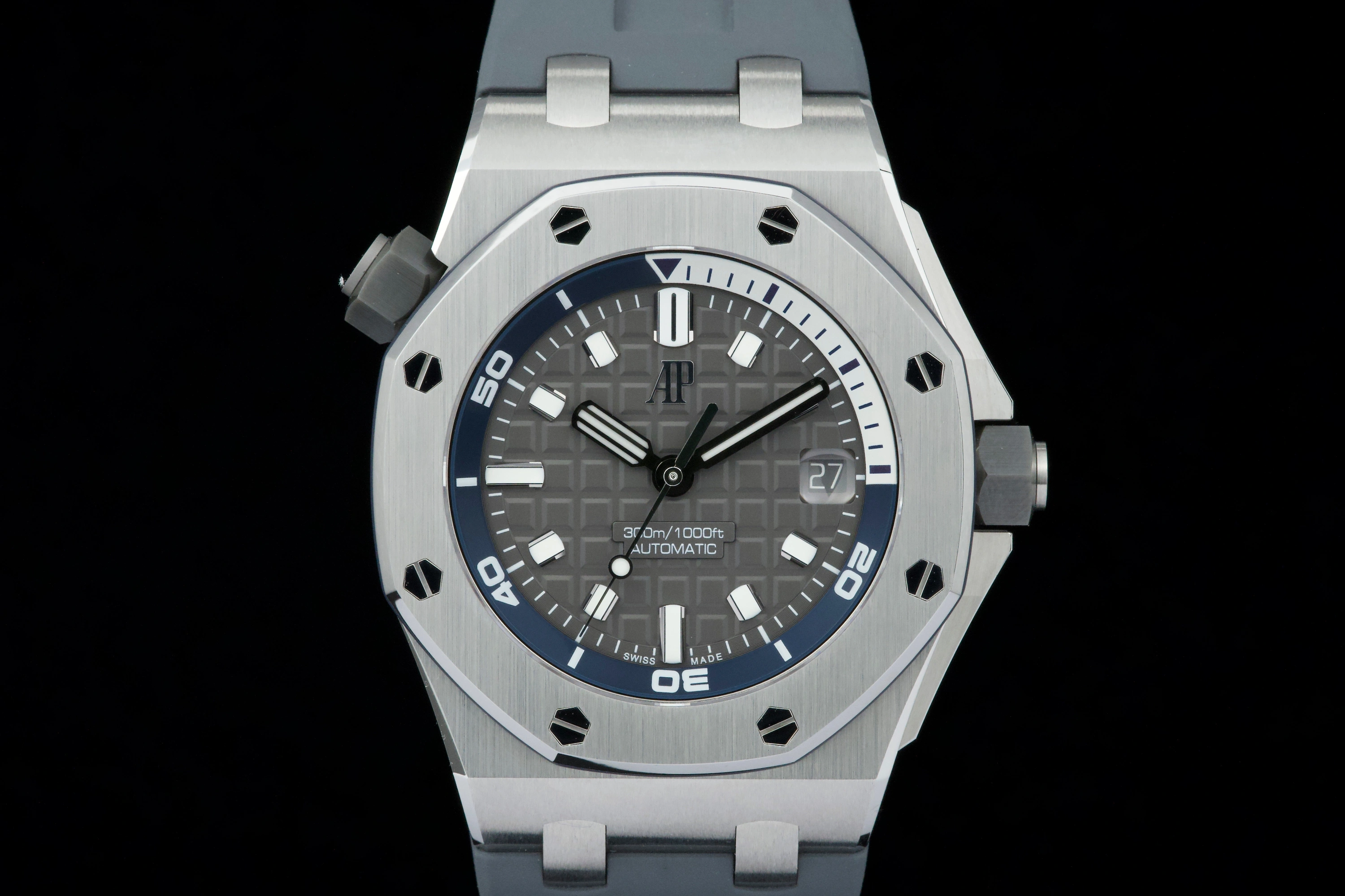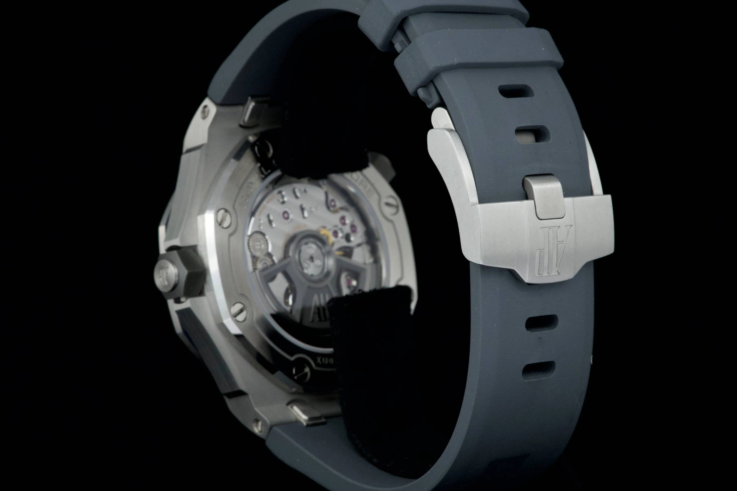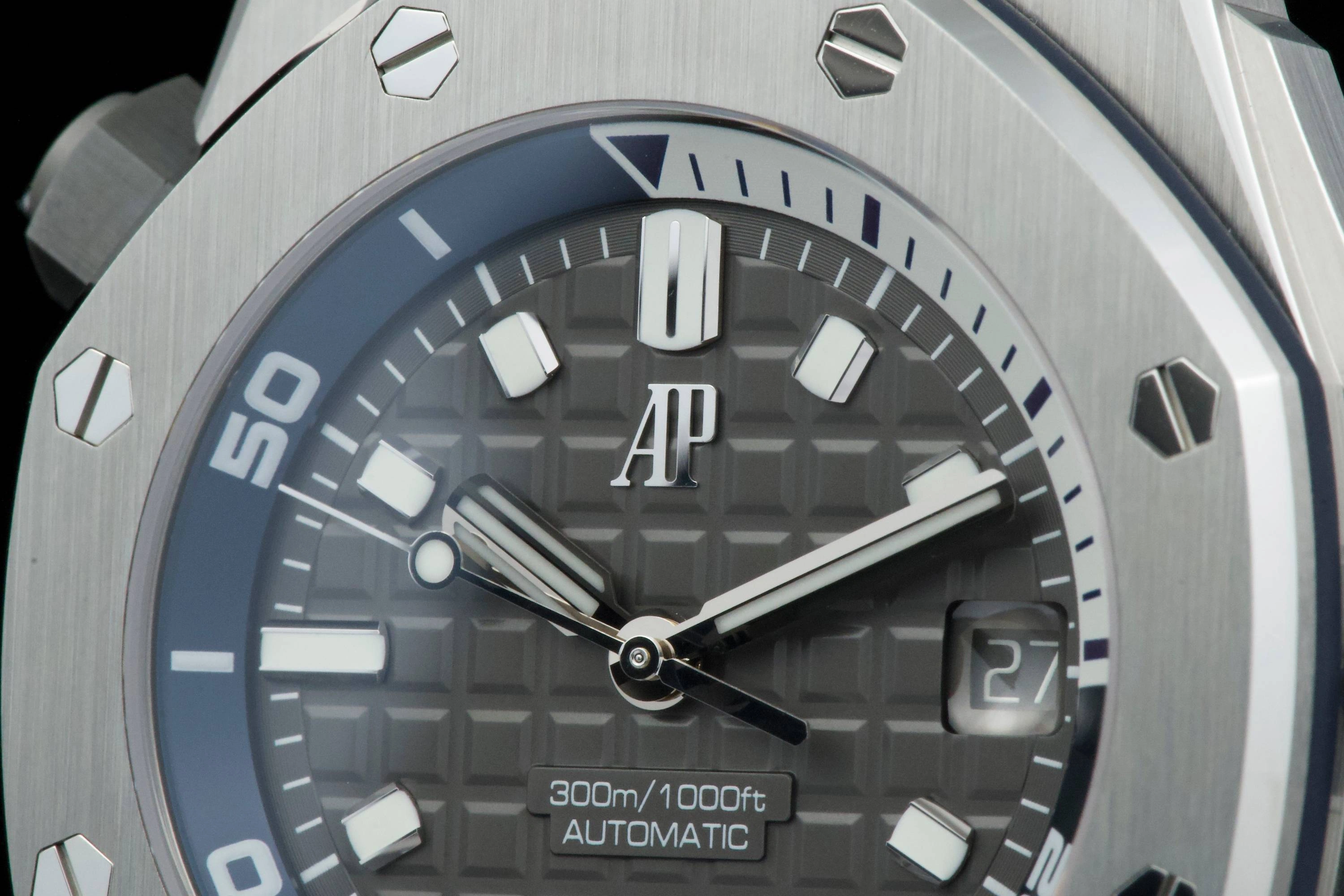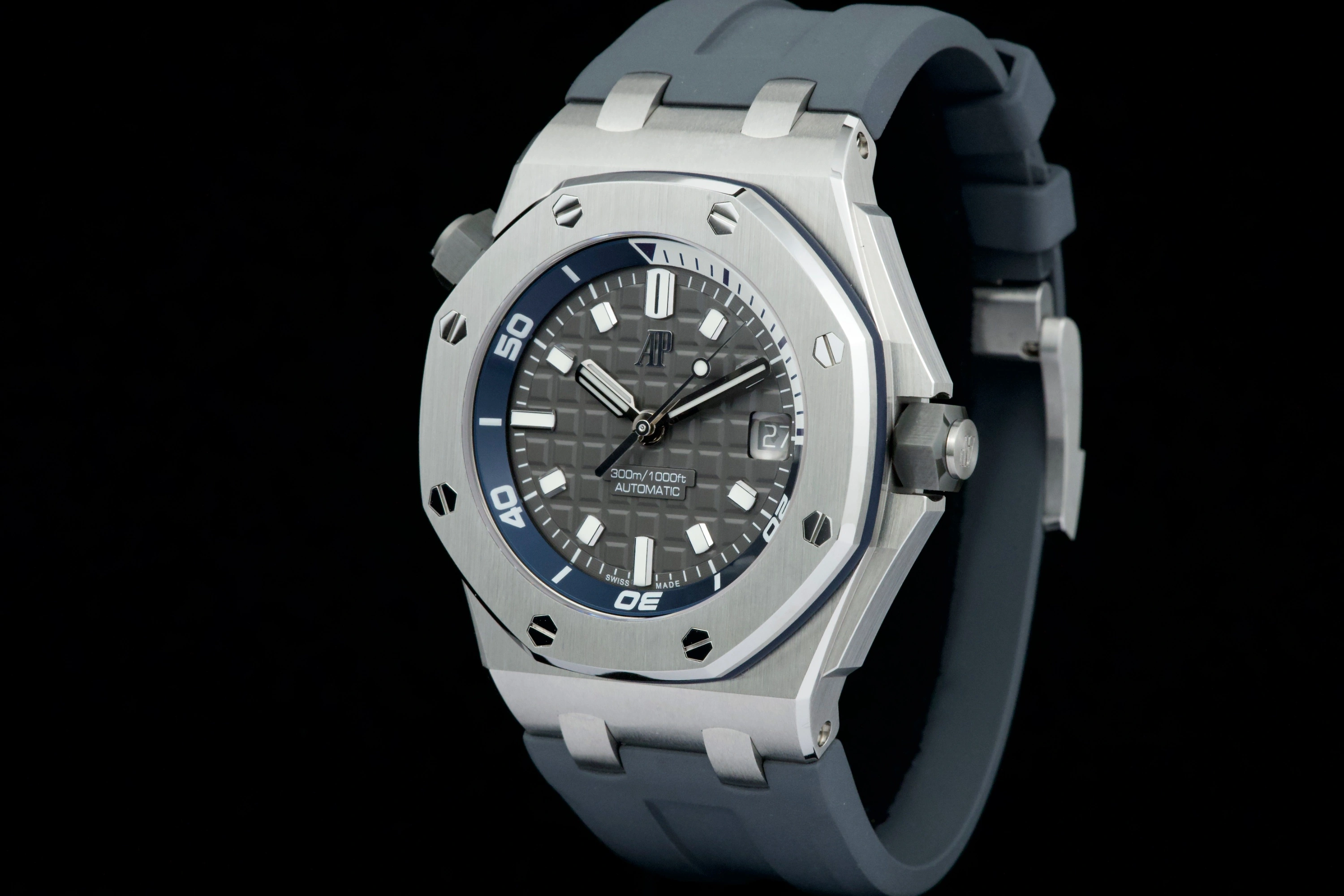 Introduced in 2021, the Royal Oak Offshore Diver reference 15720ST.OO.A009CA.01 has a stainless steel case paired with a Grey dial and matching rubber strap. Inside ticks the brand's caliber AP 3120 self-winding movement with date. The crowns are made of ceramic.