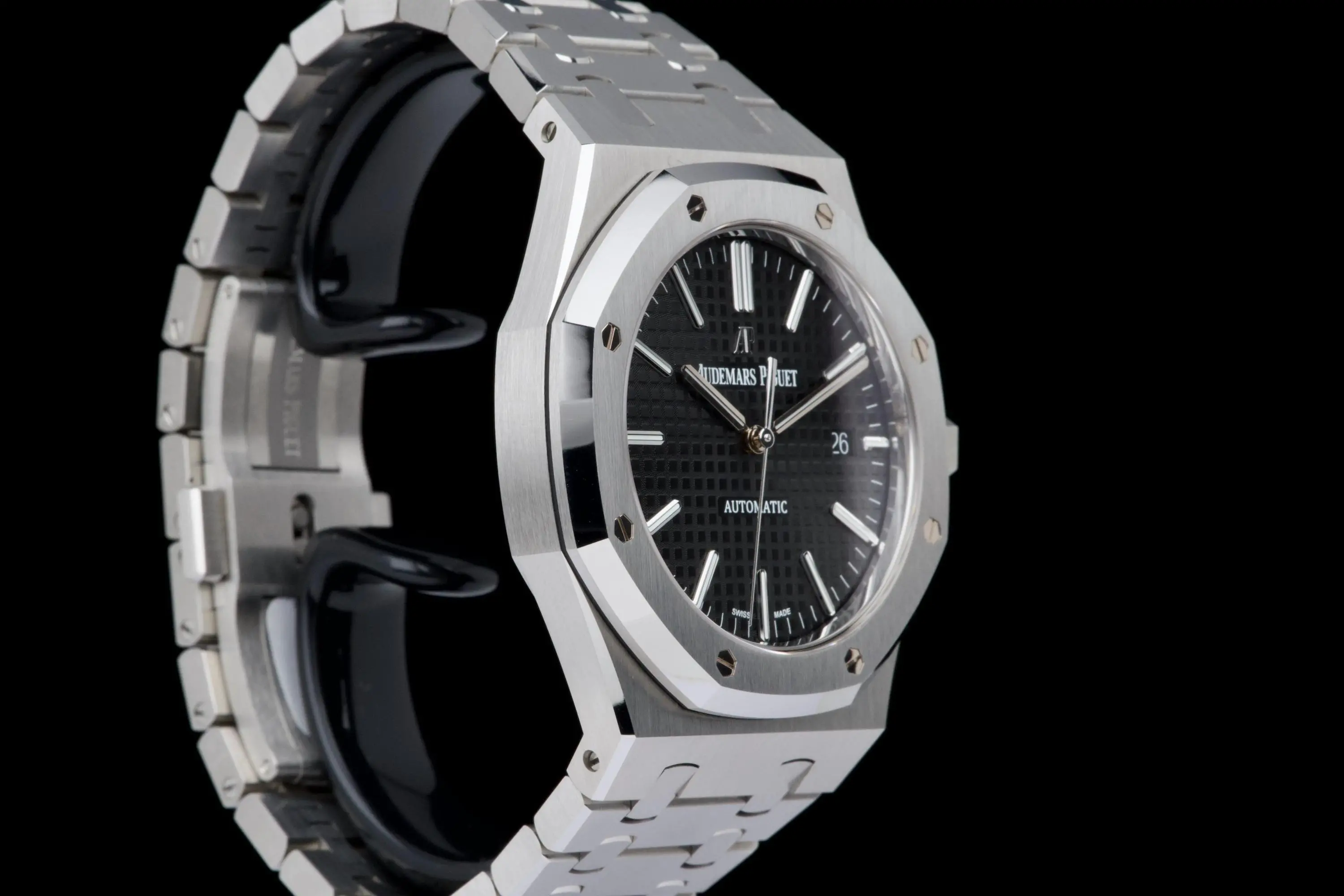 The present Audemars Piguet Royal Oak reference 15400ST, featuring the classic black “Grande Tapisserie” dial, dates to 2016. Sold in Atlanta