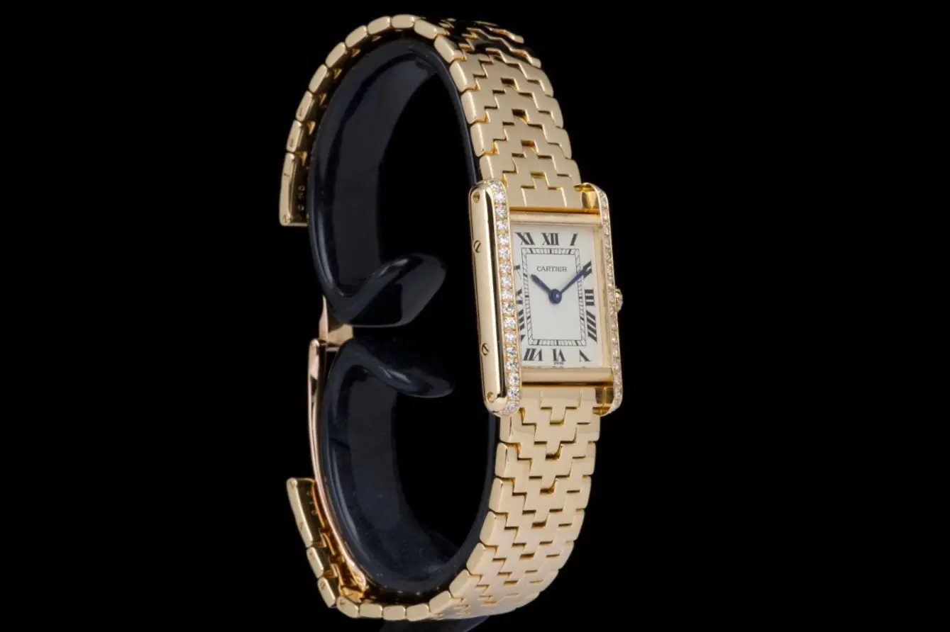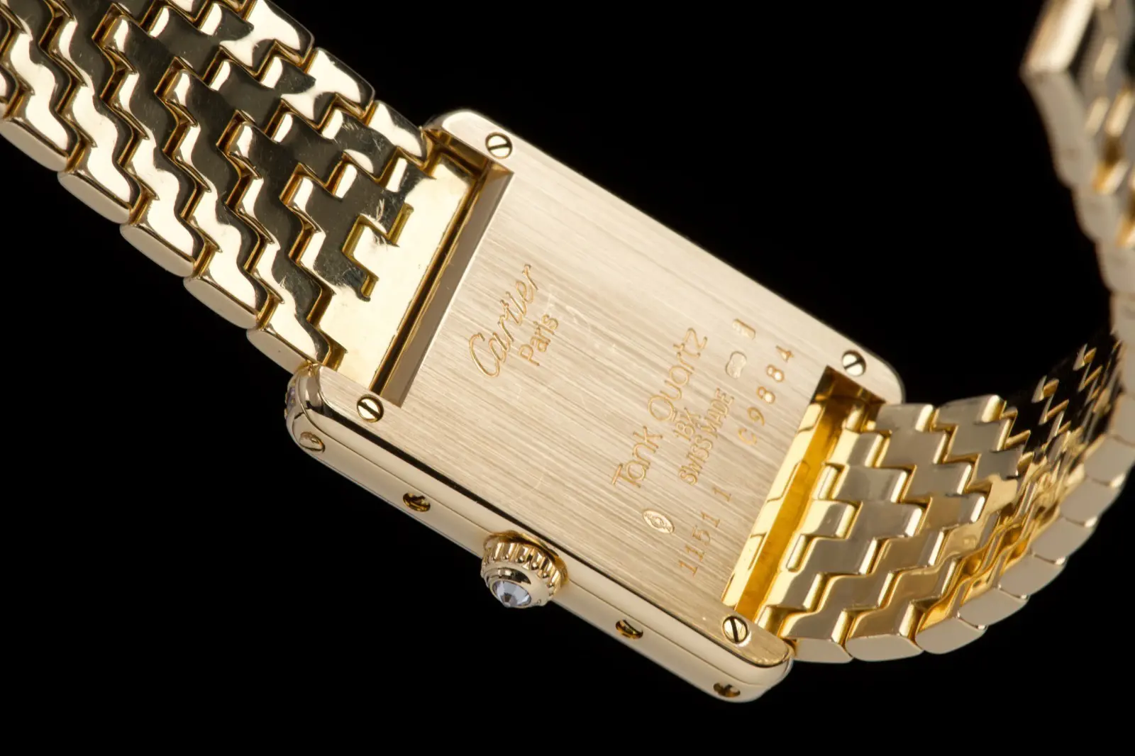 This Cartier Tank MM in yellow gold, dating from 1995, is an extremely rare example distinguished by its highly unusual Pyramide bracelet and diamond-set case