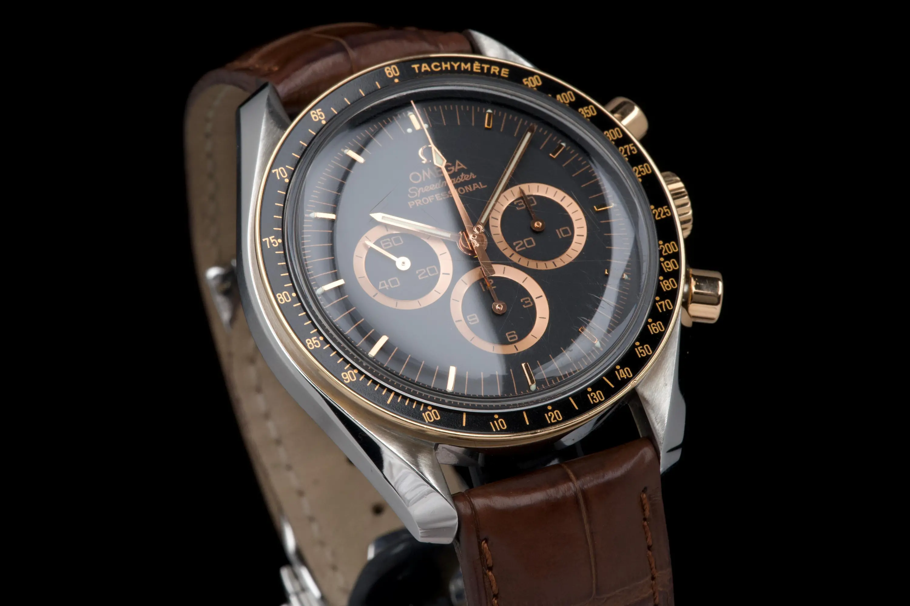The Omega Speedmaster Professional Moonwatch Apollo 15 35th Anniversary is a limited edition of 1971 pieces made to commemorate the 35th anniversary of the Apollo XV mission. It features a red gold bezel, pushers and crown. Reference 3366.51.00