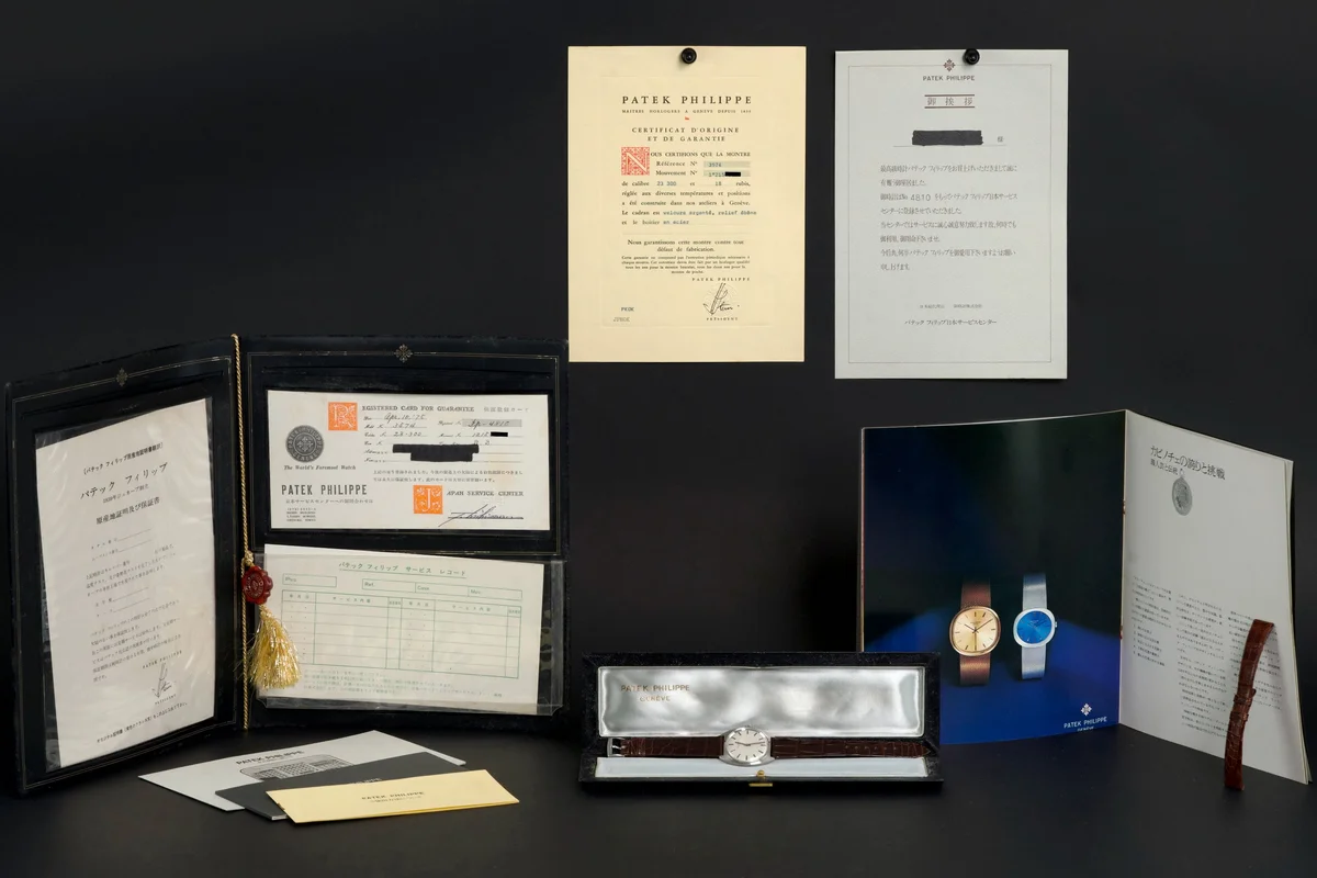 An exceptional and beautifully preserved example of the Patek Philippe Calatrava reference 3574 in stainless steel, presented with an absolutely extraordinary full set.