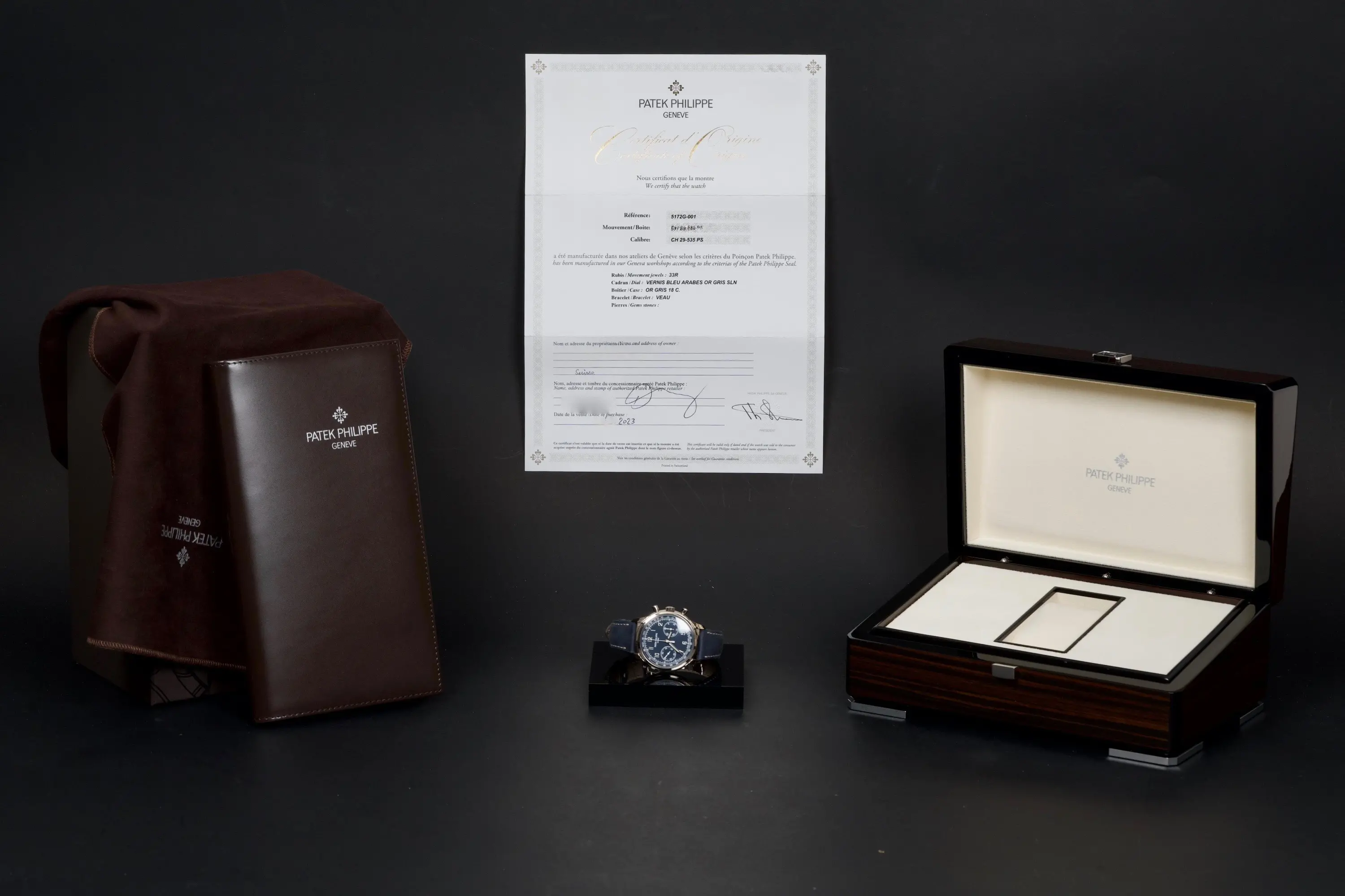 The present Patek Philippe Chronograph reference 5172G-001, featuring the highly desirable blue dial, dates to 2023 and is offered here as a complete full set.