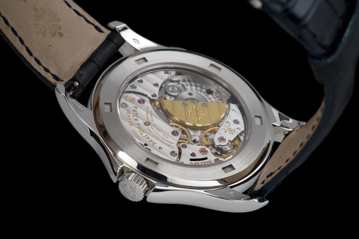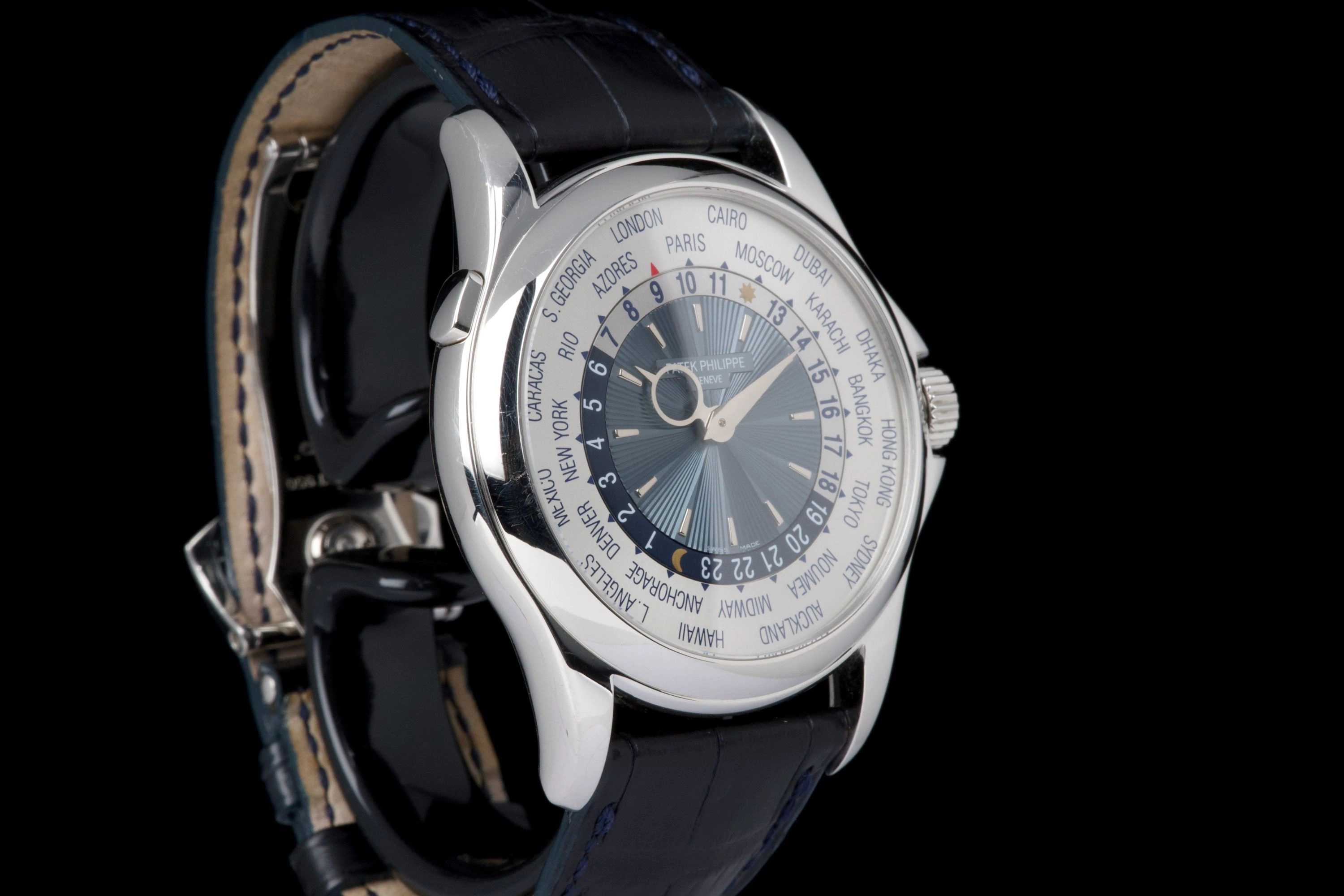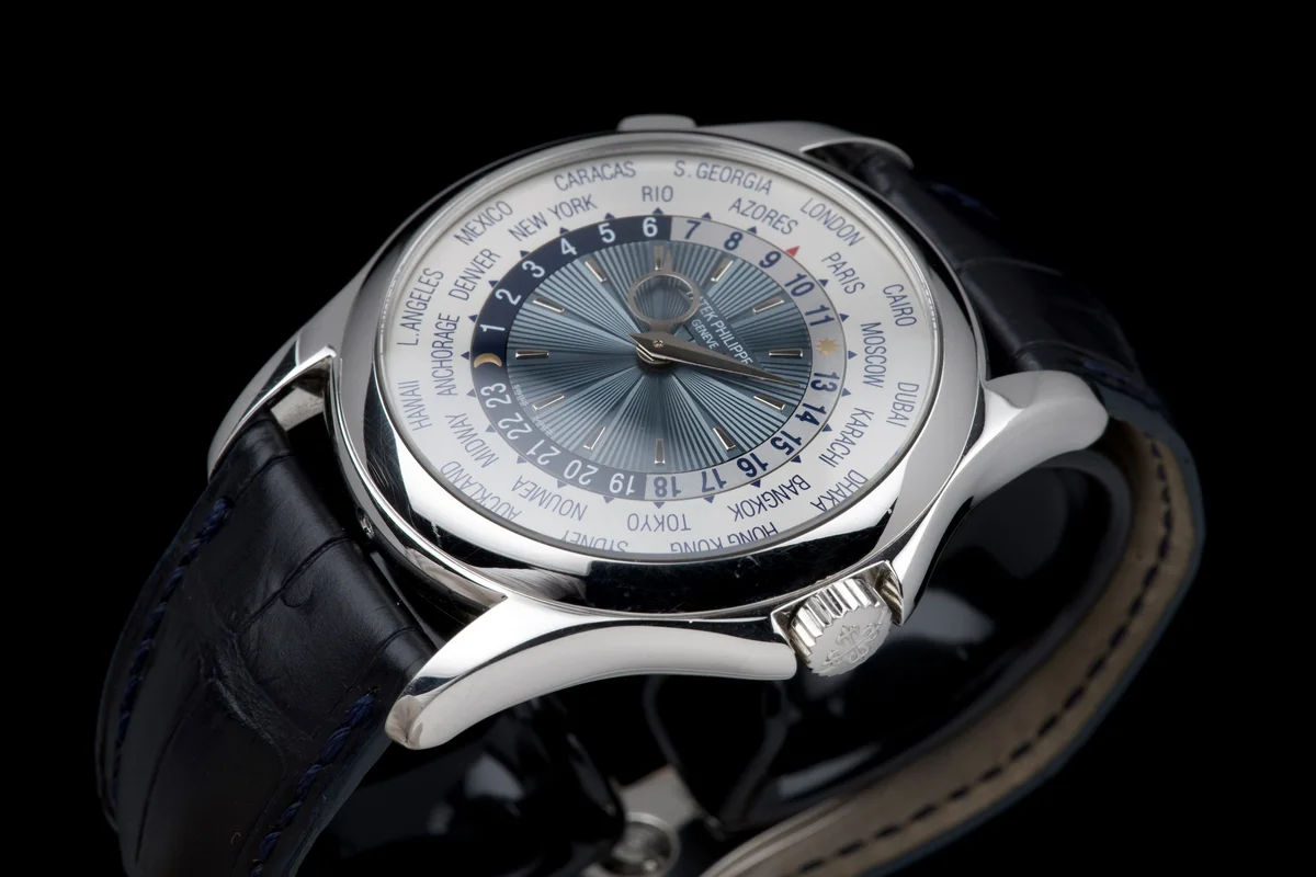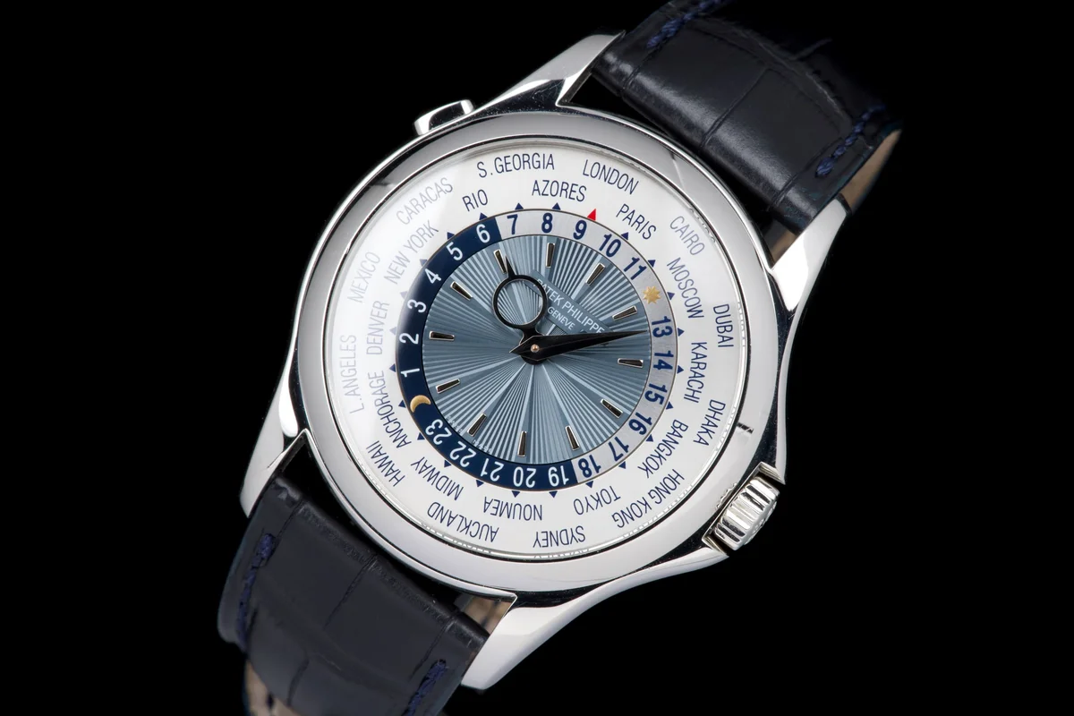 A refined example of the Patek Philippe World Time reference 5130P-001, crafted in platinum and featuring the distinctive blue-grey guilloché dial.