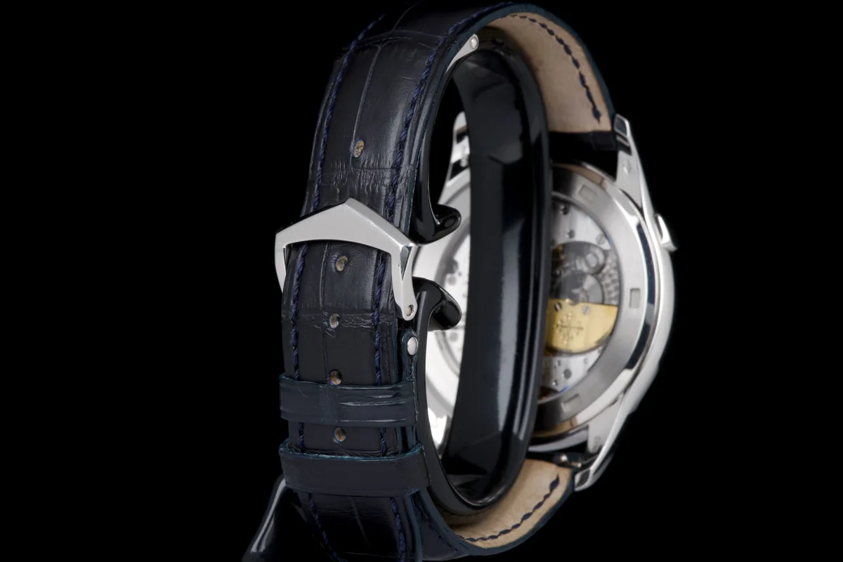 The watch remains unpolished, showing light wear from use, and is fitted with a black alligator strap and its original platinum deployant clasp.