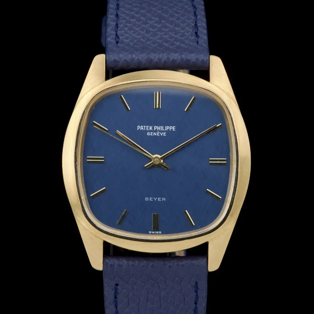 Patek Philippe Golden Ellipse, reference 3585J, yellow gold “square”. 36 mm case — considered oversized for the period (mid 70's). Blue linen-textured dial. A superb and wearable large-size Golden Ellipse, rare in this square-shaped configuration, offering excellent wrist presence and vintage charm.