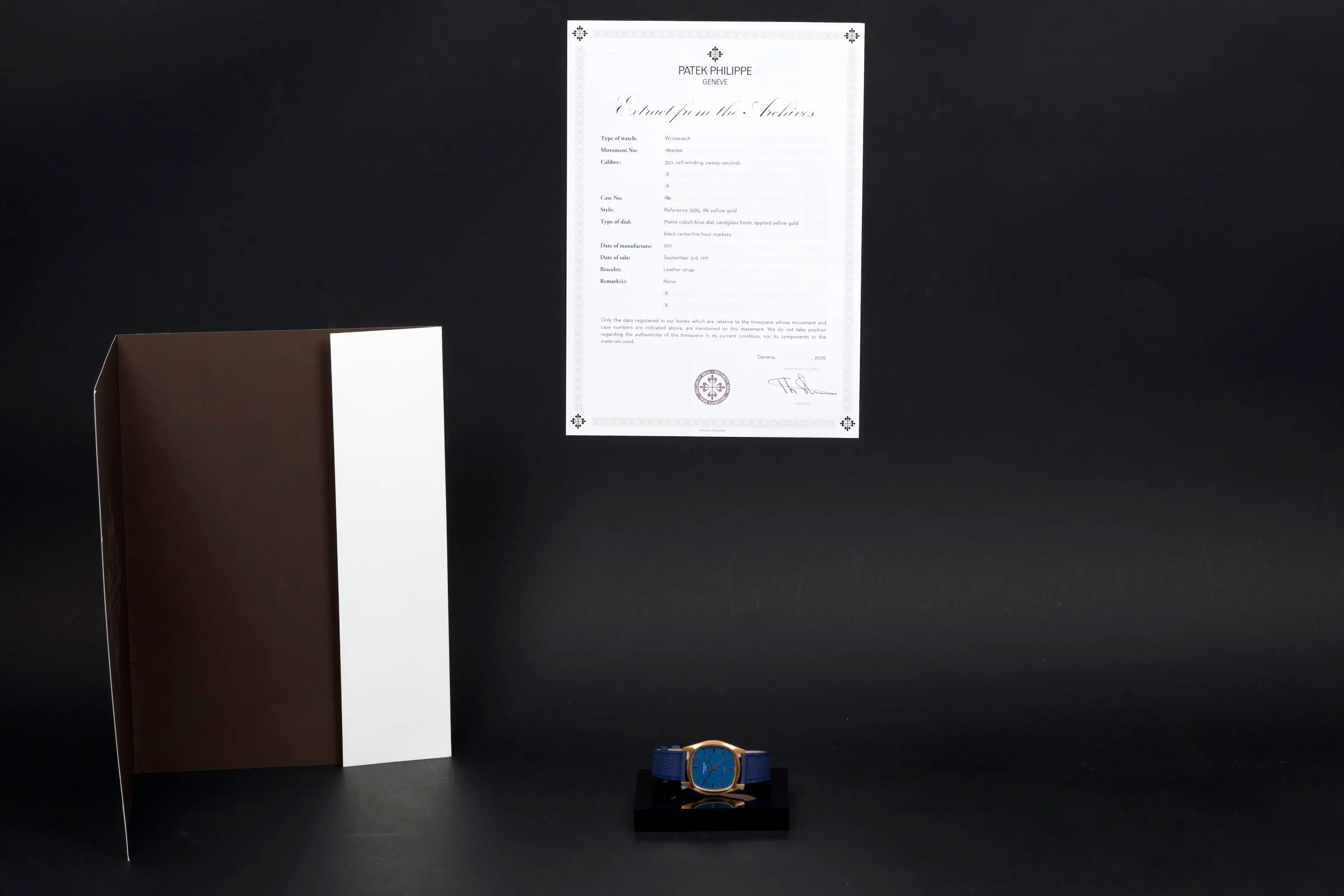 The watch is delivered with a Christie’s strap and a later-added gold-tone stainless steel buckle. It also comes with an extract from the Patek Philippe archives