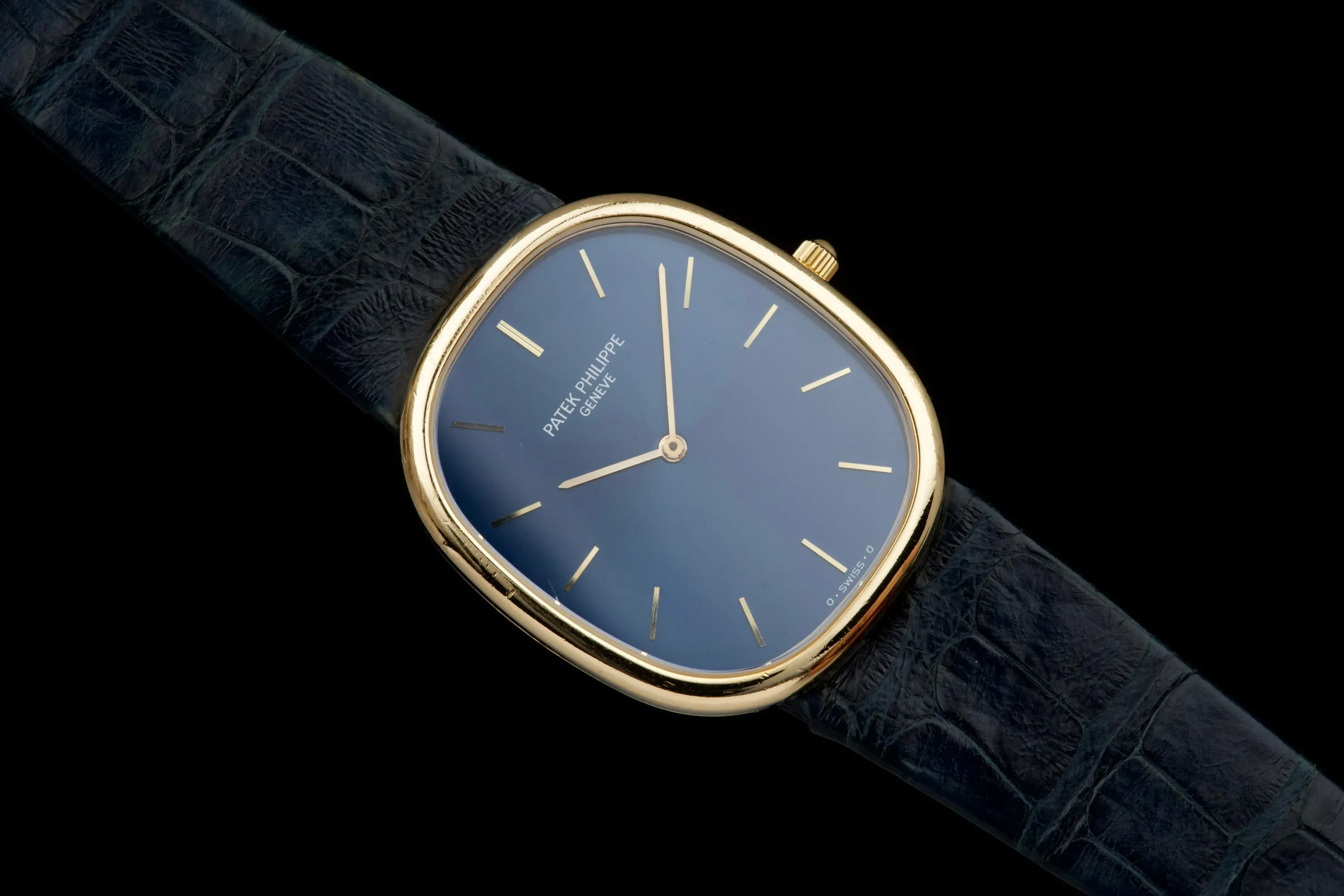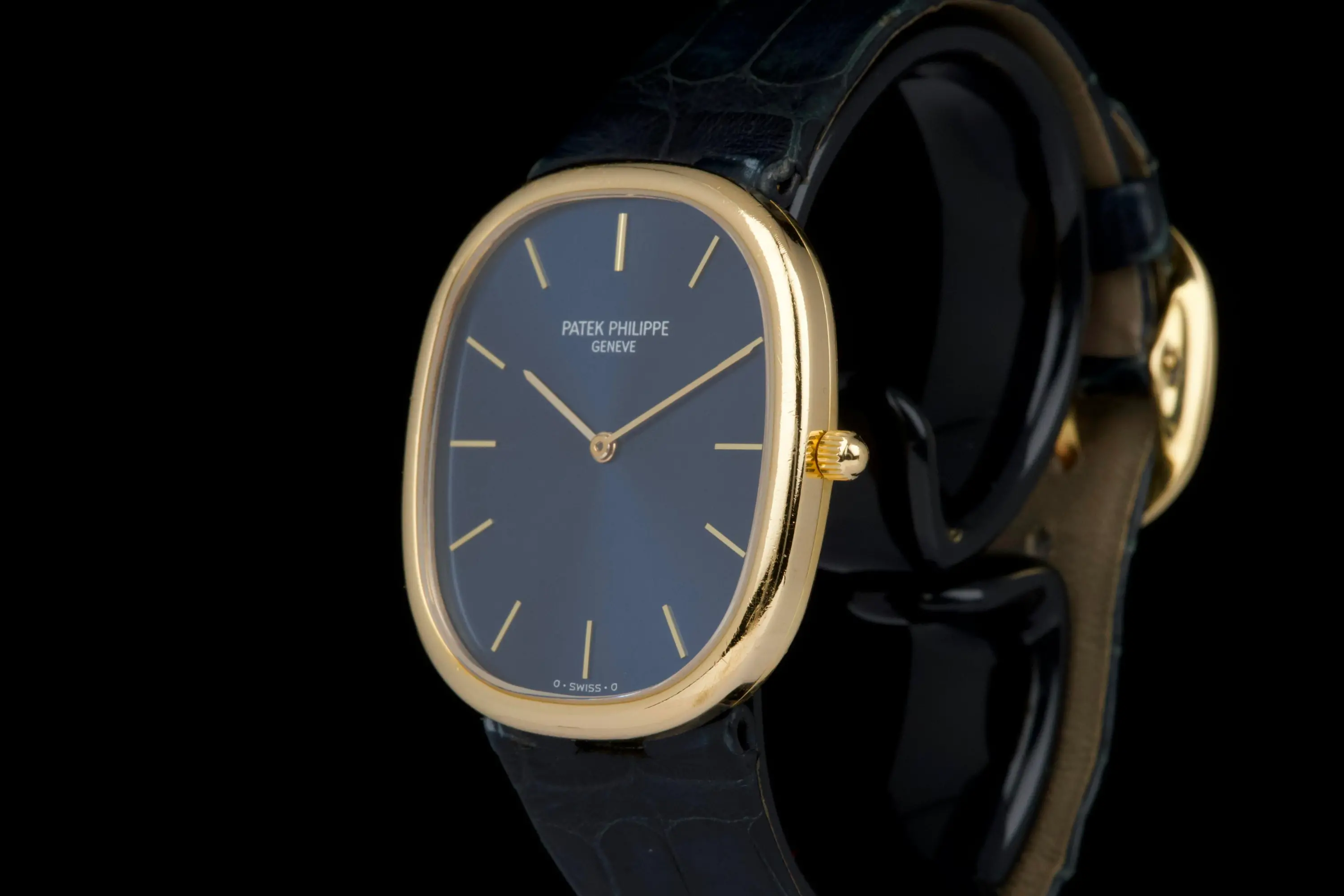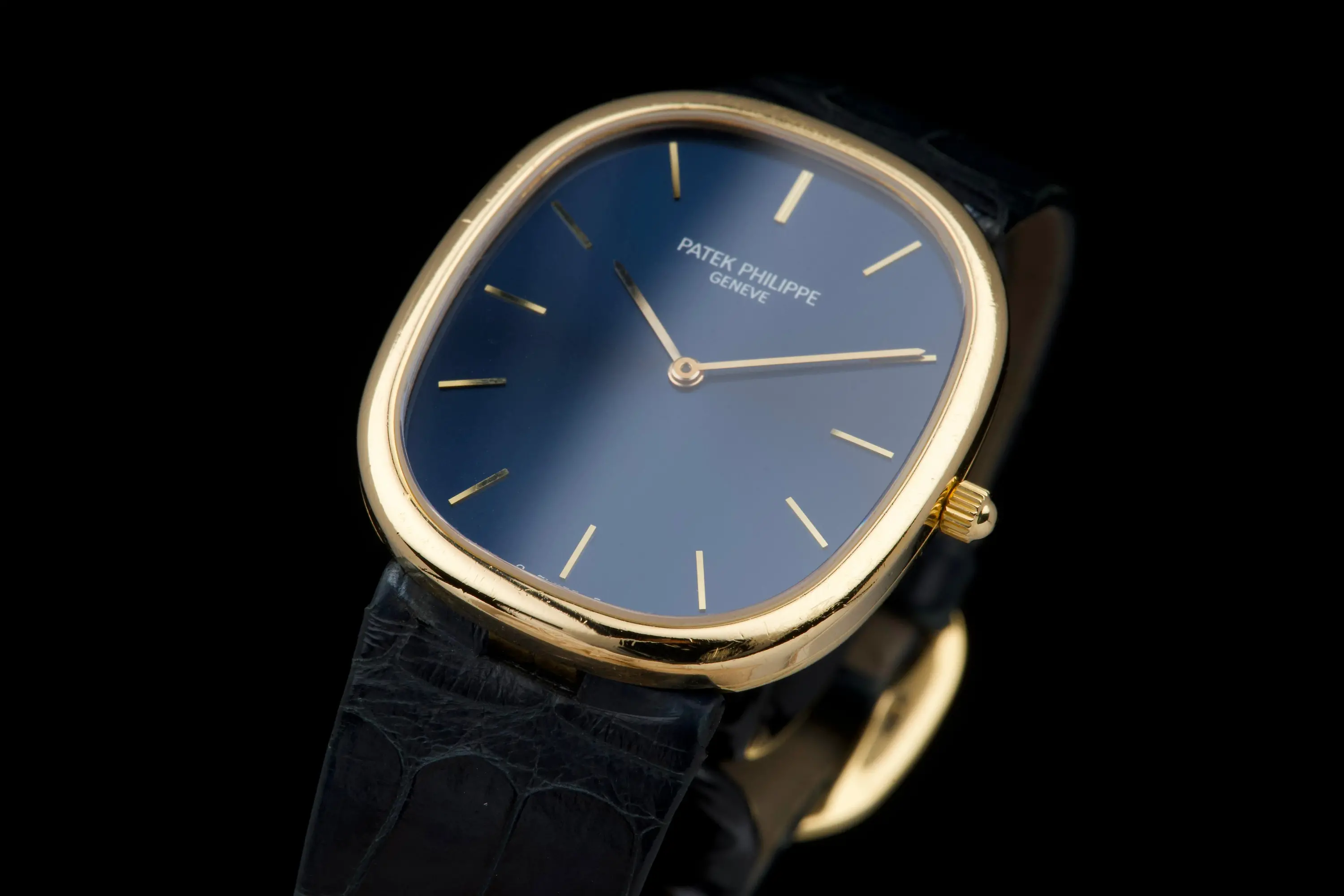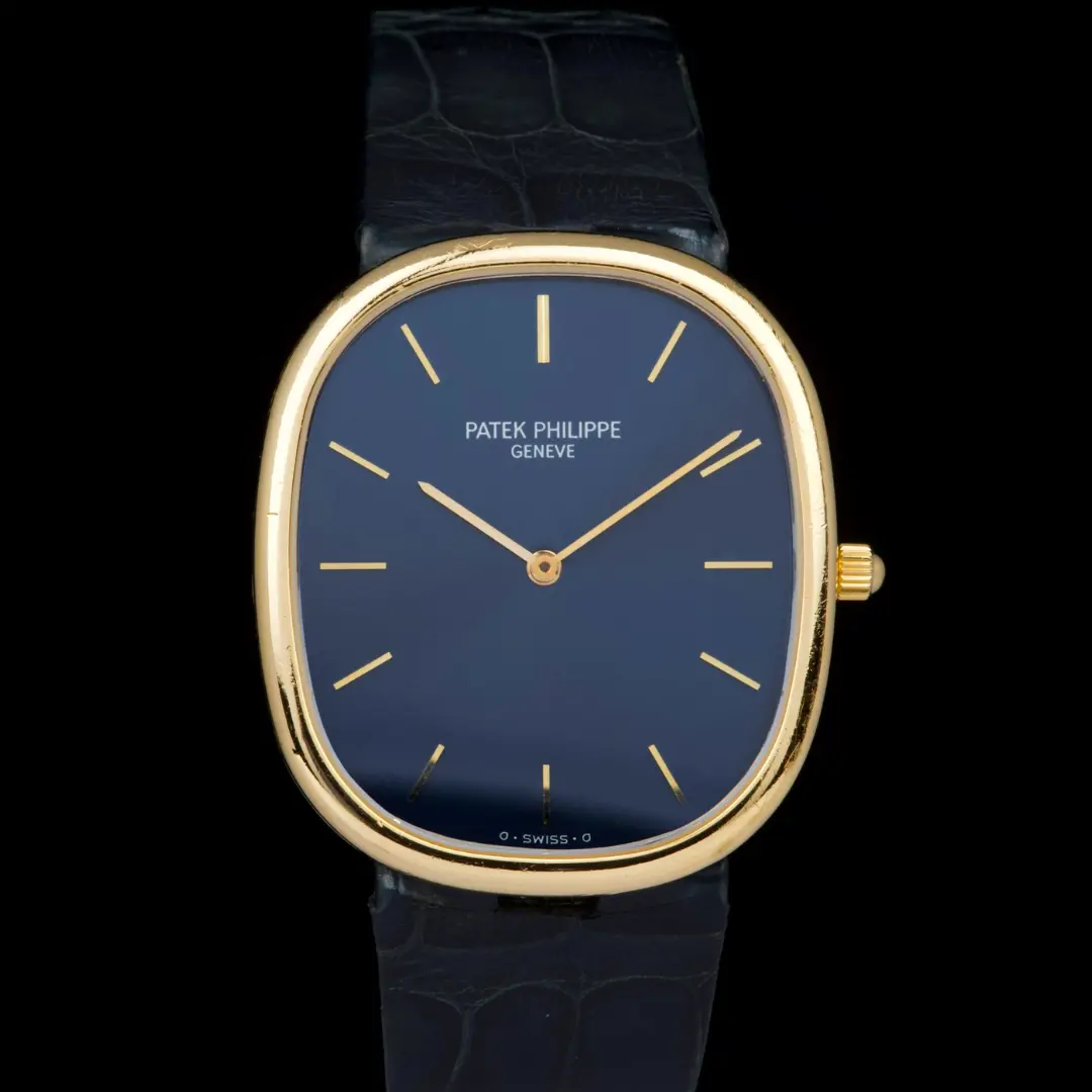 The present Patek Philippe Golden Ellipse reference 3738, executed in yellow gold and dating to the 1980s. This example measures approximately 31 x 35 mm