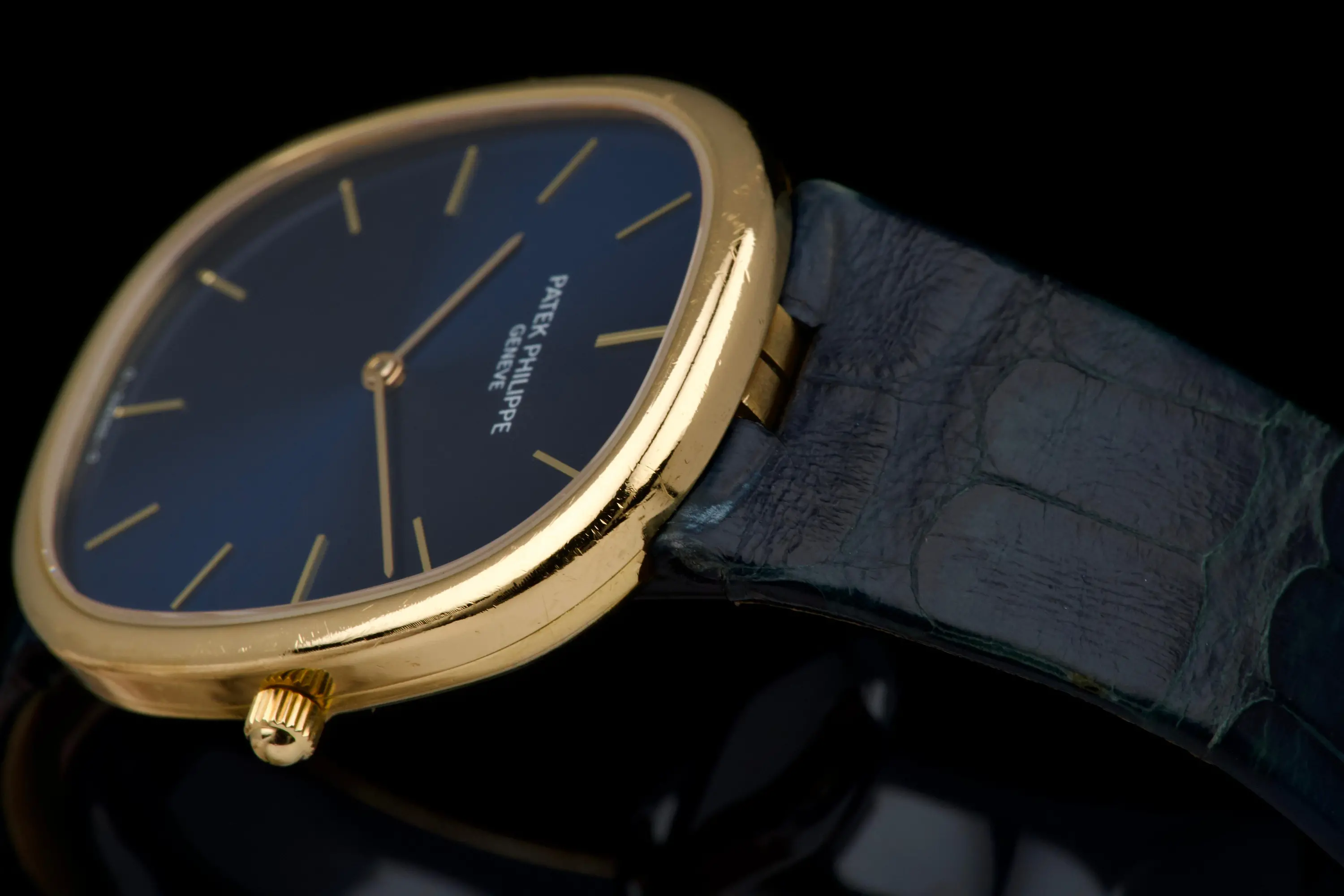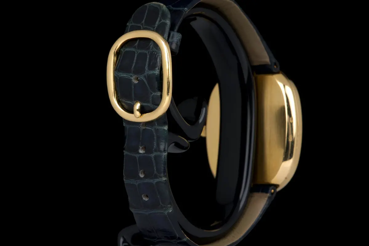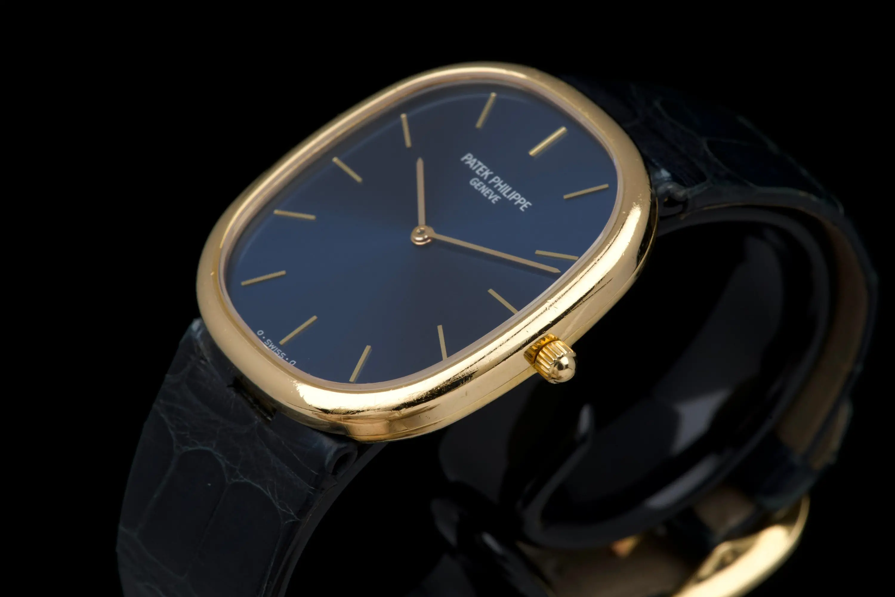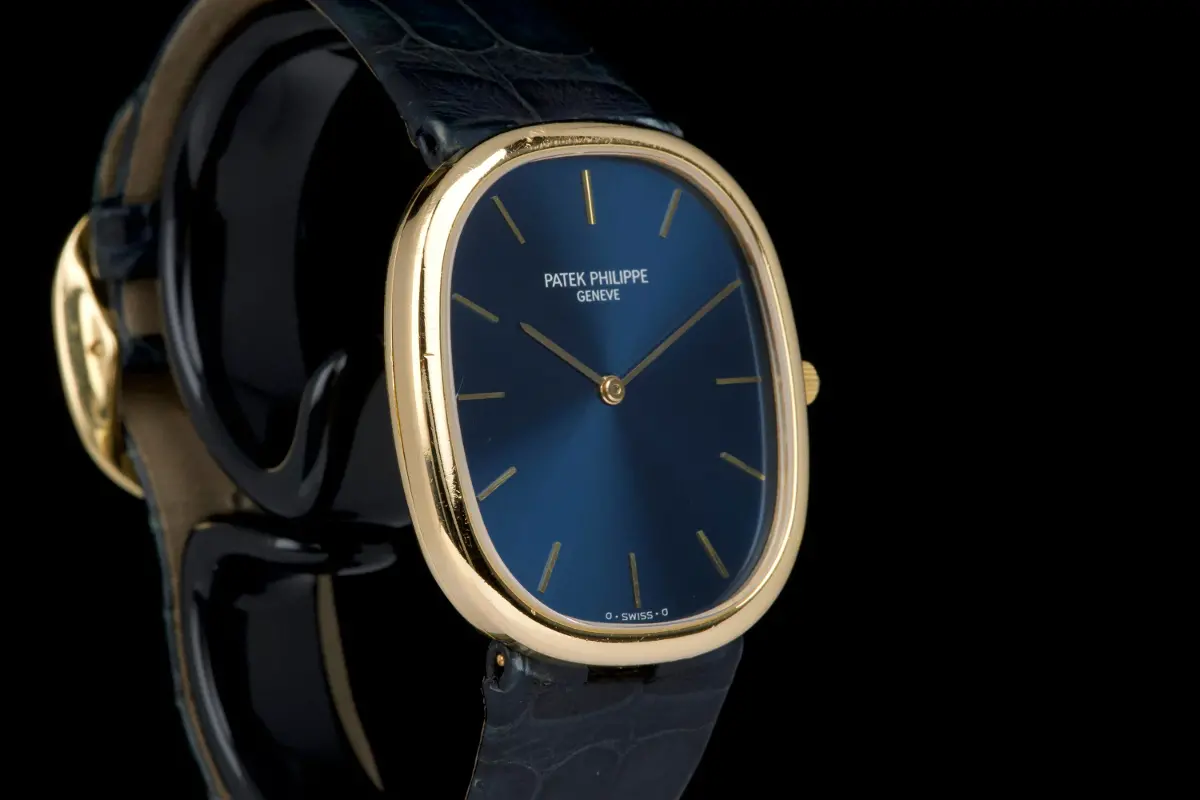 The present Patek Philippe Golden Ellipse reference 3738, executed in yellow gold and dating to the 1980s. This example measures approximately 31 x 35 mm