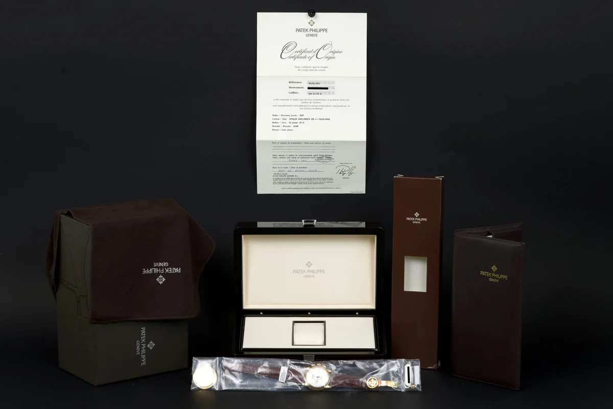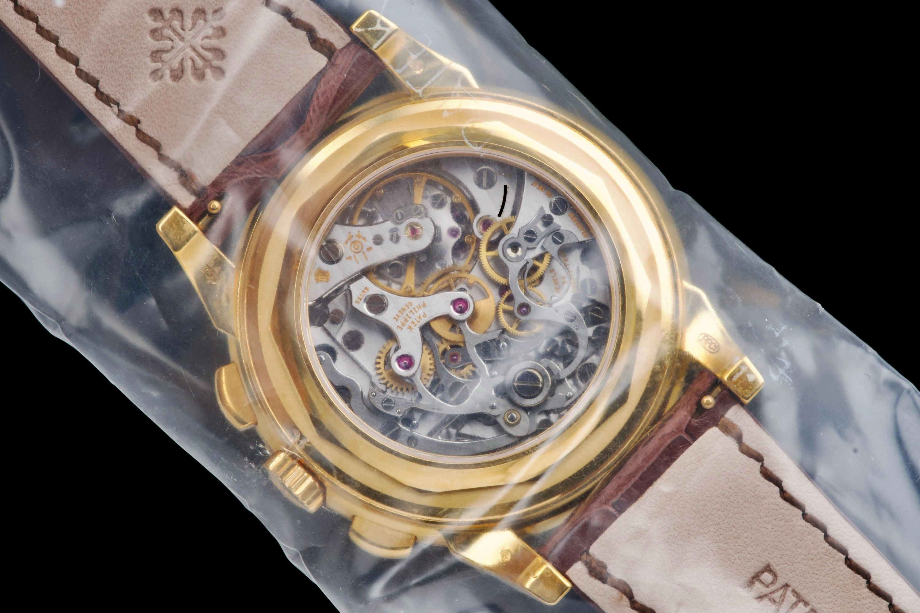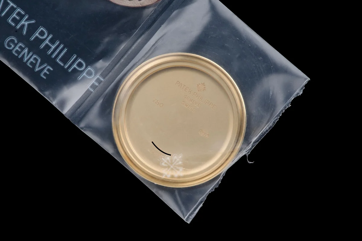 with the solid caseback and pin pushers attached to the original Patek Philippe plastic seal — a true time capsule and a grail for collectors. Accompanied by its full 2008 set, including box, original certificate, booklets, and accessories.