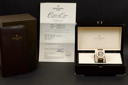 A superb example of the discontinued 5711R in rose gold, featuring the elegant brown embossed dial. Originally sold in Japan in December 2008, this piece was later acquired through Christie’s Hong Kong by its second and last owner in 2016.
