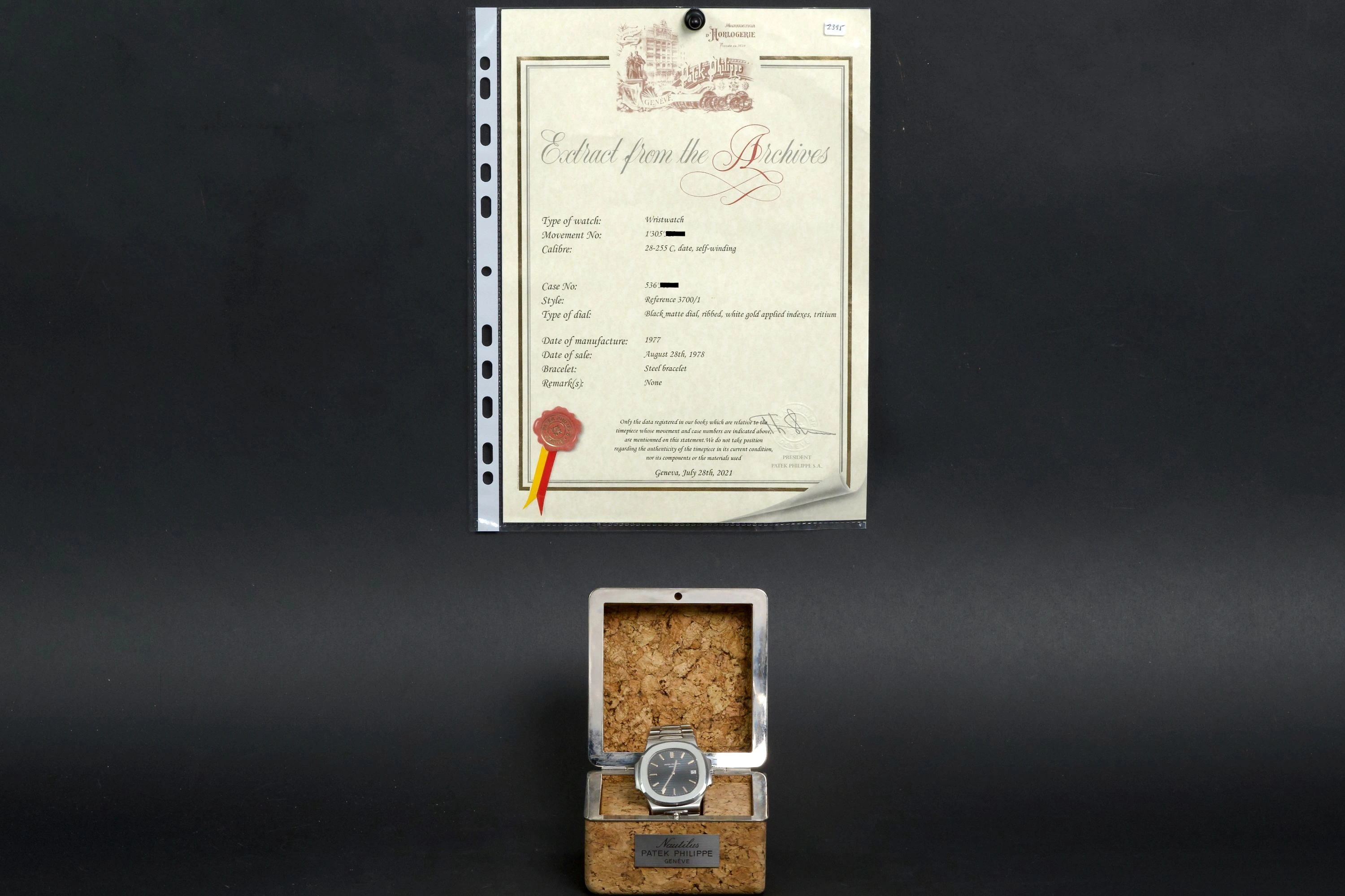 A true icon of 1970s watch design, this Patek Philippe Nautilus 3700/1 was produced in 1977 and sold in 1978, as confirmed by the accompanying Extract from the Archives.