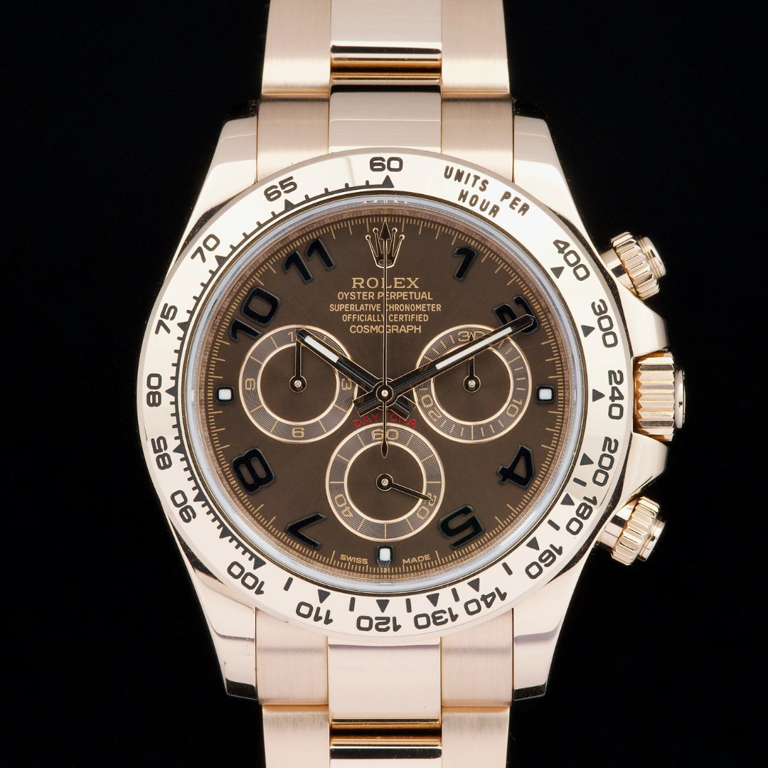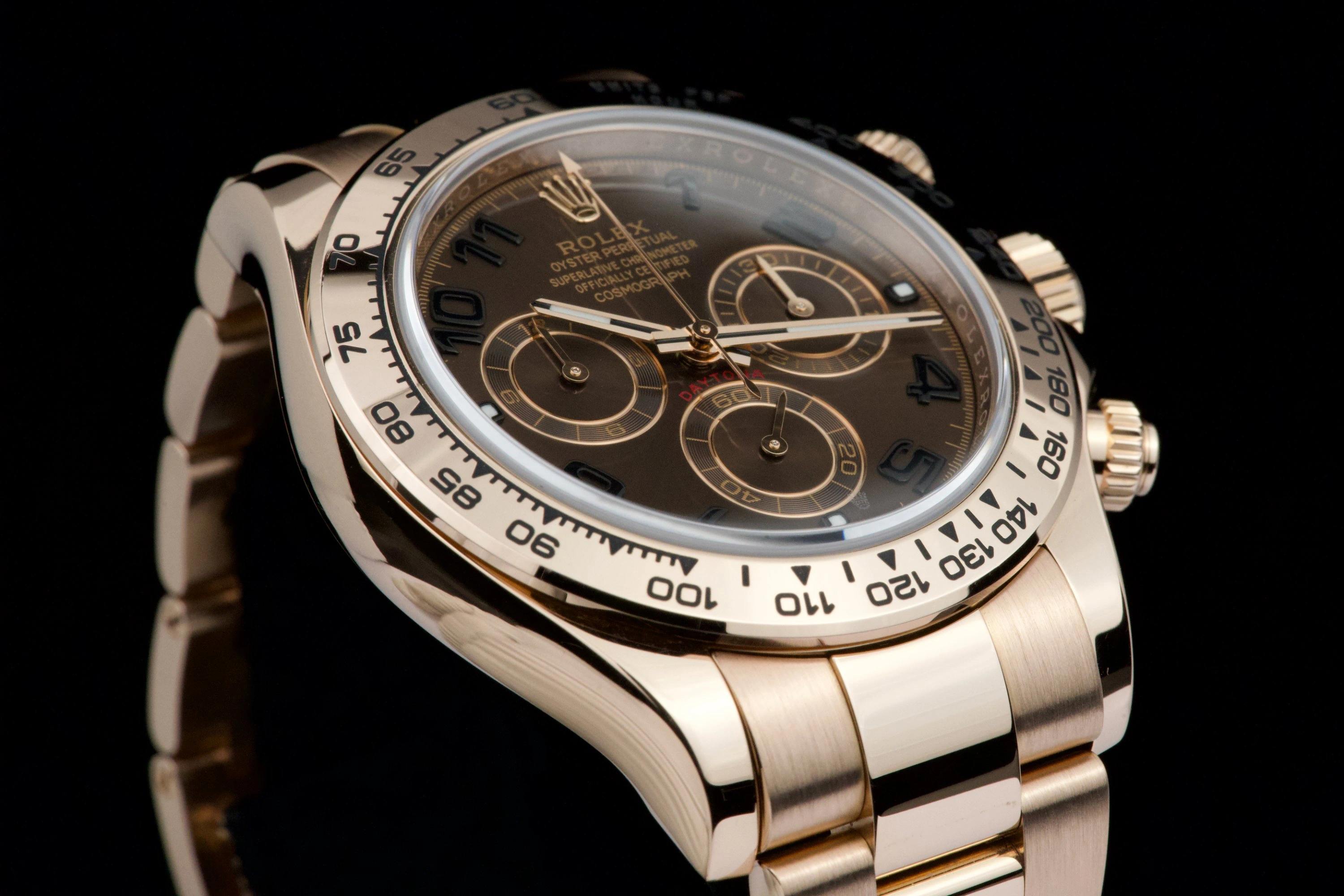 A superb example of the Rolex Cosmograph Daytona reference 116505 in 18K Everose gold, featuring the desirable chocolate brown “racing” dial with black Arabic numerals.