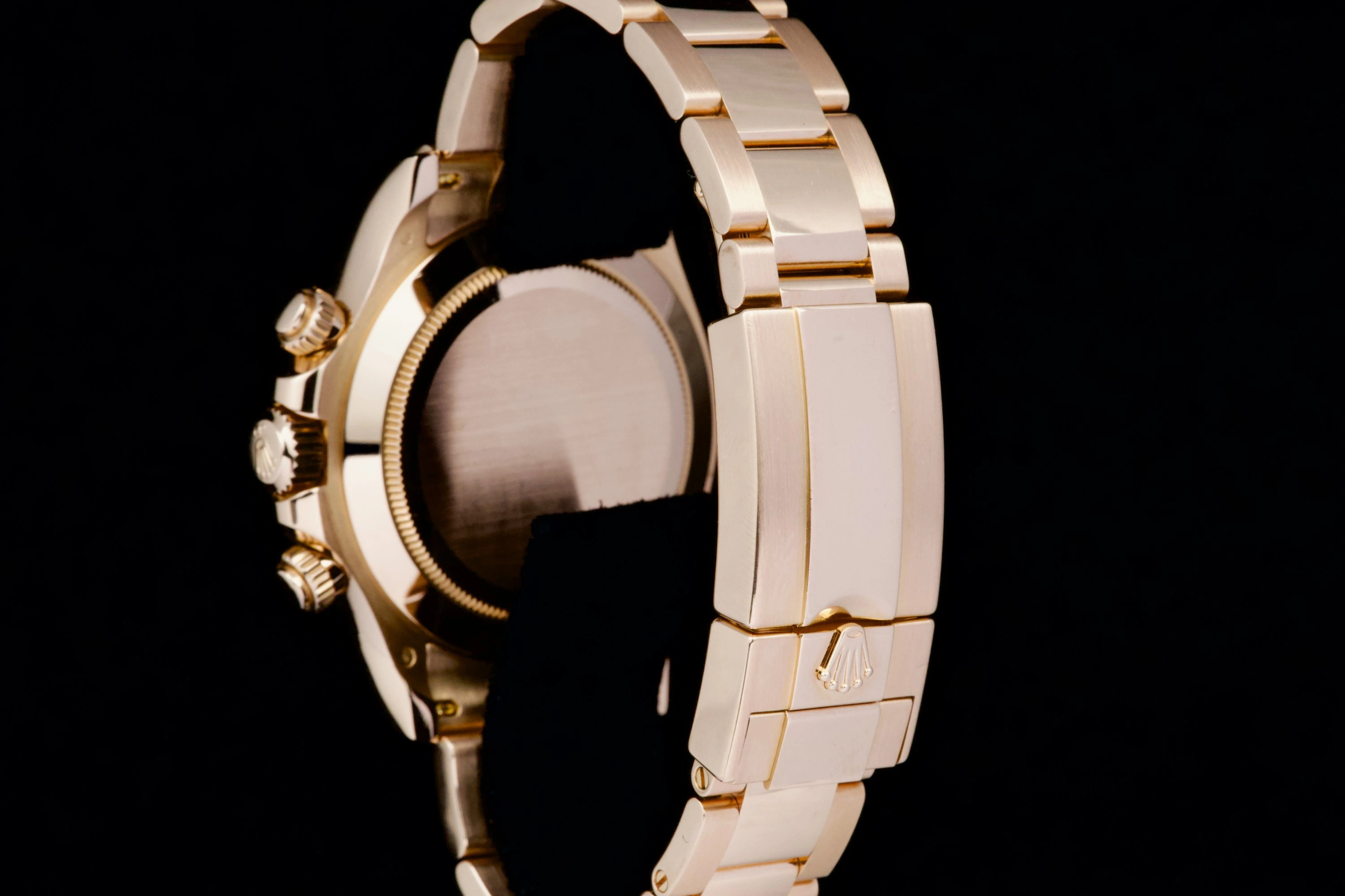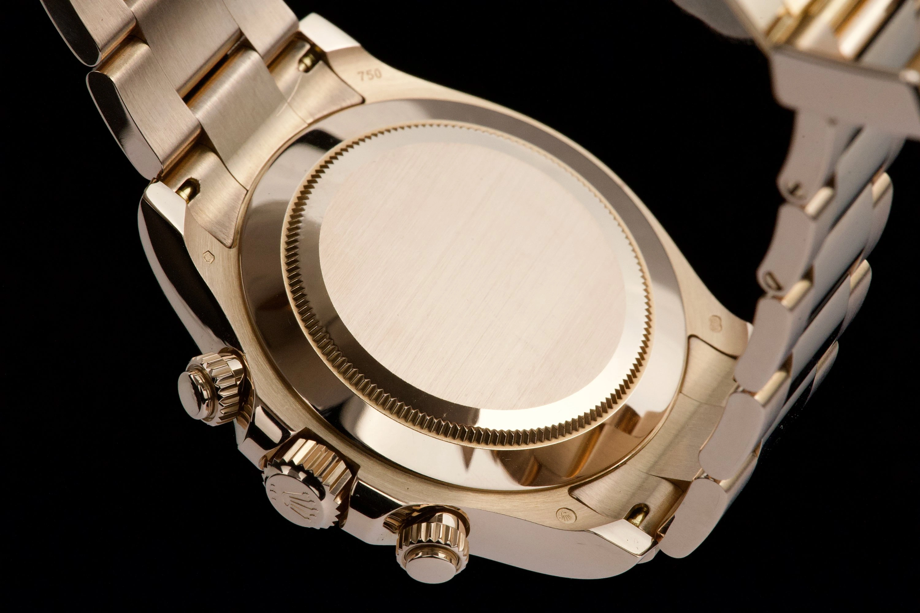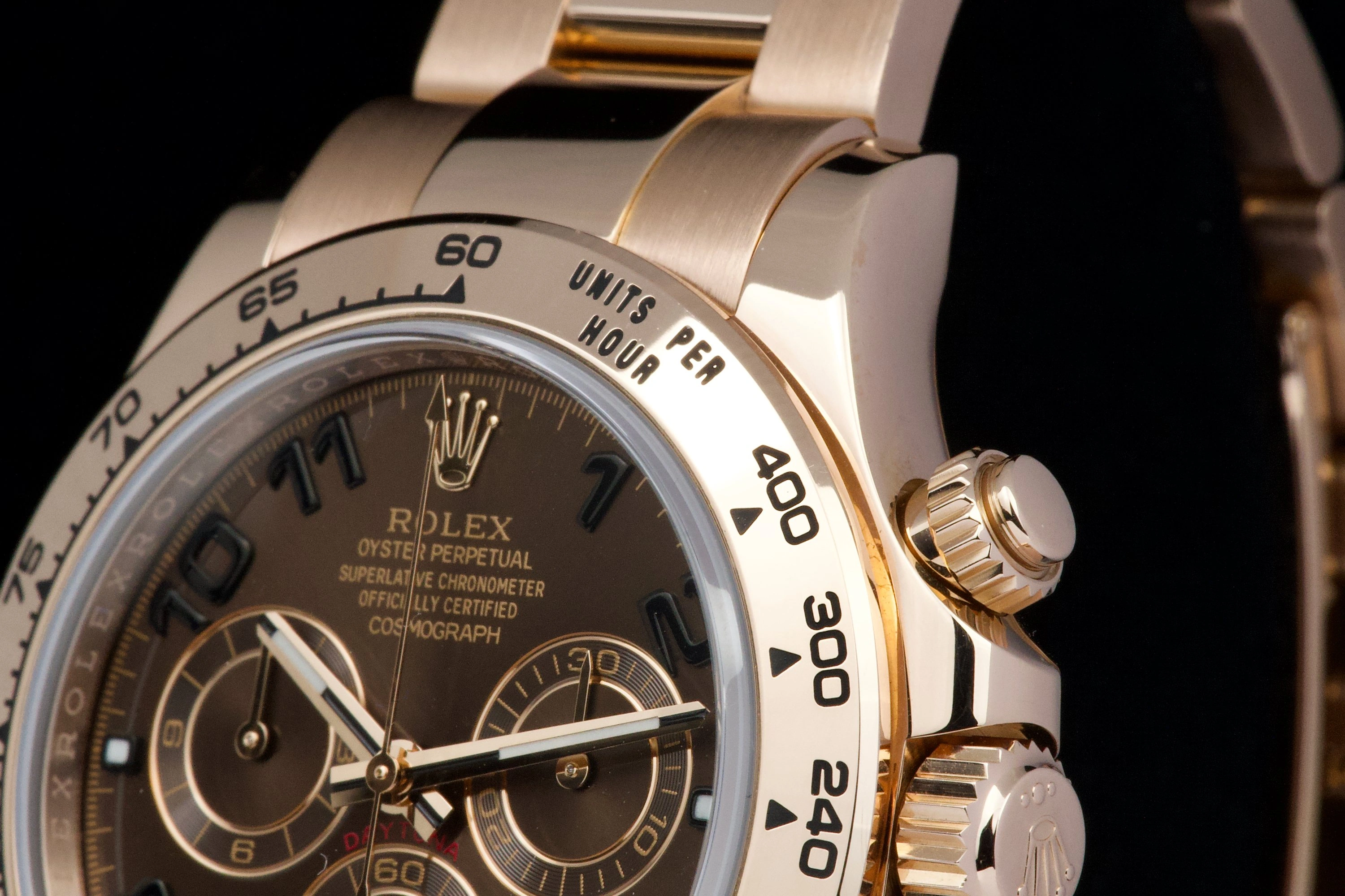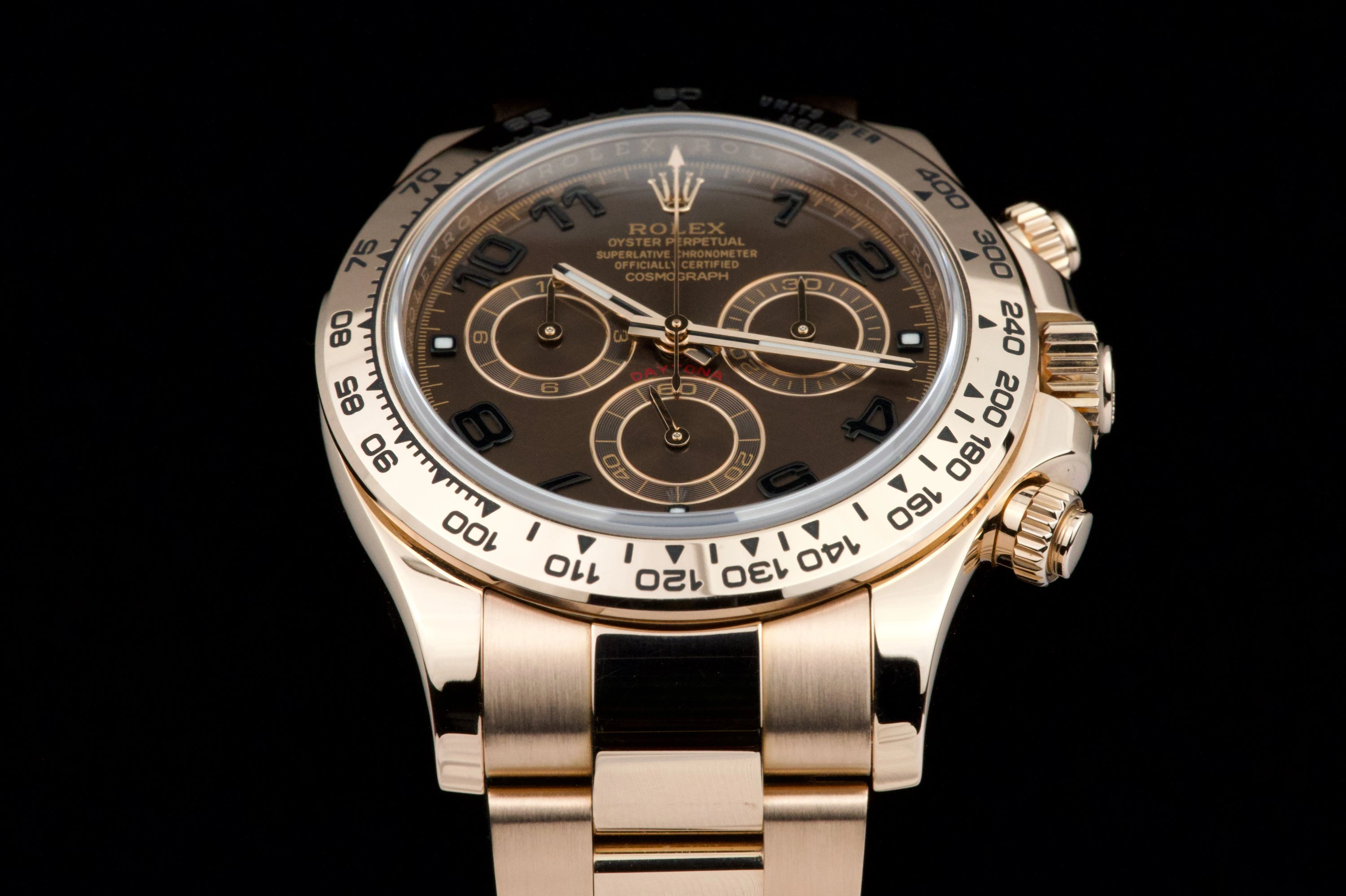 With its state-of-the-art technology, evocative heritage and sporting aura, the Oyster Perpetual Cosmograph Daytona swiftly became an iconic watch. Its dial carries in red letters the name “Daytona” – the most famous motor racing circuit in the United States. Available in 904 L steel, 18 ct gold and Rolesor versions with a variety of dials, robust Oyster bracelets as well as elegant straps both equipped with high security Oysterlock clasps, the Cosmograph Daytona is tailored for the track and the concert hall. Reference 116505-0004 has an Everose case and bracelet with a brown dial.