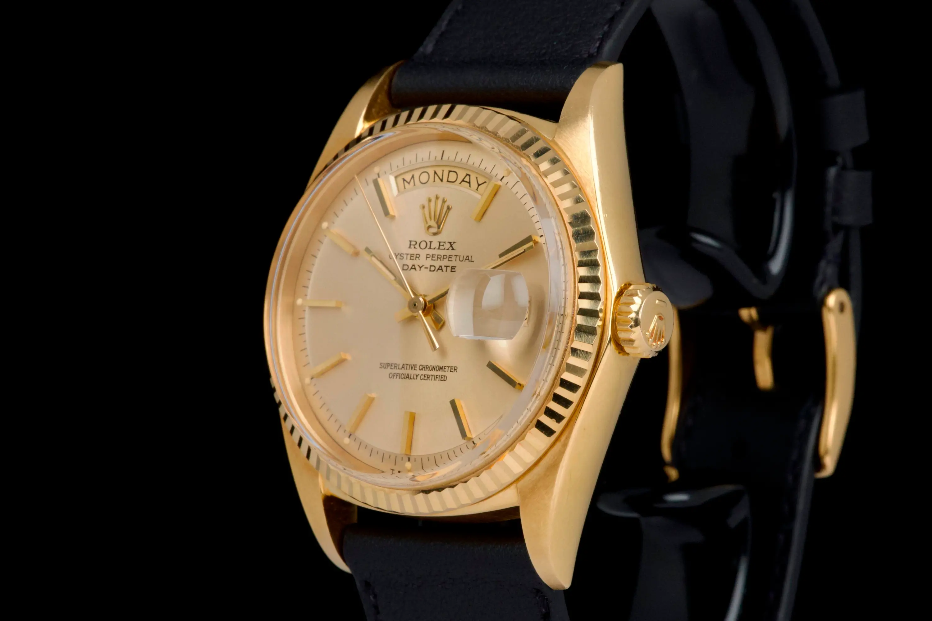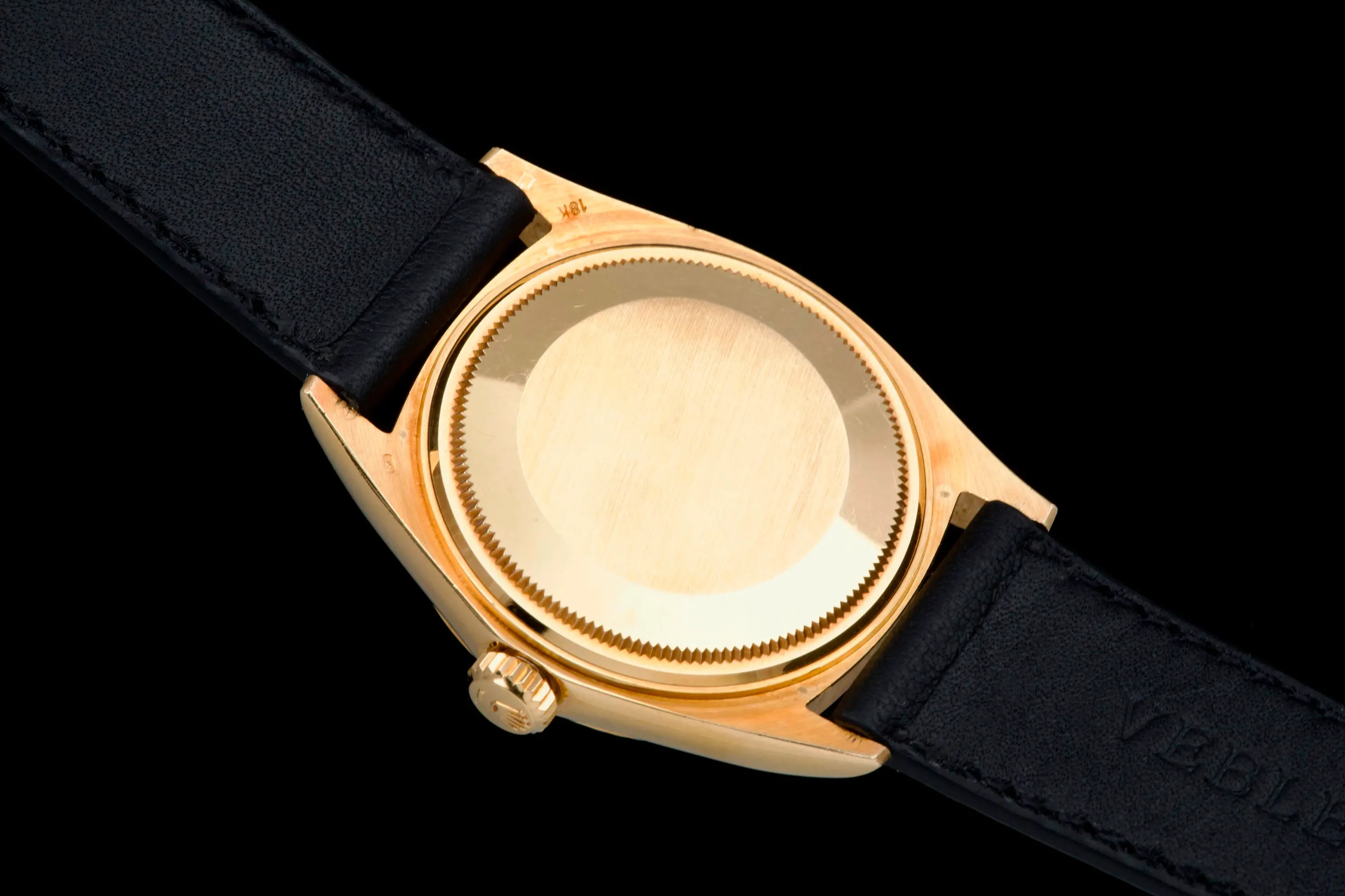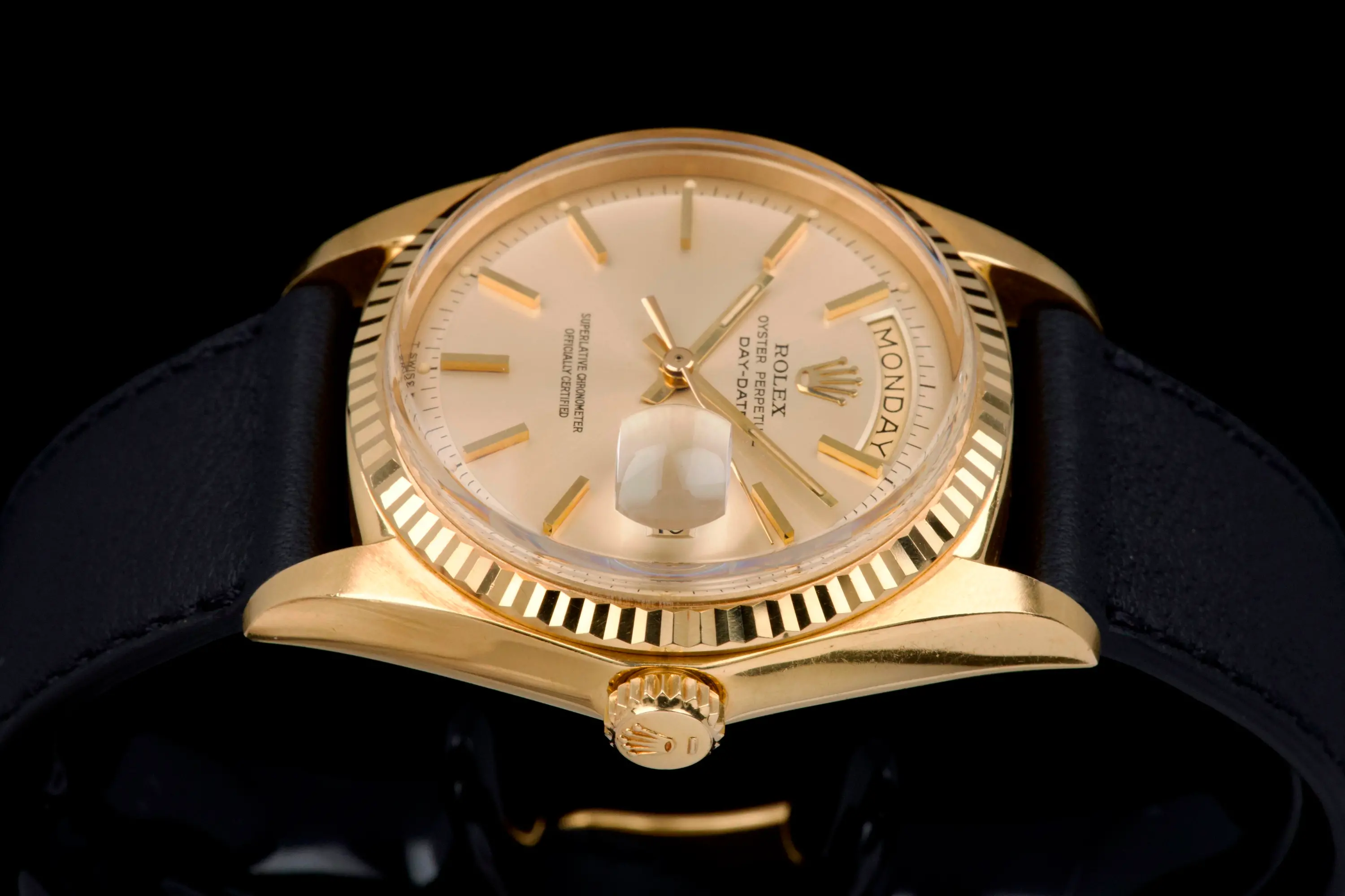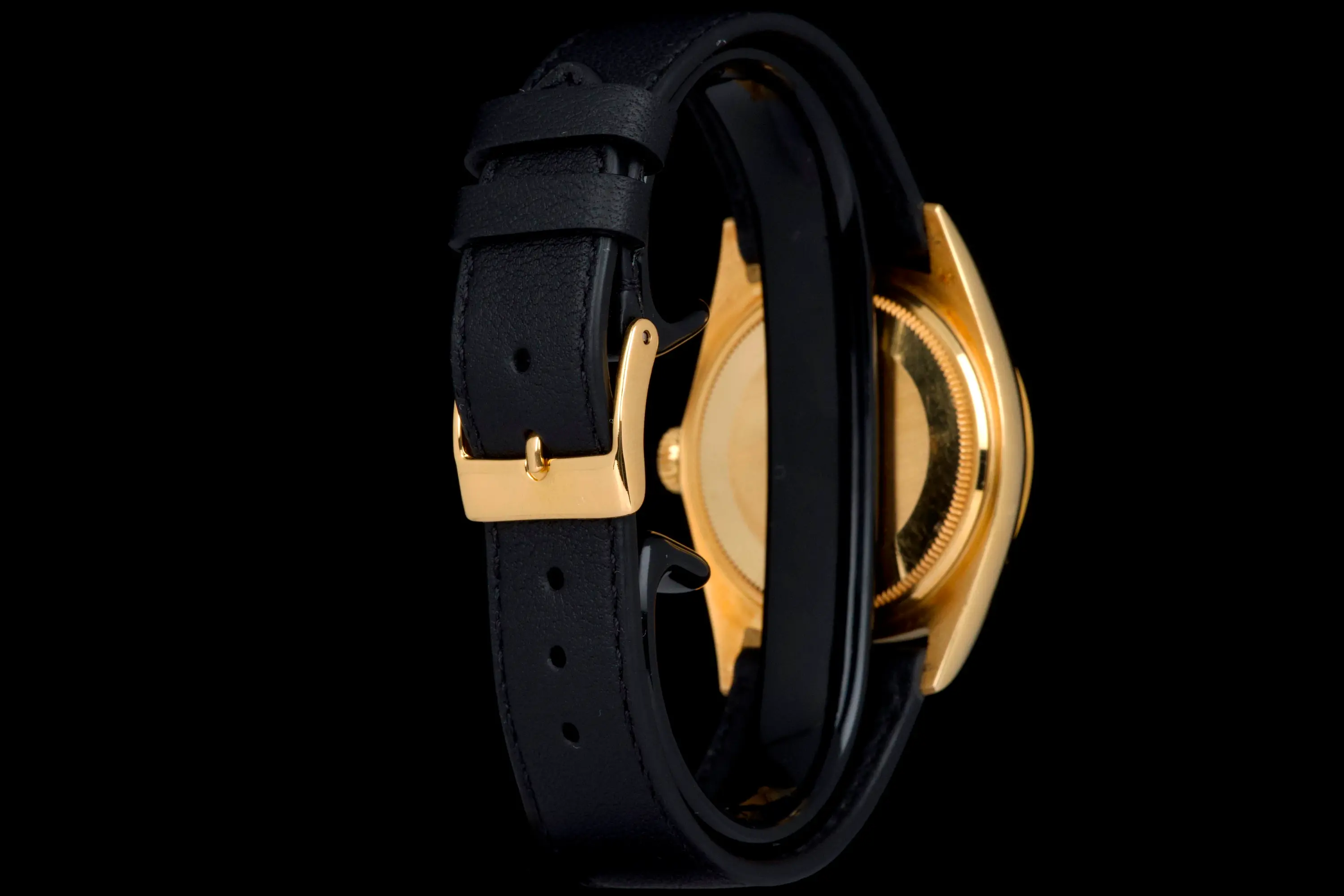 The watch is fitted with a new black leather strap and a gold-tone buckle (non-Rolex).