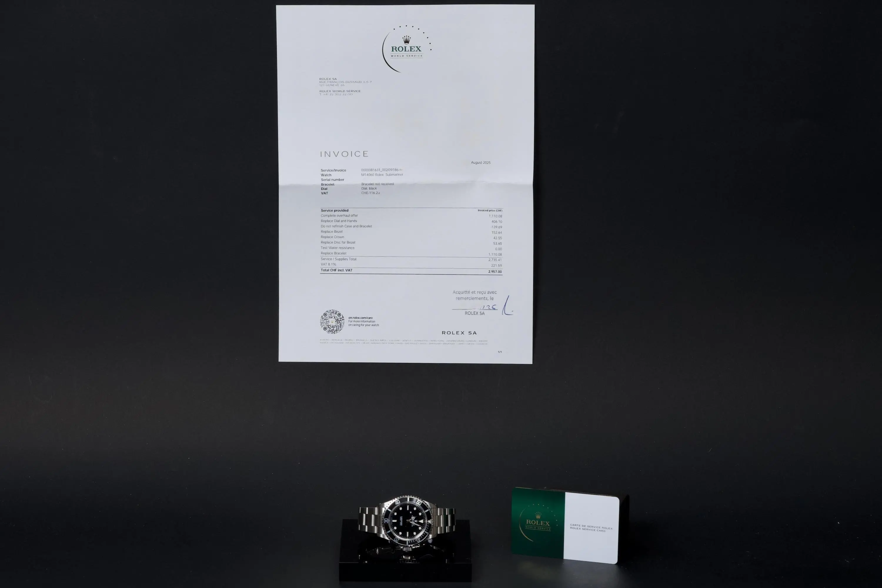 The timepiece underwent a complete service at Rolex in 2025, including a full overhaul of the movement, replacement of the dial, replacement of the hands, replacement of the bezel