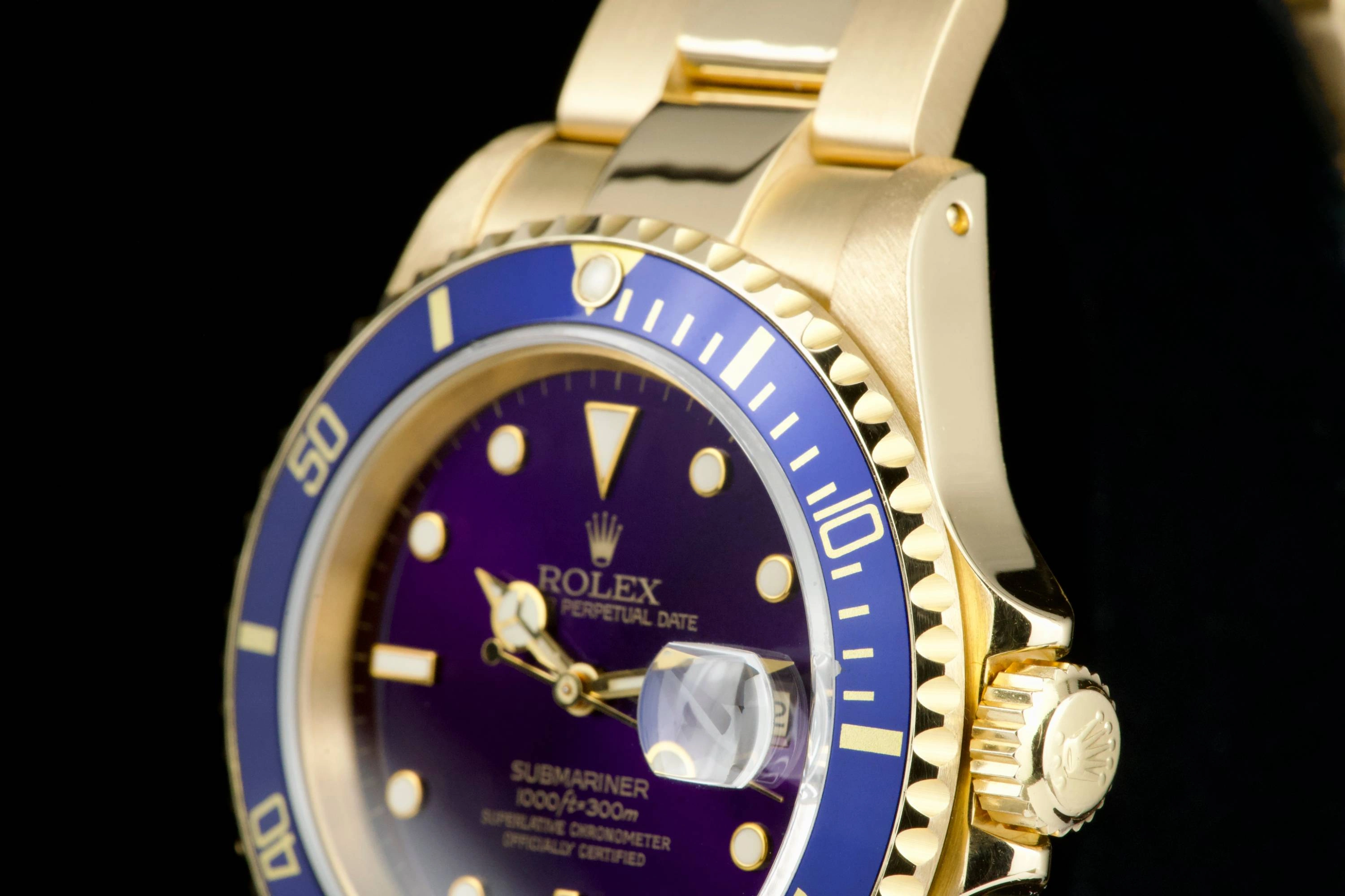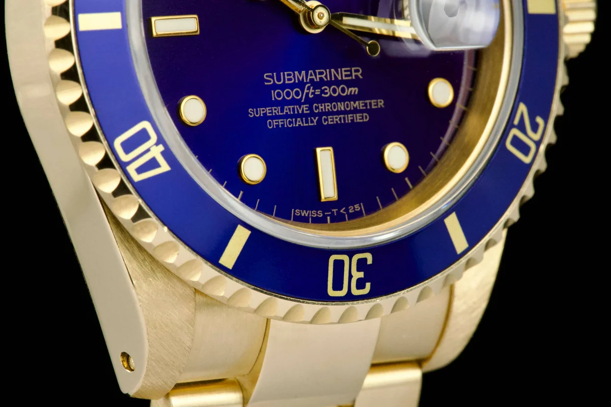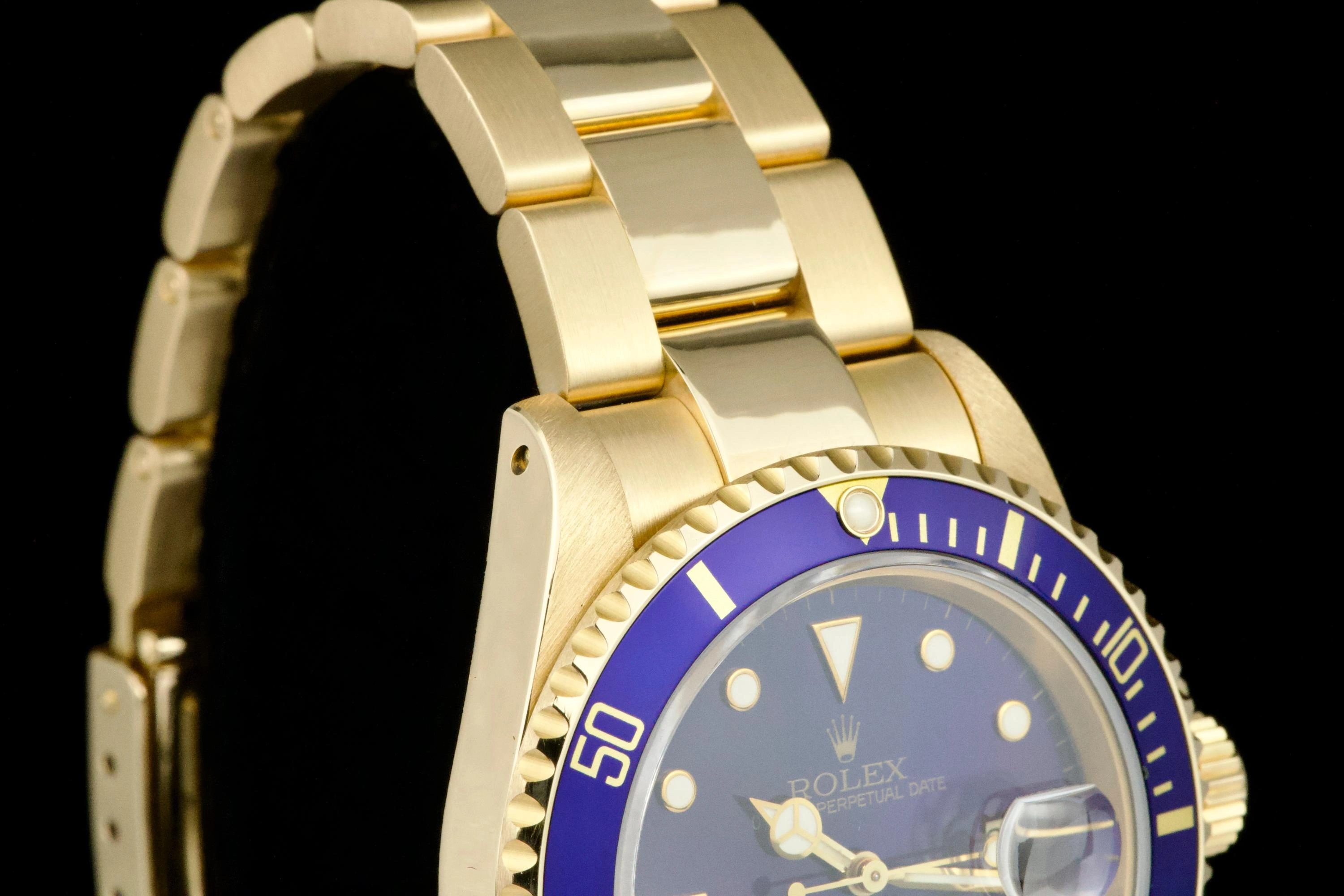 Rolex Submariner Date 40 Ref. 16618 has a yellow gold case and a matching bracelet. In the present configuration it has a blue dial and a matching bezel.