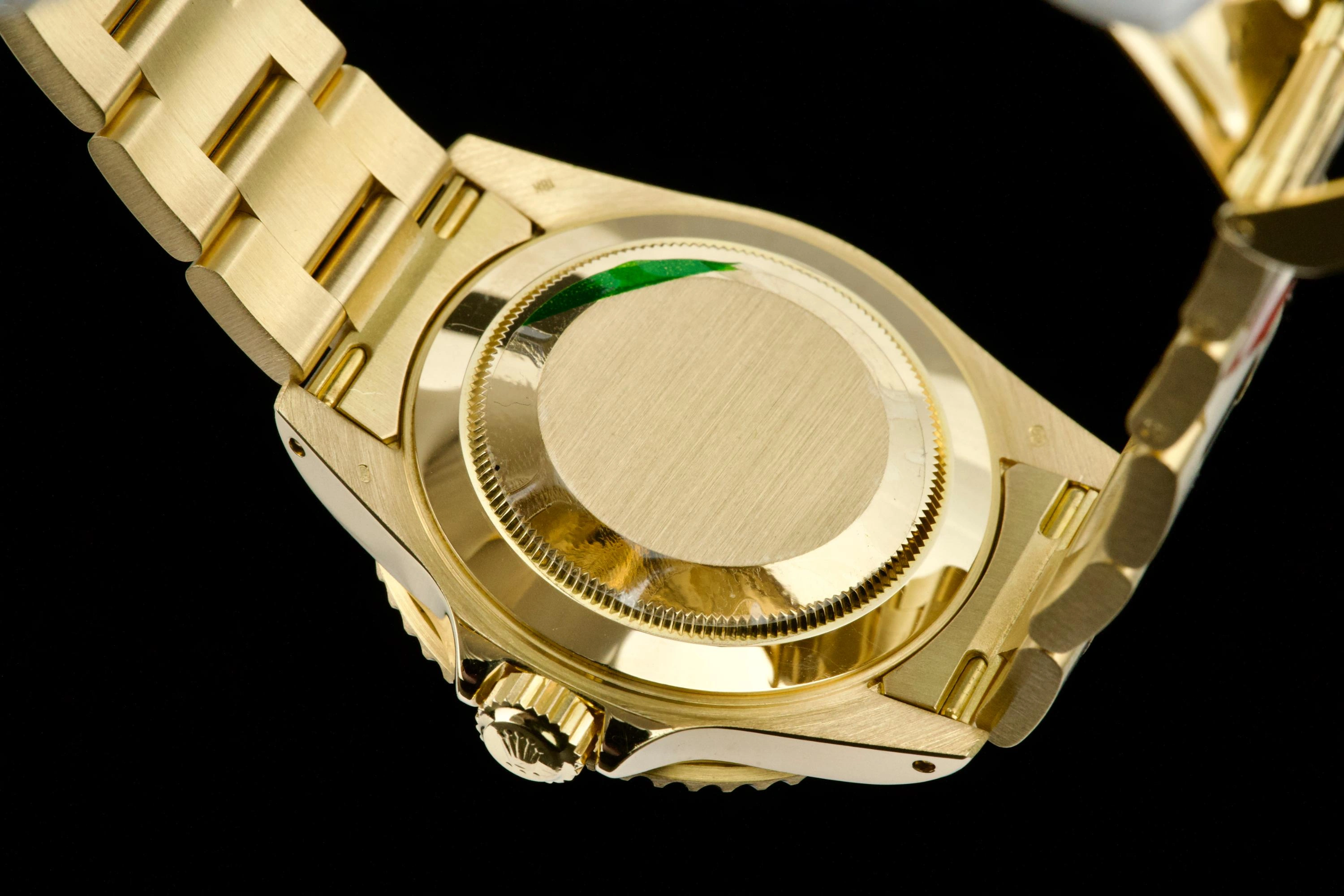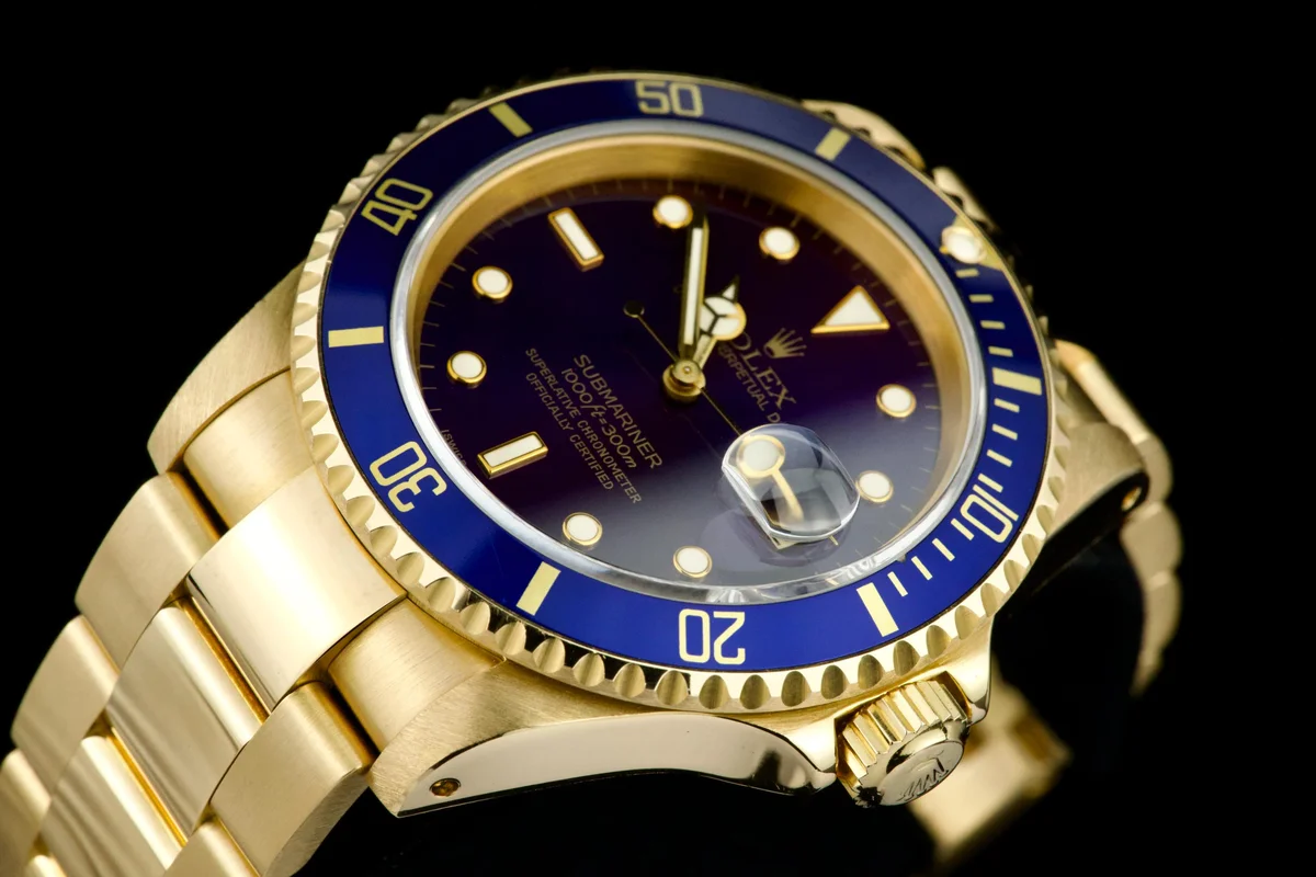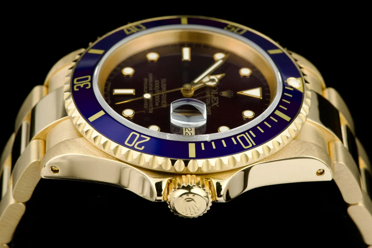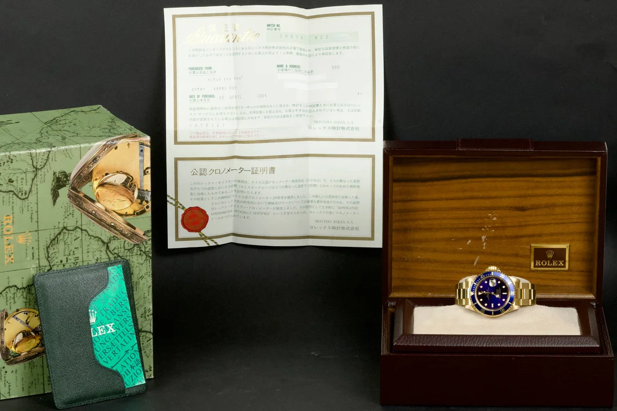 Rolex Submariner Date 40 Ref. 16618 has a yellow gold case and a matching bracelet. In the present configuration it has a blue dial and a matching bezel.