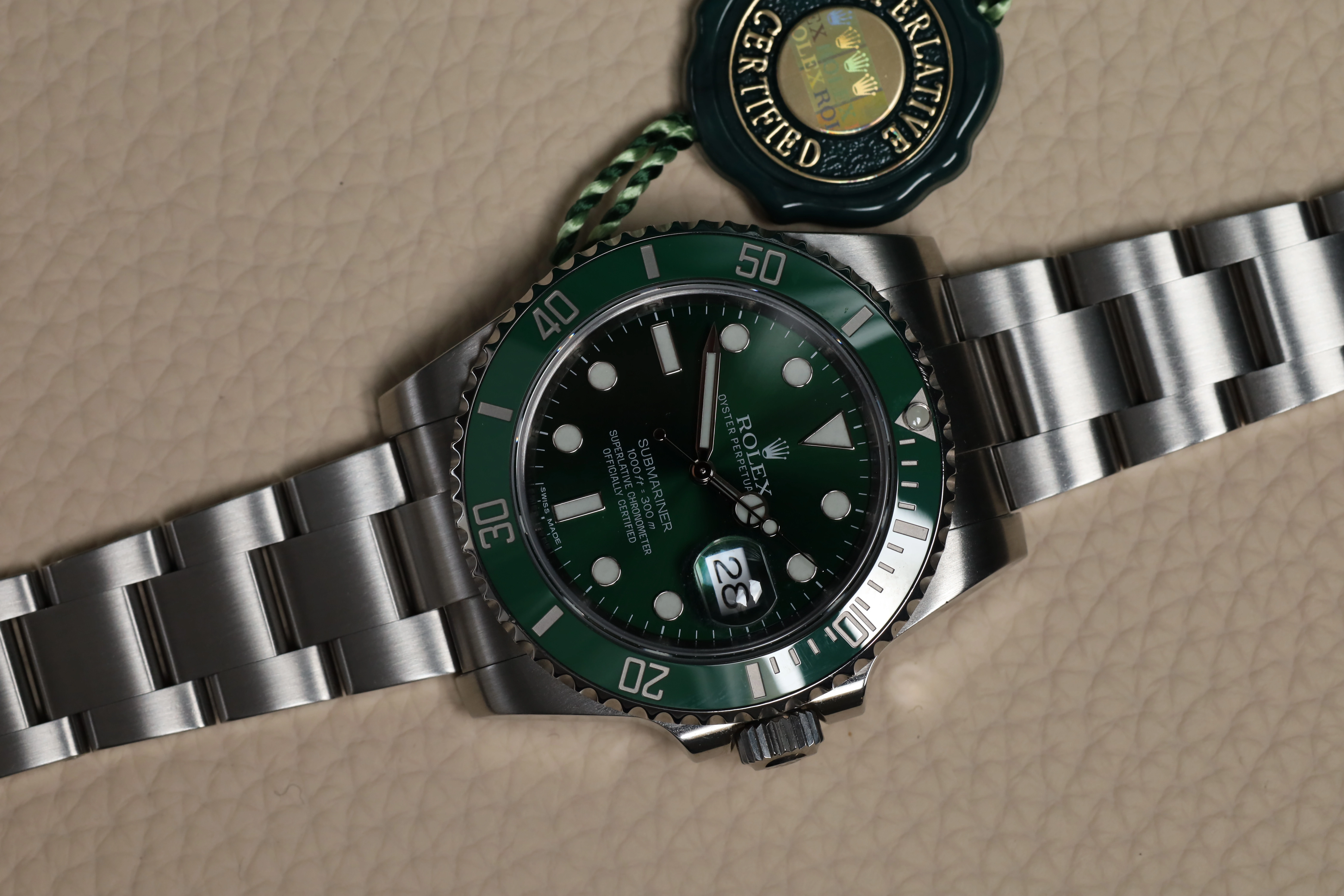 Introduced at BaselWorld 2010, the Rolex Submariner Date 116610lv-0002 extends the green theme of the 2003 16610LV to the dial, earning this watch the nickname 'Hulk'. The stainless steel case of 40mm is fitted with a ceramic bezel inlay.