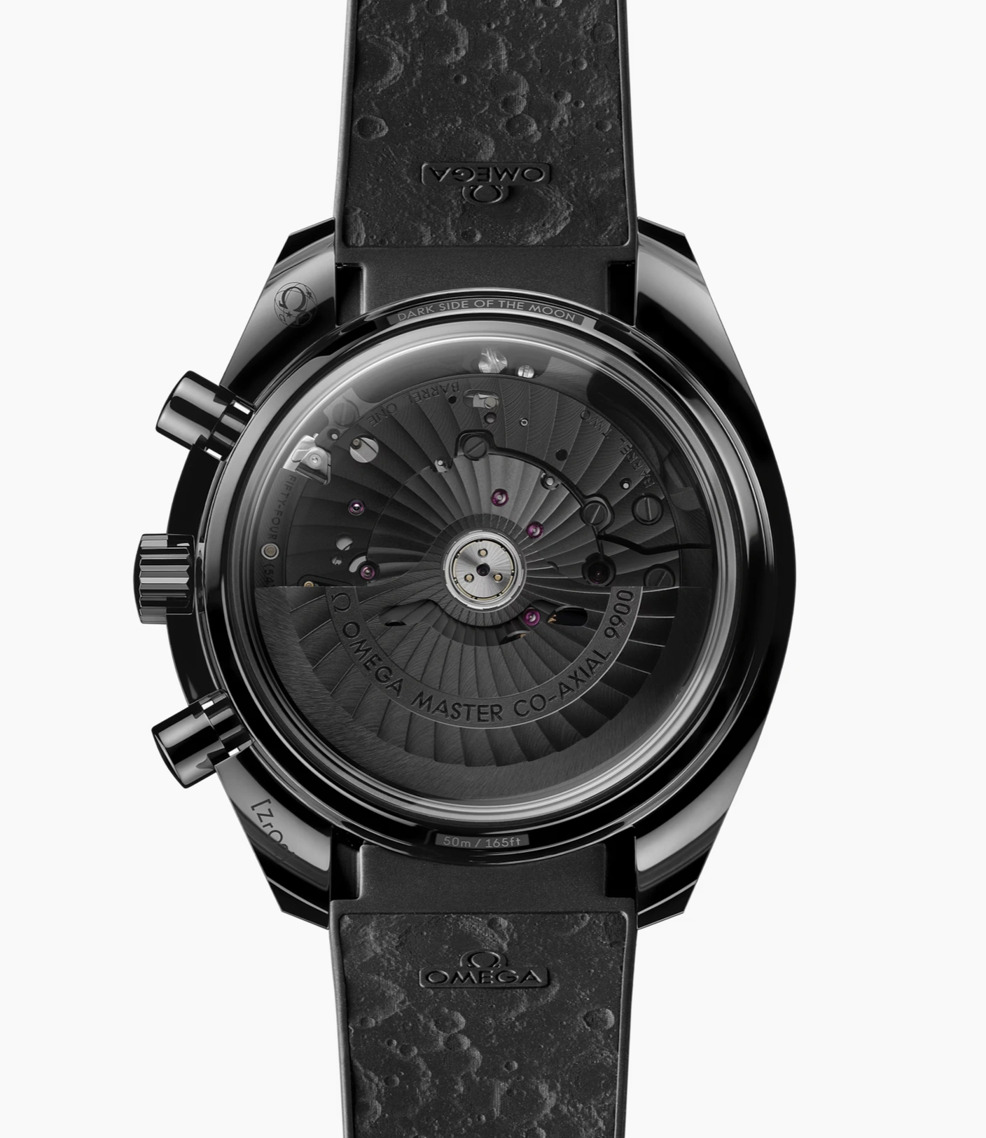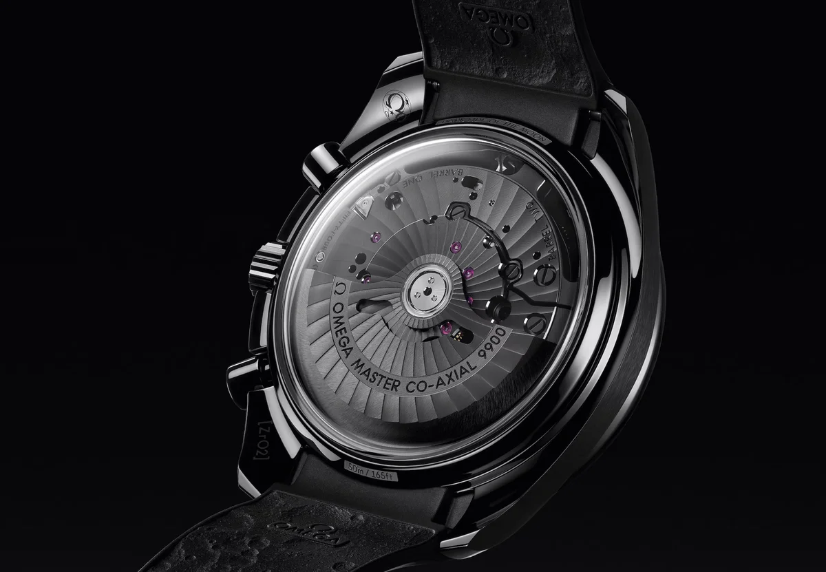 The Omega Speedmaster Dark Side of the Moon 310.92.44.51.01.005 debuted in 2025. Its 44.25 mm case in black ceramic, measuring 15.09 mm in thickness. The black ceramic bezel carries a tachymeter scale in Liquidmetal. Both front and back are fitted with sapphire crystals, and water resistance is rated at 50 meters. The polished ceramic dial presents a tricompax layout with small seconds at 9 o’clock, a combined 60-minute and 12-hour recorder at 3 o’clock, and a date aperture at 6 o’clock. Inside ticks the self-winding 9900, a column-wheel Co-Axial Master Chronometer chronograph certified by METAS and resistant to magnetic fields up to 15,000 gauss.