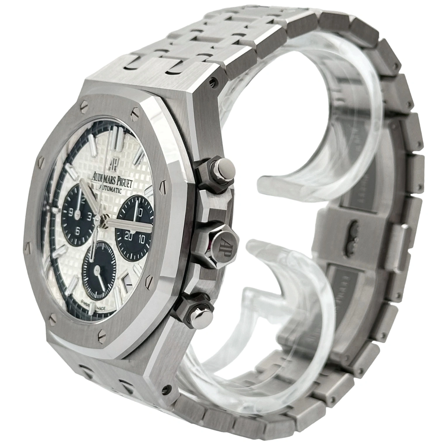 The Royal Oak Chronograph 38 was introduced in 2019, as an smaller alternative to the 2012 Chronograph 41. It is powered by caliber 2385. Reference 26315ST.OO.1256ST.01 has a stainless steel case and a silver dial with blue accents.