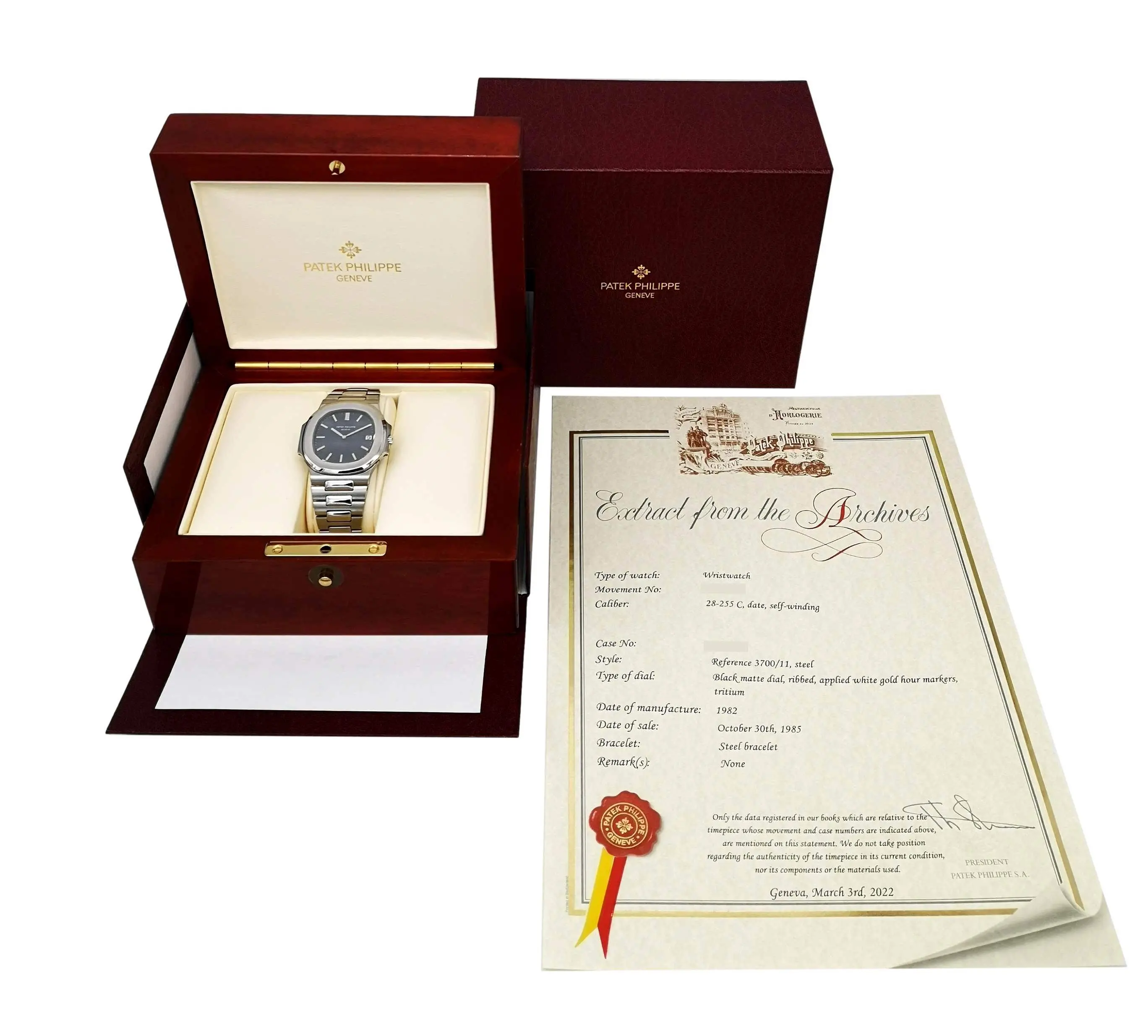 with box and "Extract from the Archives 2022". Date of manufacture 1982, date of sale 1985