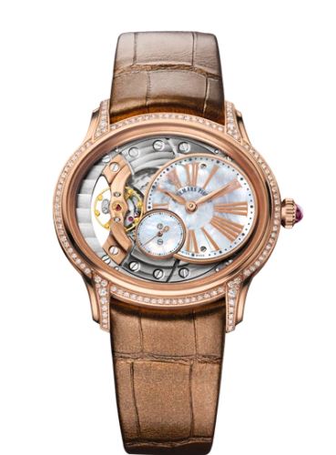 Hand-wound watch with small seconds. It has a 18-carat pink gold case, a diamond-set bezel and lugs and the crown is set with a pink cabochon sapphire. White mother-of-pearl dial, pink gold hands. 116 brilliant-cut diamonds ; ~0.60 carats Reference 77247BC.ZZ.A813CR.01 has a white mother of pearl dial and is fitted a brown alligator strap